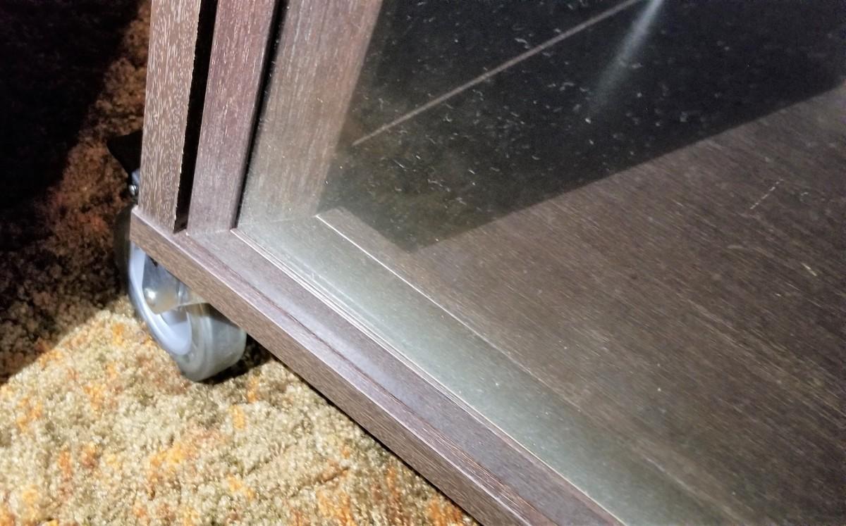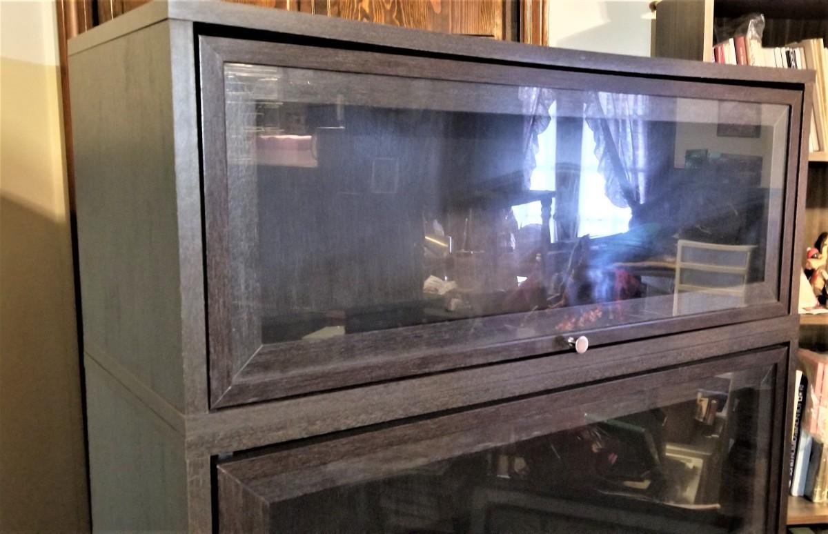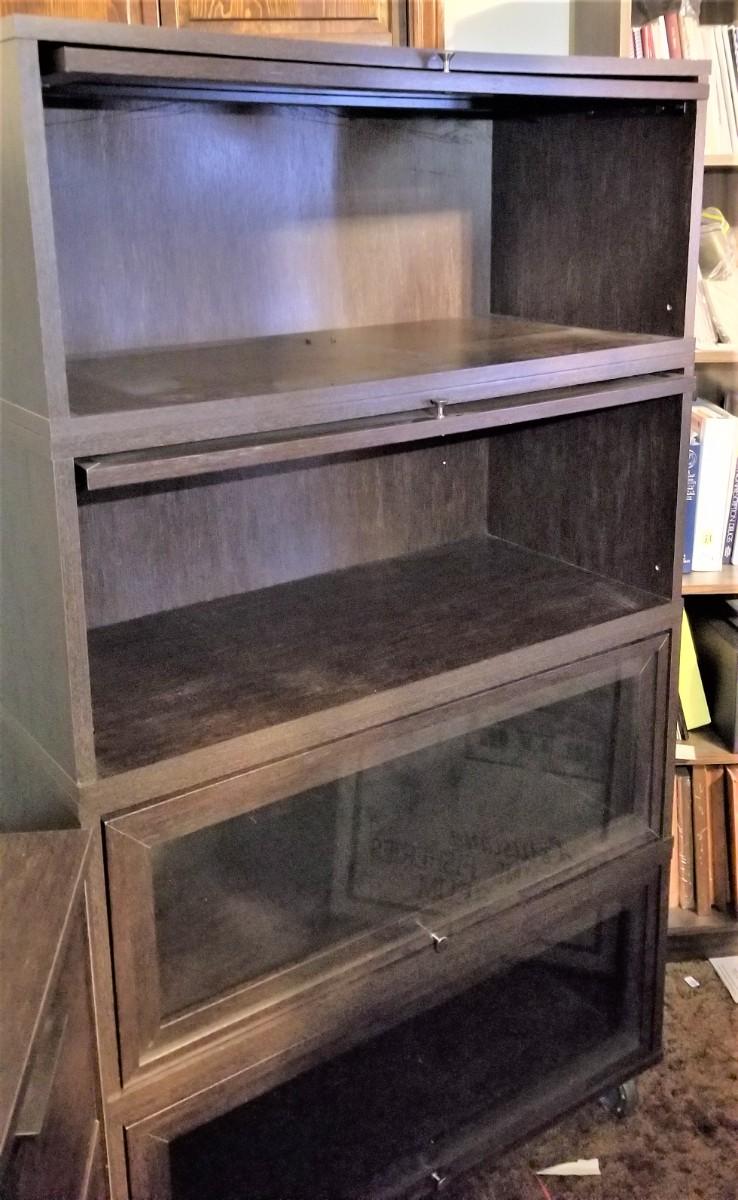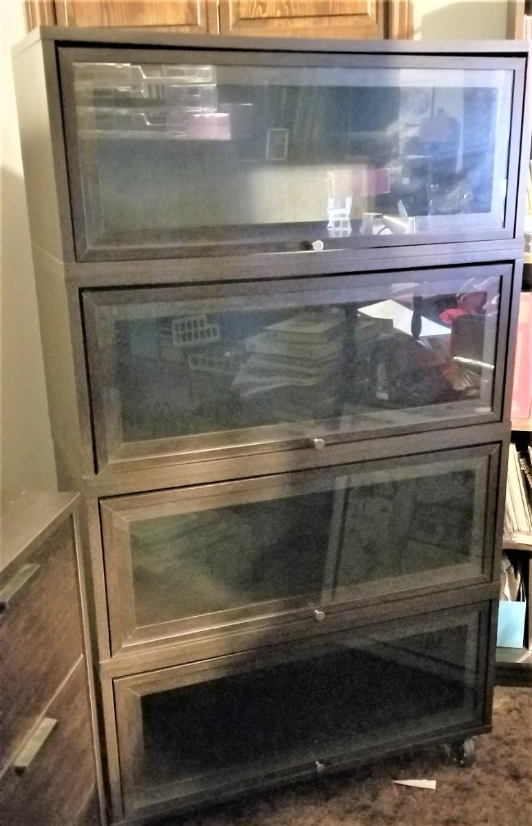 Contemporary Barrister Style Bookcase - Glass fronts, 4 shelves. 35" across, 16" deep, 62.5" tall. Large casters for rolling. Used condition. Note: this is upstairs and you will have to move/load it yourself.