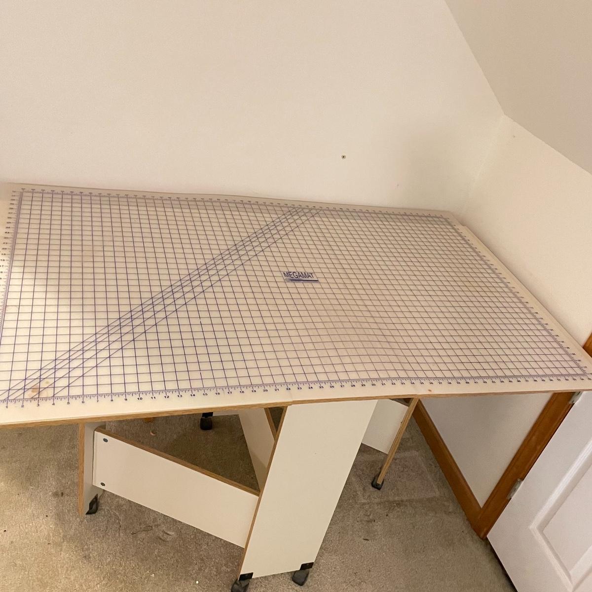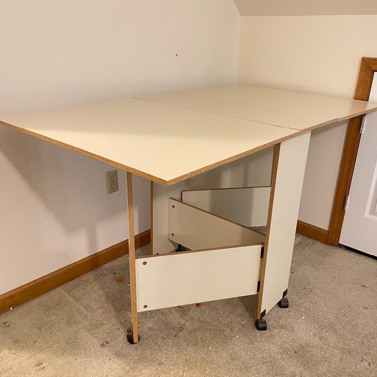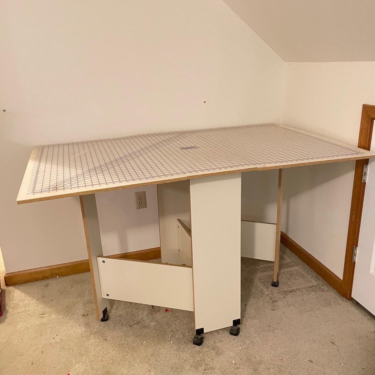 Popular choice here! A drop leaf crafting table crafted with pressed wood. Table measures 13” x 32” x 34” and expands from 13” to 60” easily with rolling legs. The Megamat is nice craftsmanship and is a bit bigger than the extended table, measuring 59” x 36”. See images. Local pick up only, please bring help to load, table is upstairs.