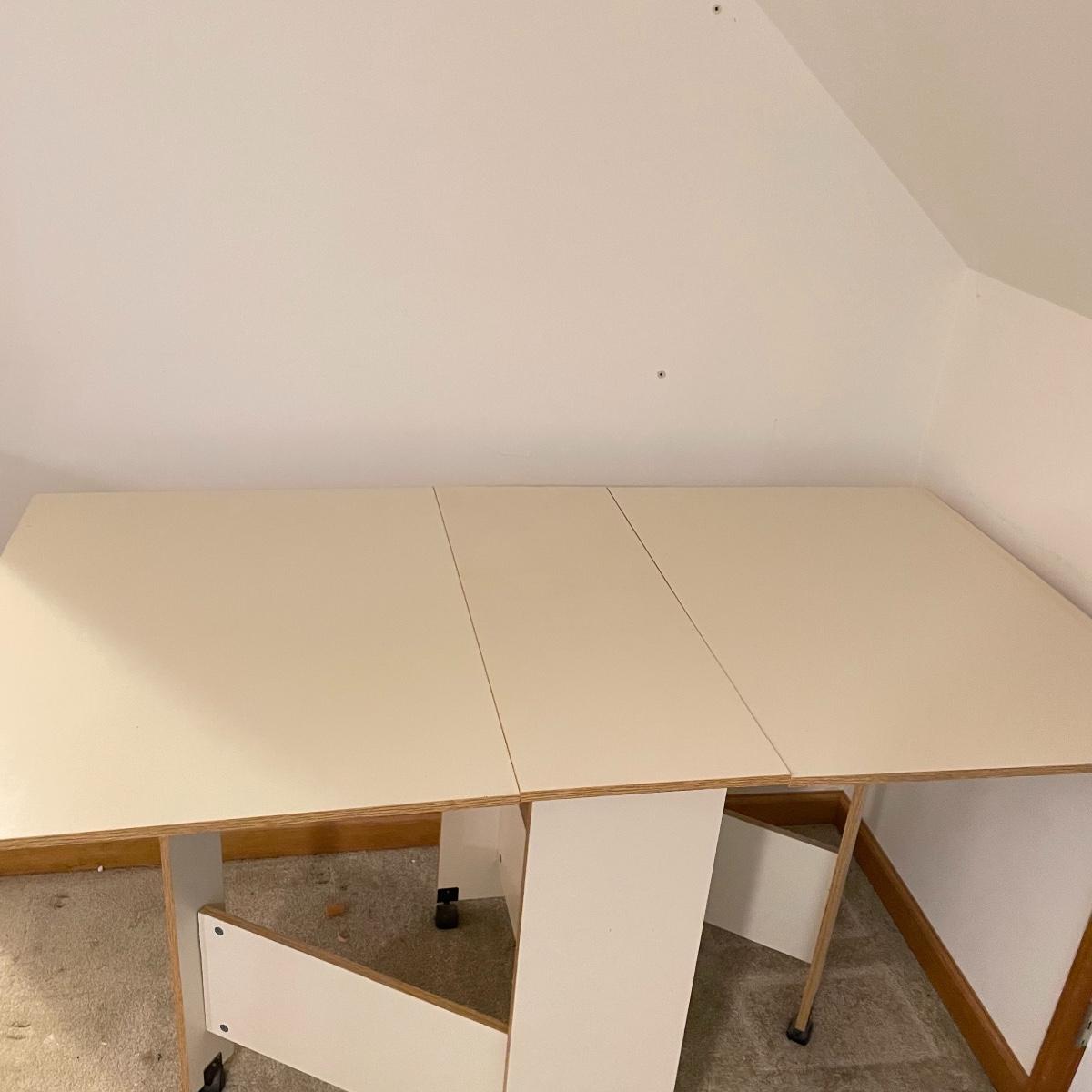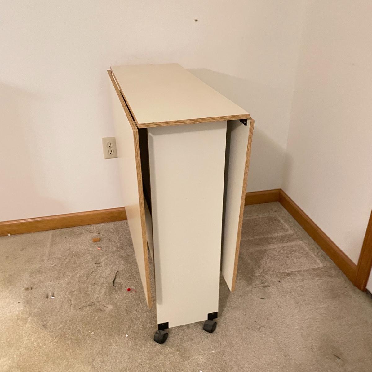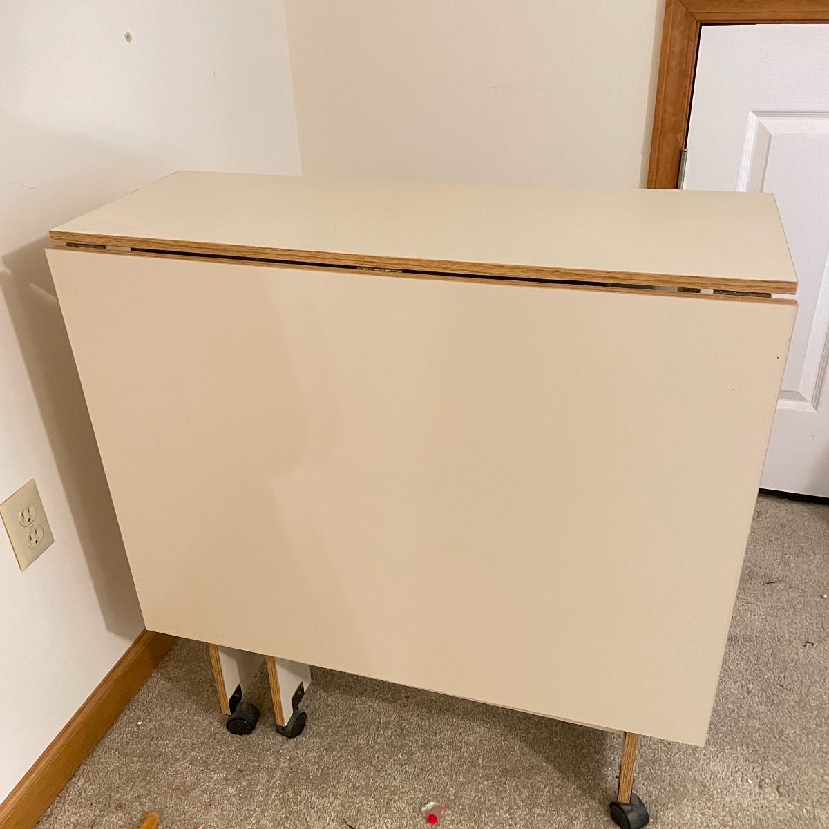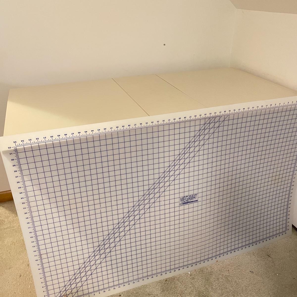 Popular choice here! A drop leaf crafting table crafted with pressed wood. Table measures 13” x 32” x 34” and expands from 13” to 60” easily with rolling legs. The Megamat is nice craftsmanship and is a bit bigger than the extended table, measuring 59” x 36”. See images. Local pick up only, please bring help to load, table is upstairs.