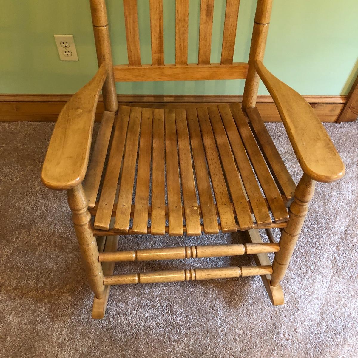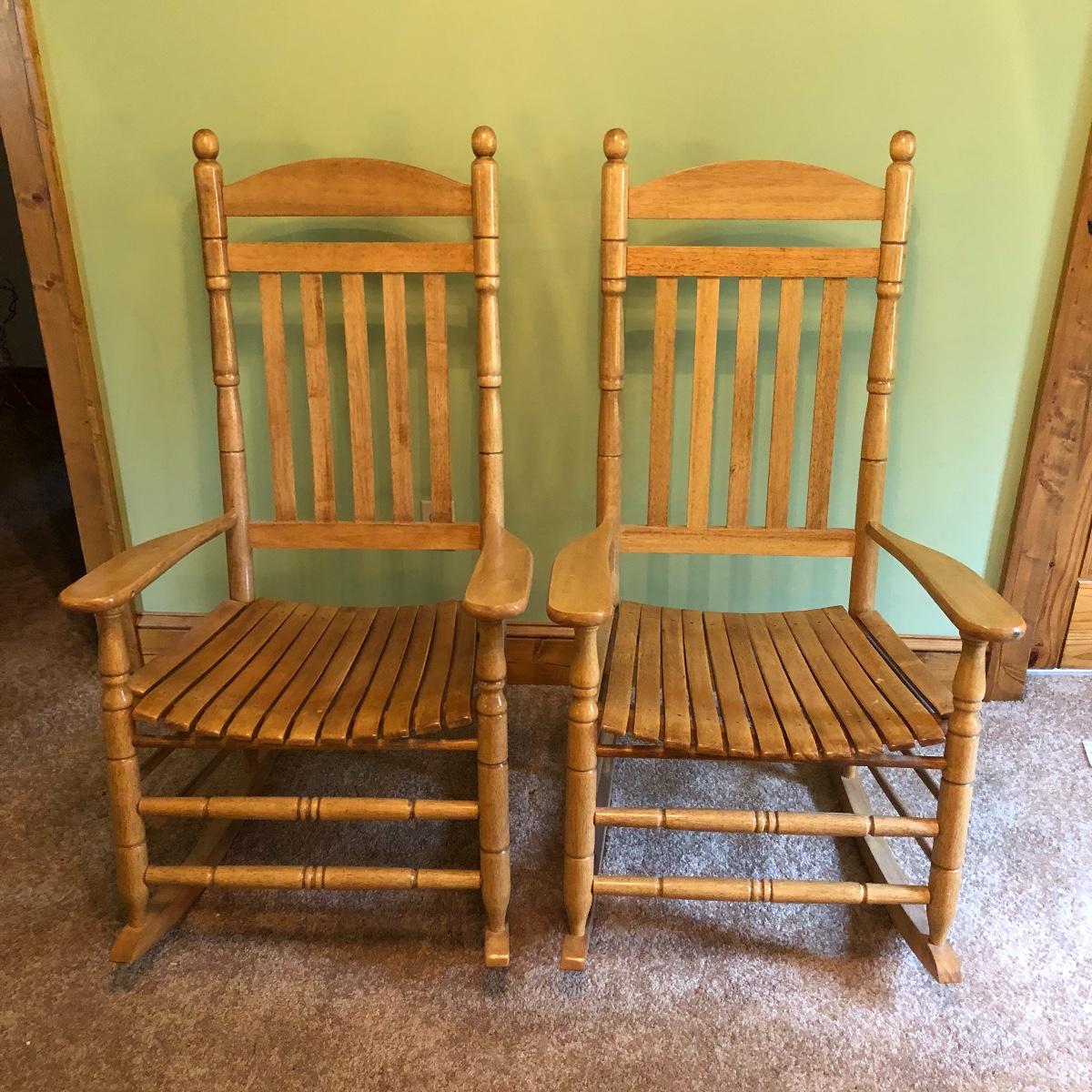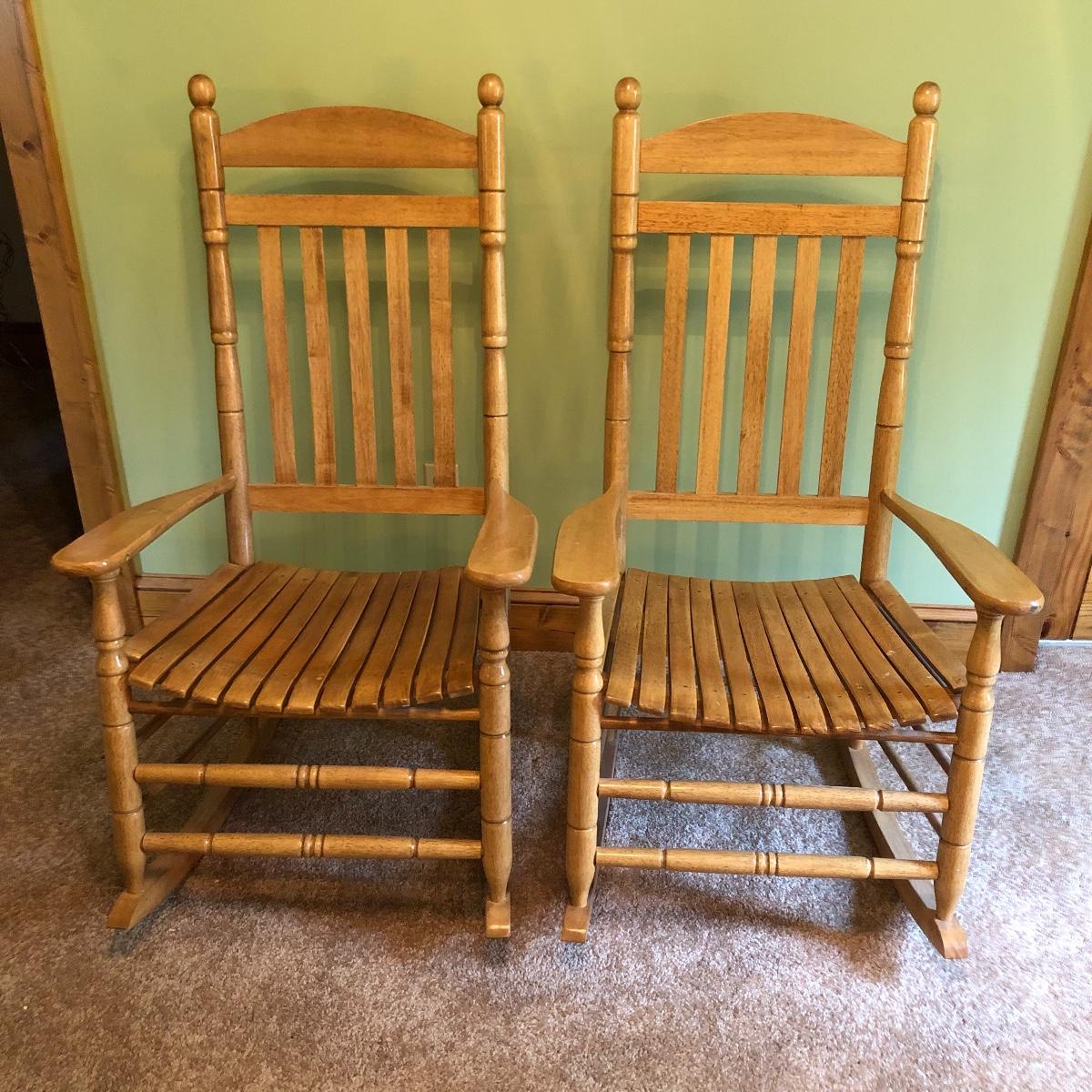 Sit back and sit a spell in these large wooden rocking chairs. Rocking Chairs are in excellent shape and appear to have lived their life indoors. Rockers measure 26” x 36” x 47” with a 18” seat height. Bring help as items are up one flight of stairs.
