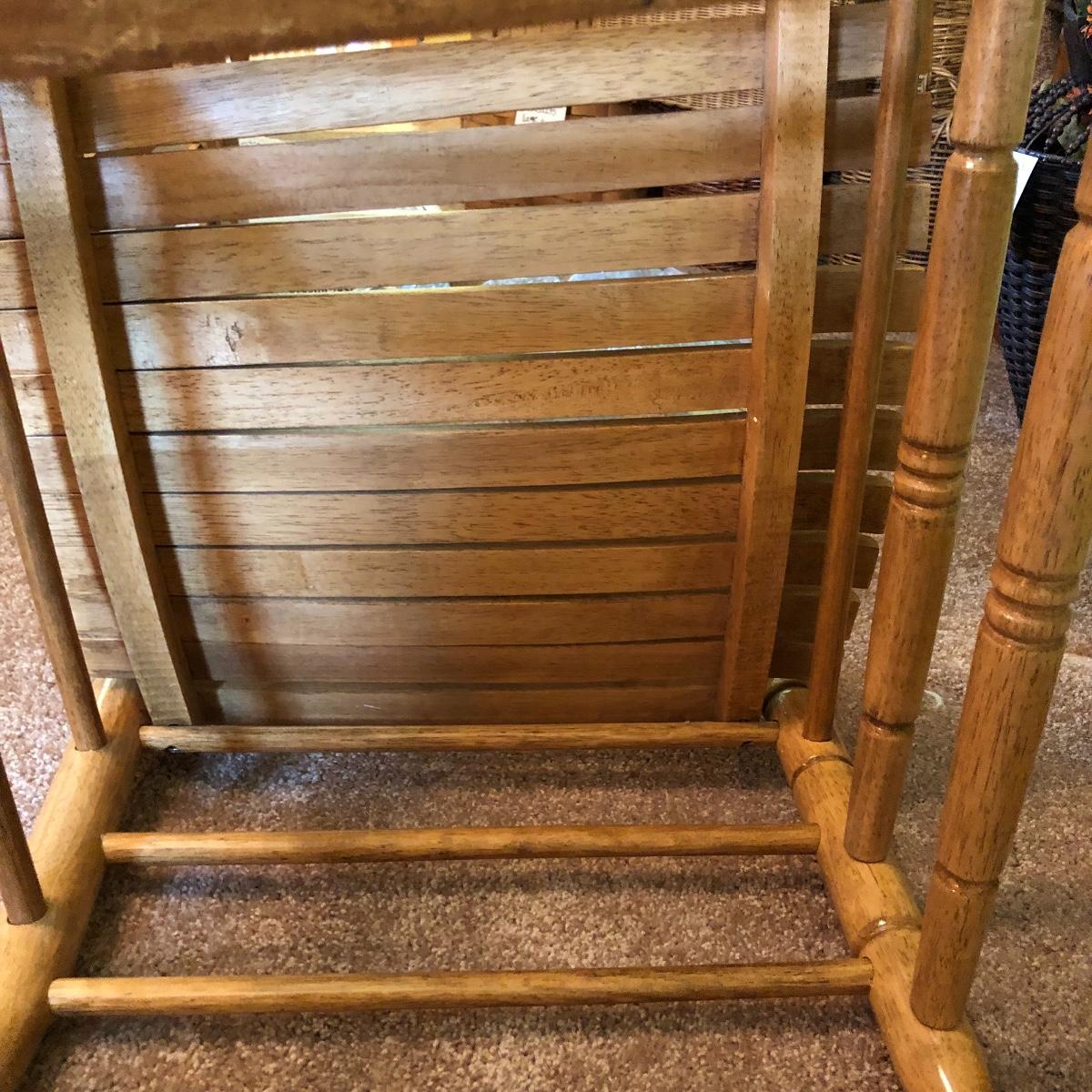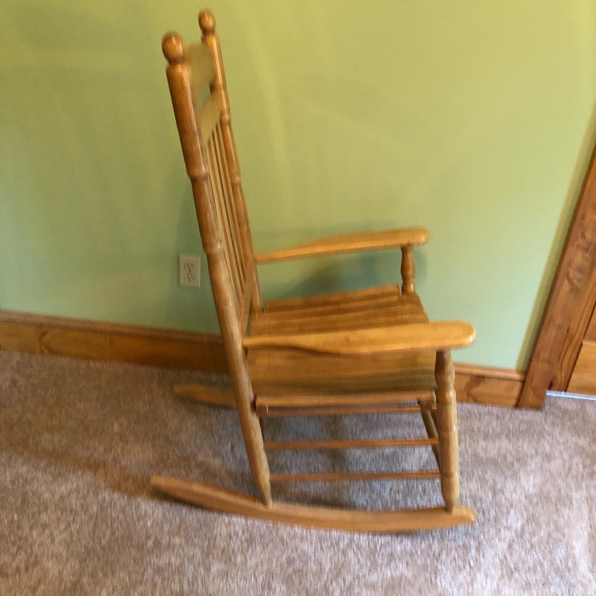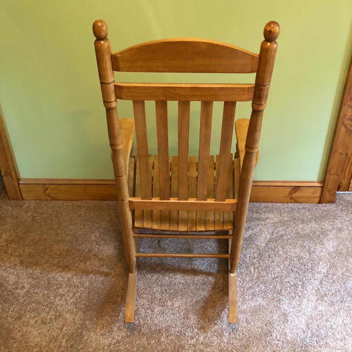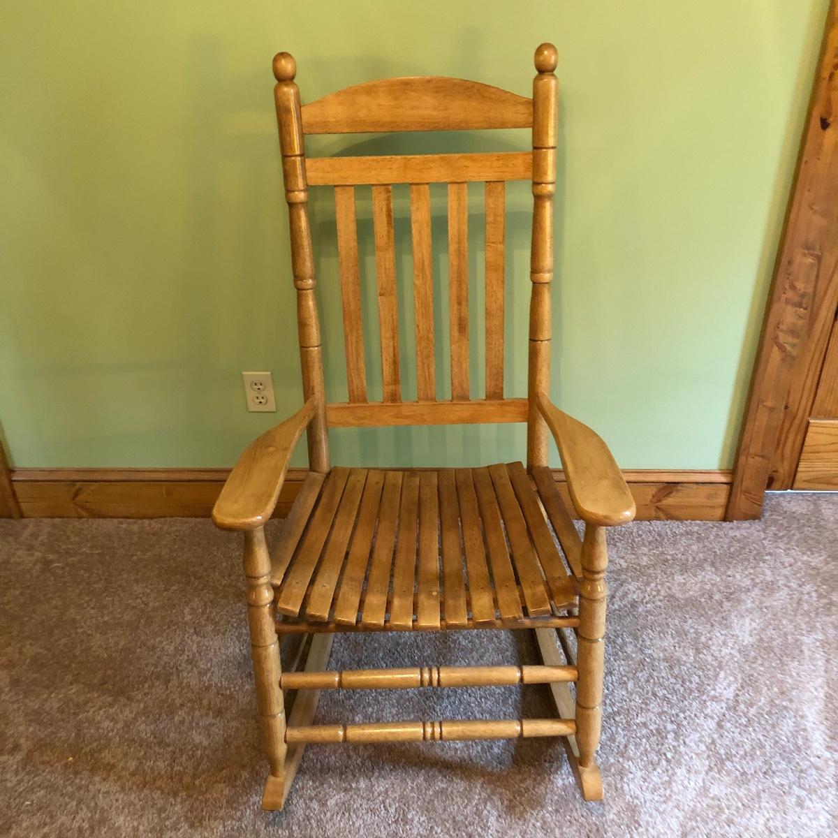 Sit back and sit a spell in these large wooden rocking chairs. Rocking Chairs are in excellent shape and appear to have lived their life indoors. Rockers measure 26” x 36” x 47” with a 18” seat height. Bring help as items are up one flight of stairs.