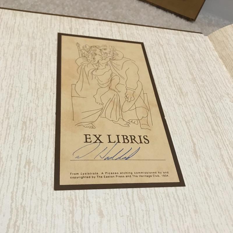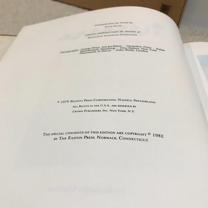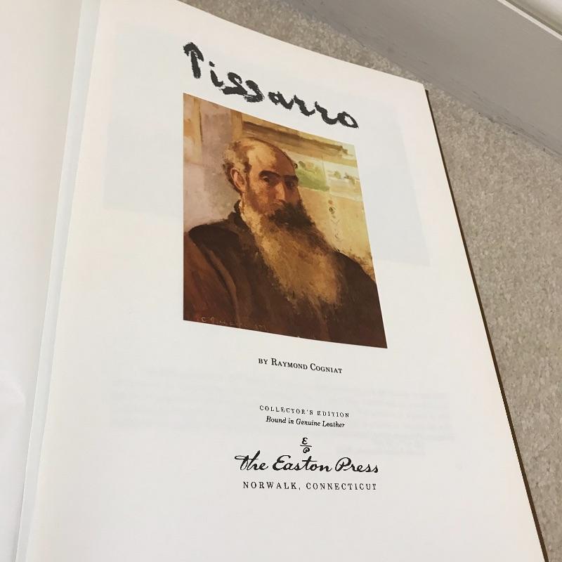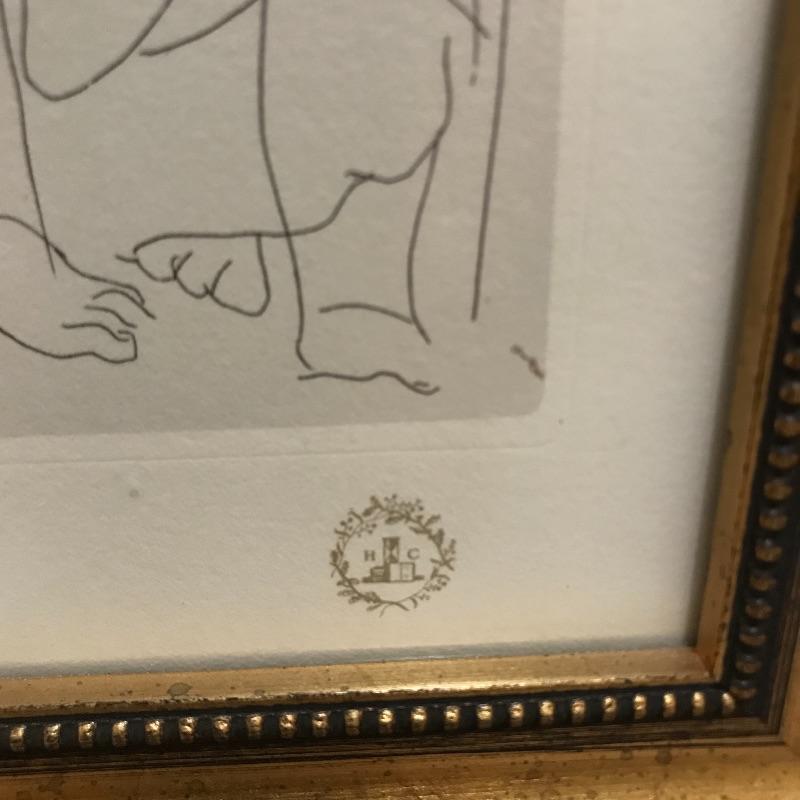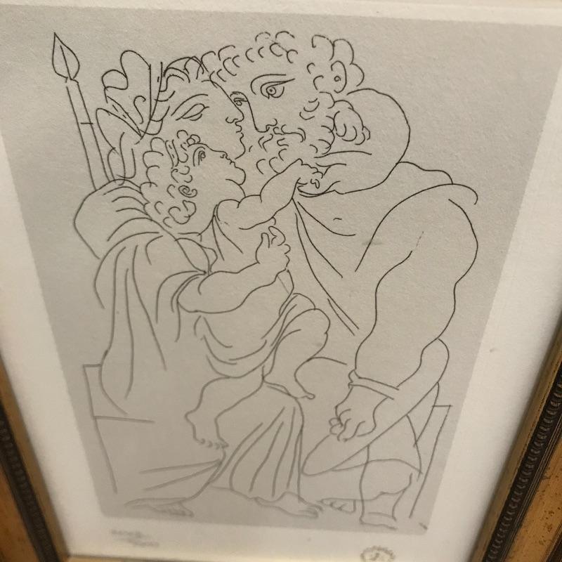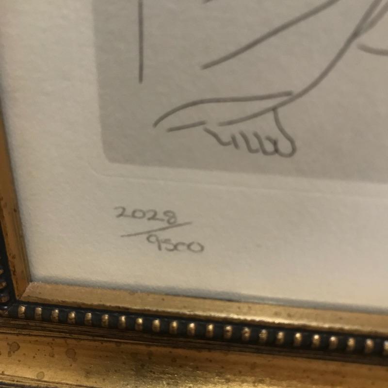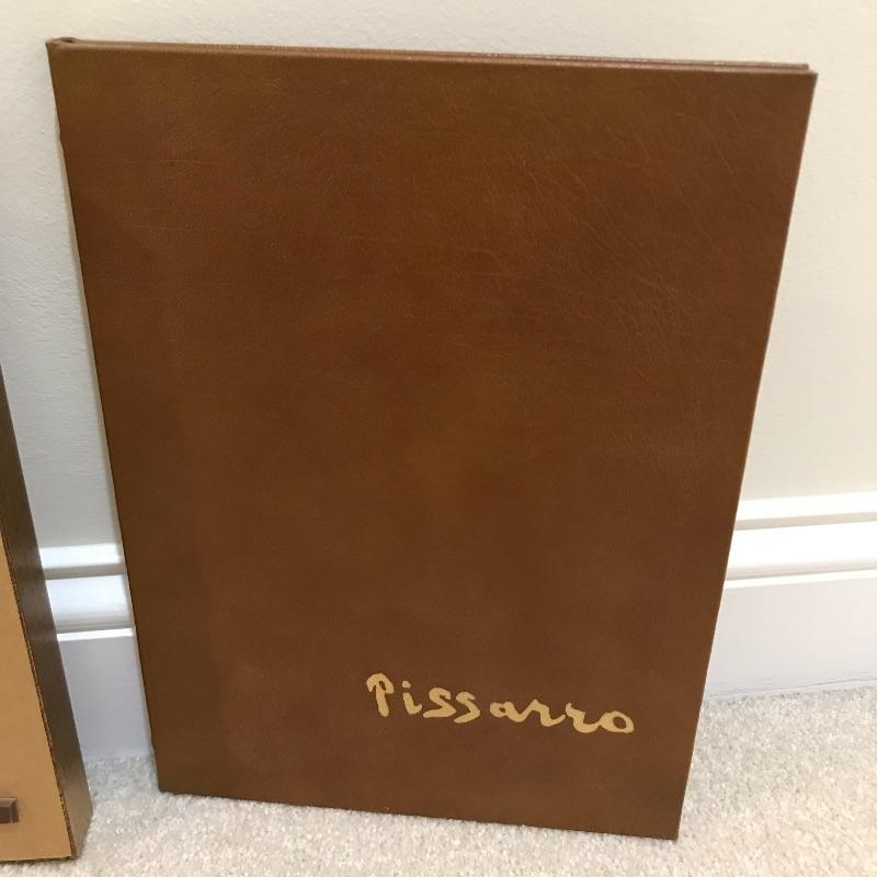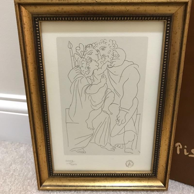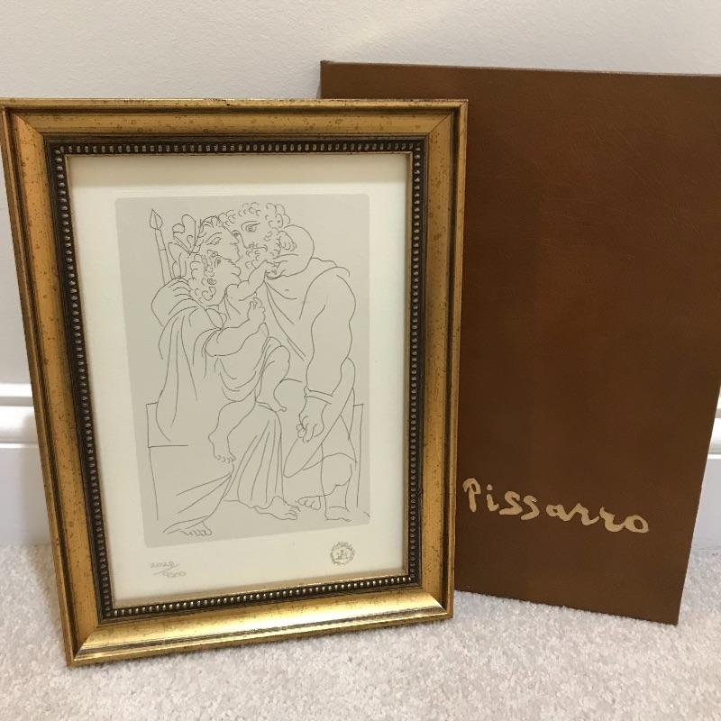 A Limited edition print of a Picasso etching from Lysistrata. Numbered 2028/9500 and set in a gold colored frame. Measures approximately 9” x 12”. Also included in this lot is a Collector’s Edition leather bound book of Pissarro’s artwork by Raymond Cogniat. The Easton Press, 1982. 22k gold accents on front.