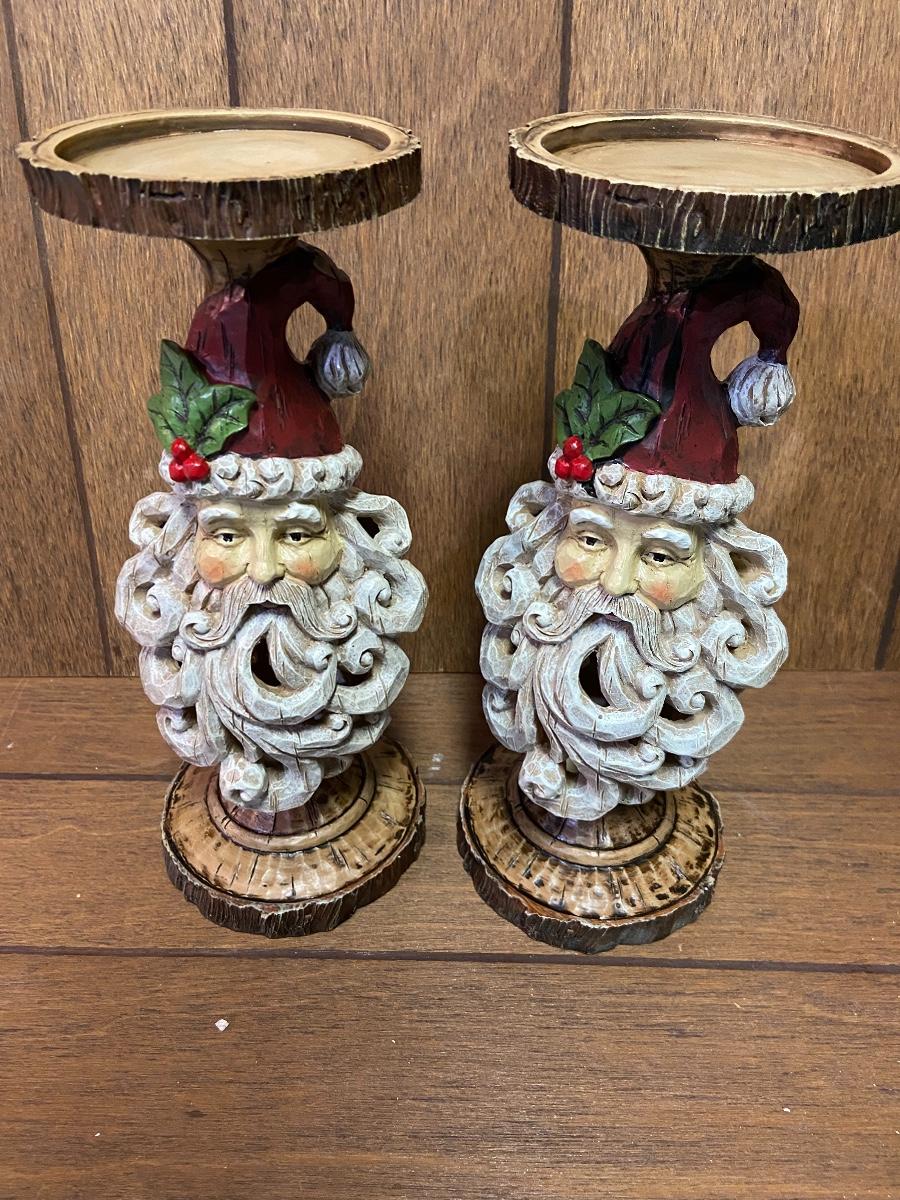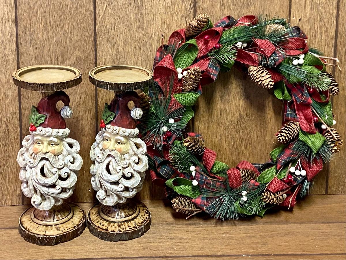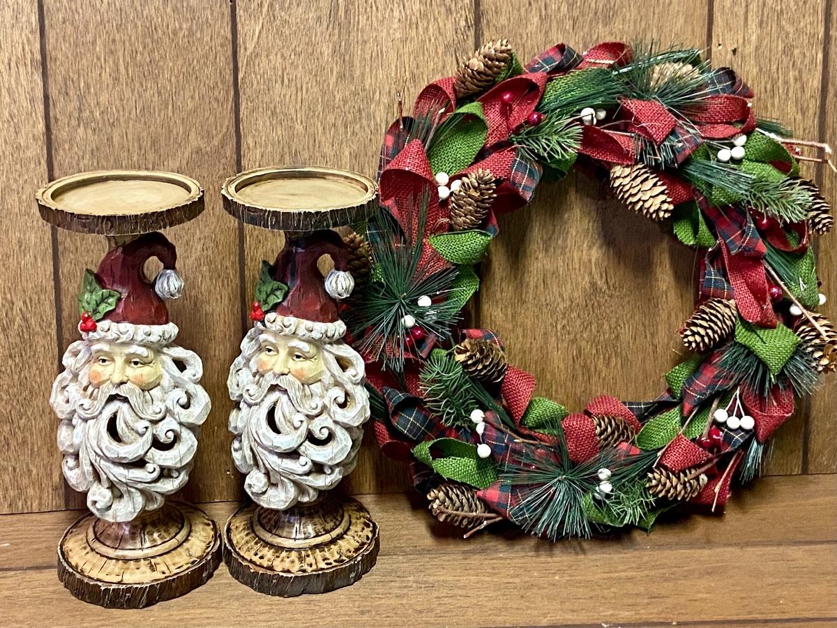 Lot 324: New Burlap/Evergreen Wreath and Santa Candlesticks(lot 2 of 2)