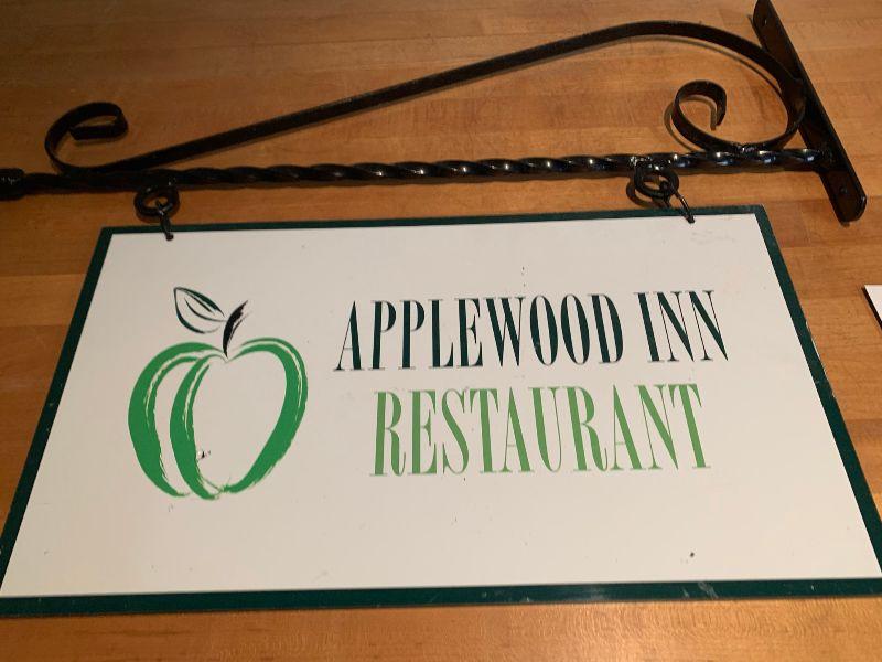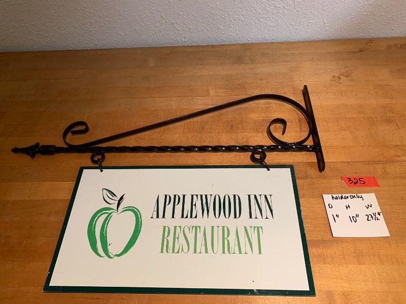 Metal hanging sign holder with Applewood Inn and Restaurant sign.