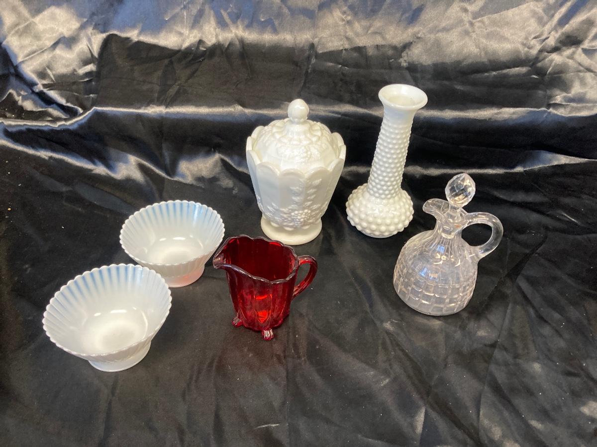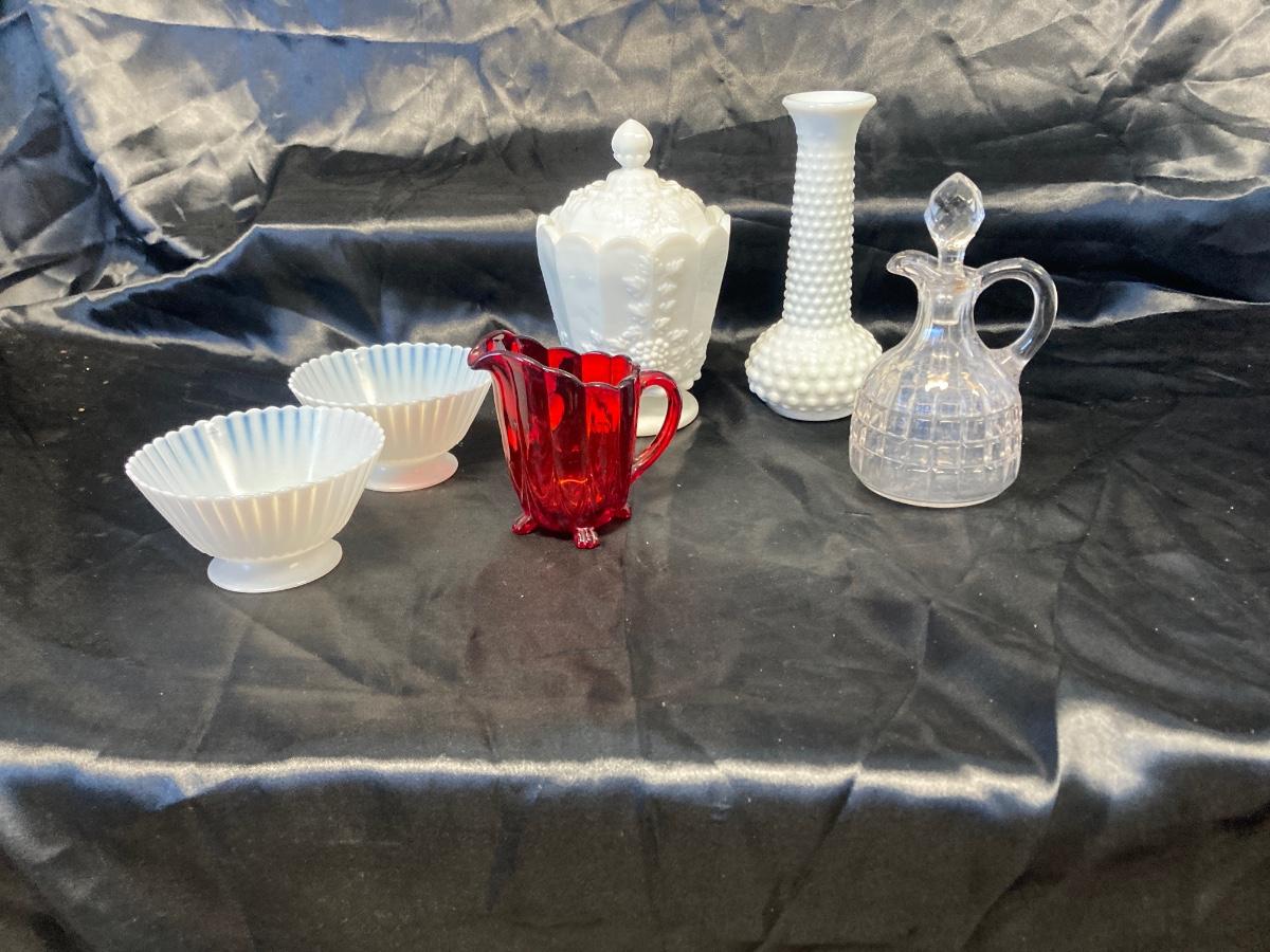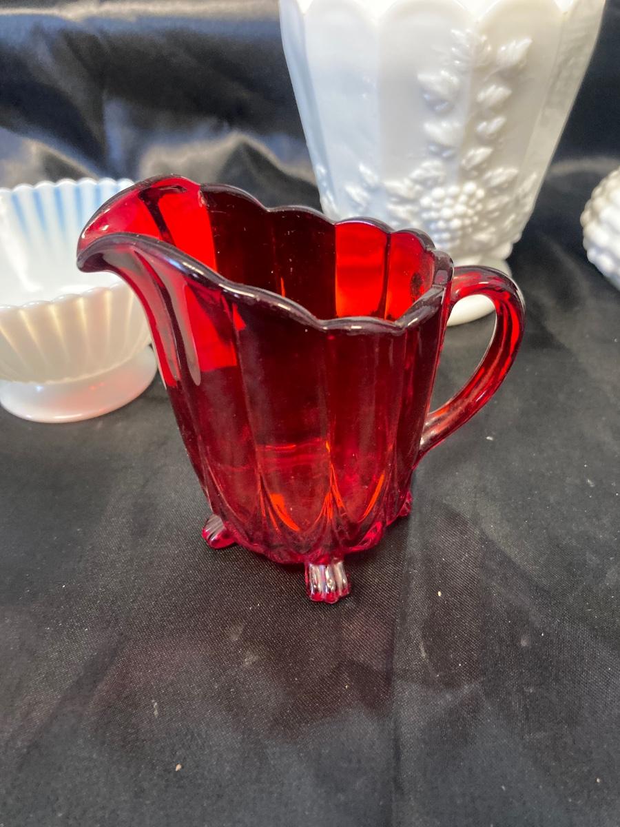 .E.O. BRODEY WHITE MILK GLASS BUD VASE, A WESTMORELAND PANELED GRAPE MILK GLASS COVERED CANISTER 7-1/2" AND A CUTE LITTLE RUBY RED PITCHER