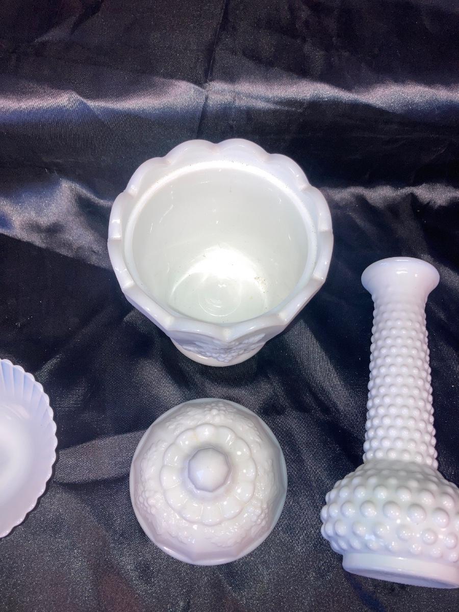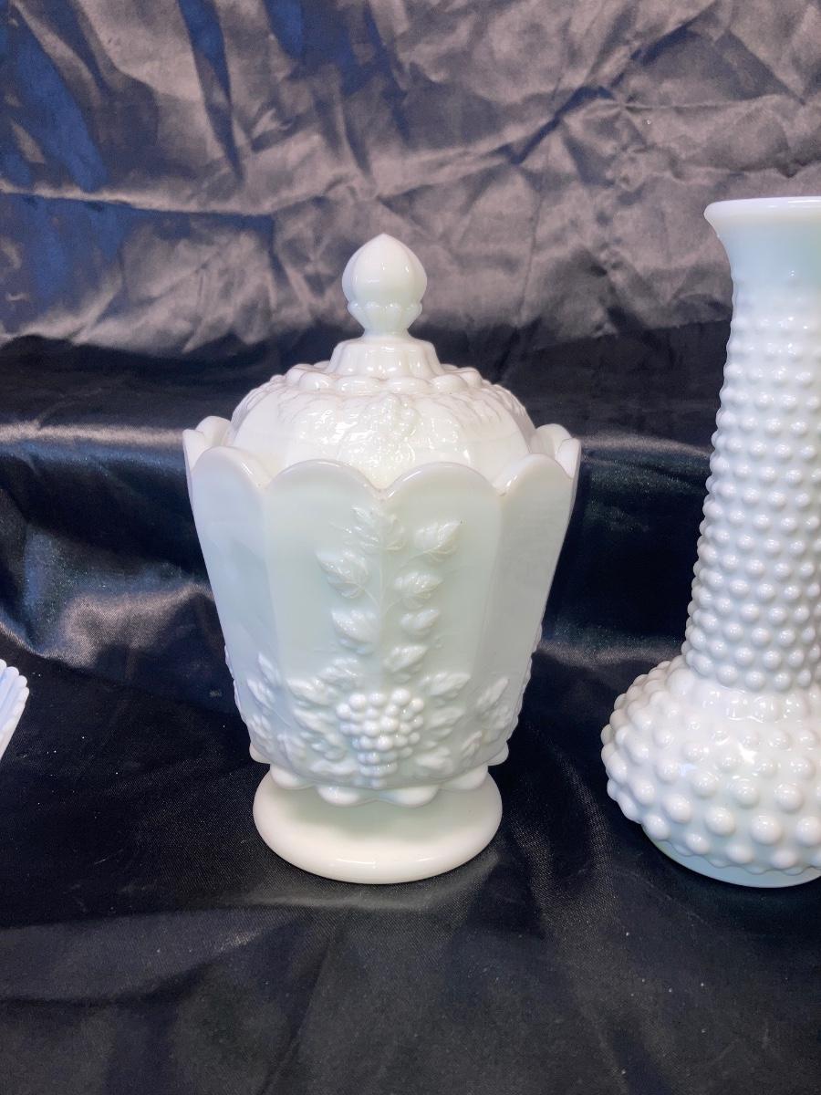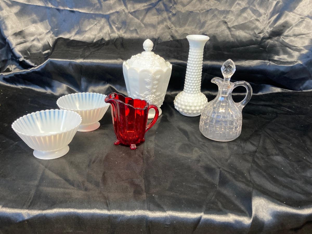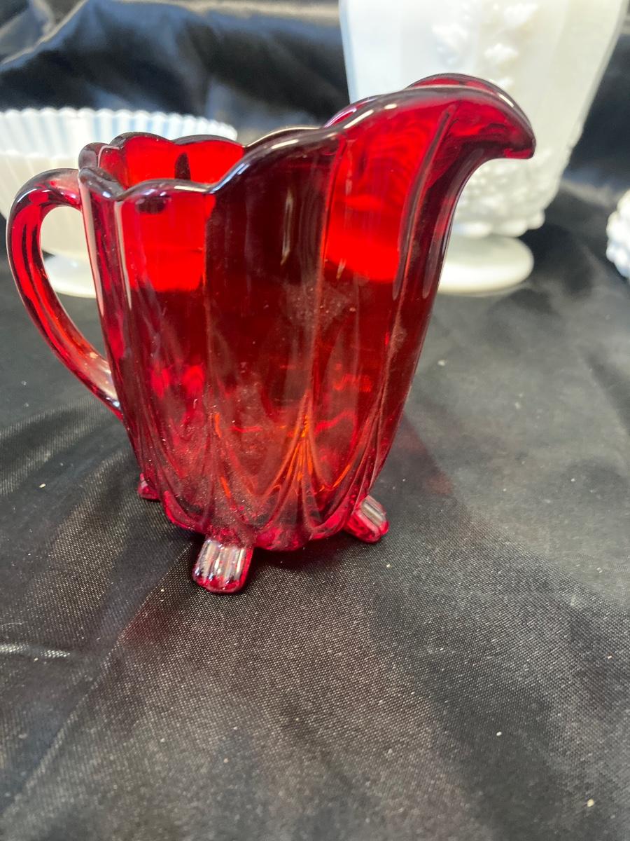 .E.O. BRODEY WHITE MILK GLASS BUD VASE, A WESTMORELAND PANELED GRAPE MILK GLASS COVERED CANISTER 7-1/2" AND A CUTE LITTLE RUBY RED PITCHER