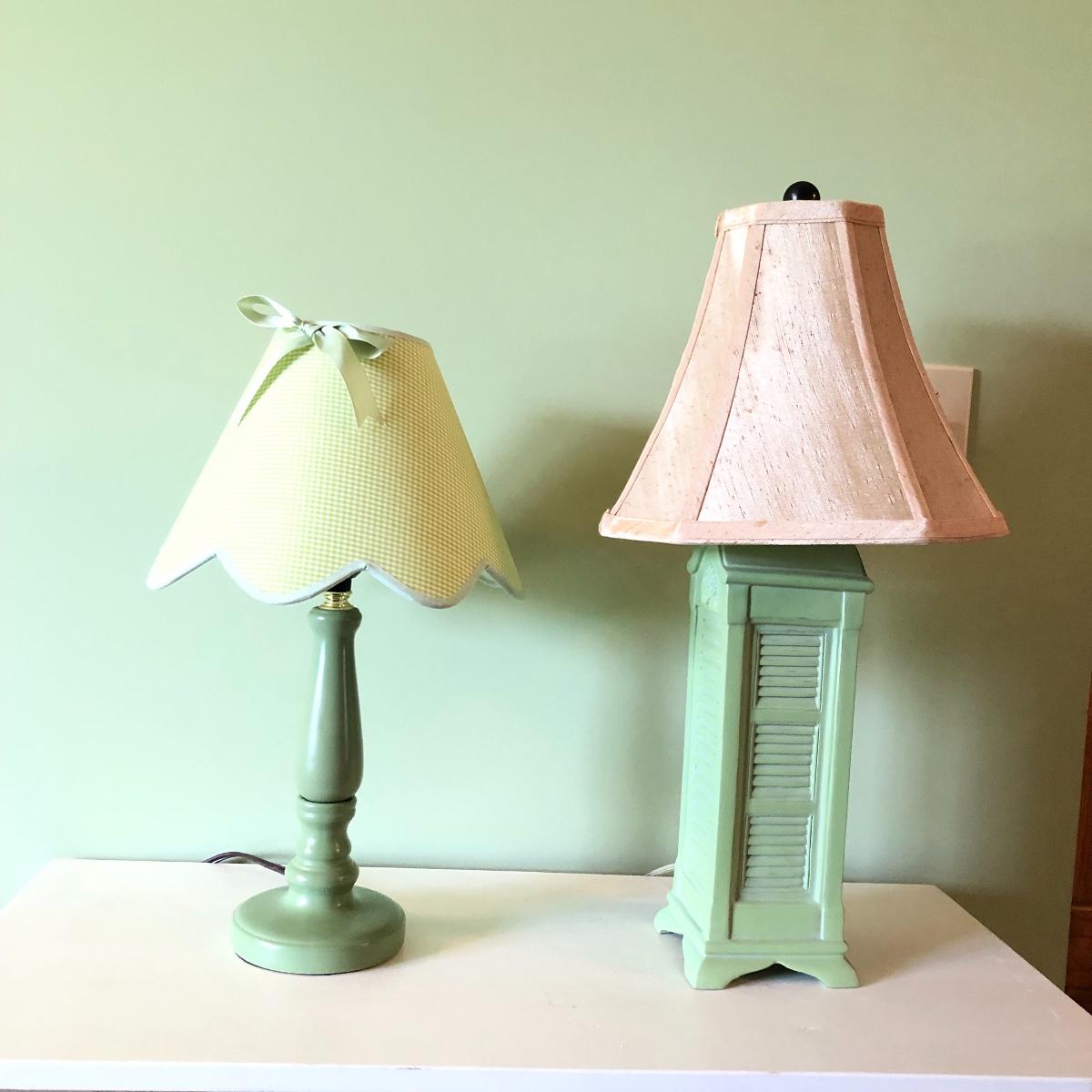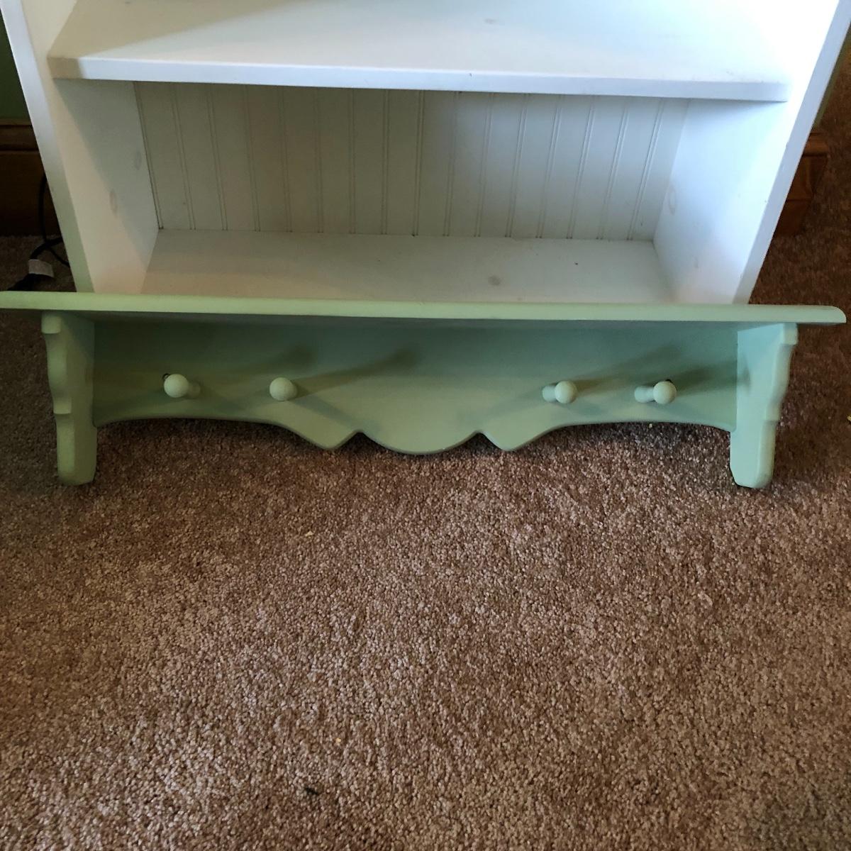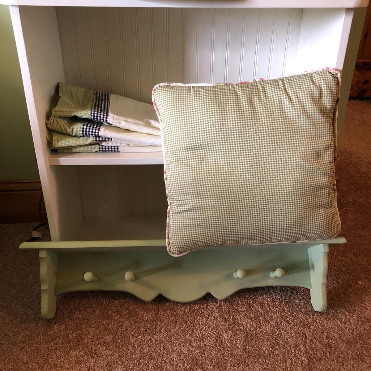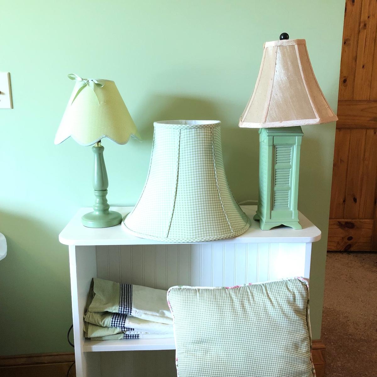 Add some color to your bedroom with this green and white decor. Lot includes two lamps, wooden coatrack, pillow, extra lampshade and a white wooden bookshelf. Bookshelf measures 13” x 29” x 28”.