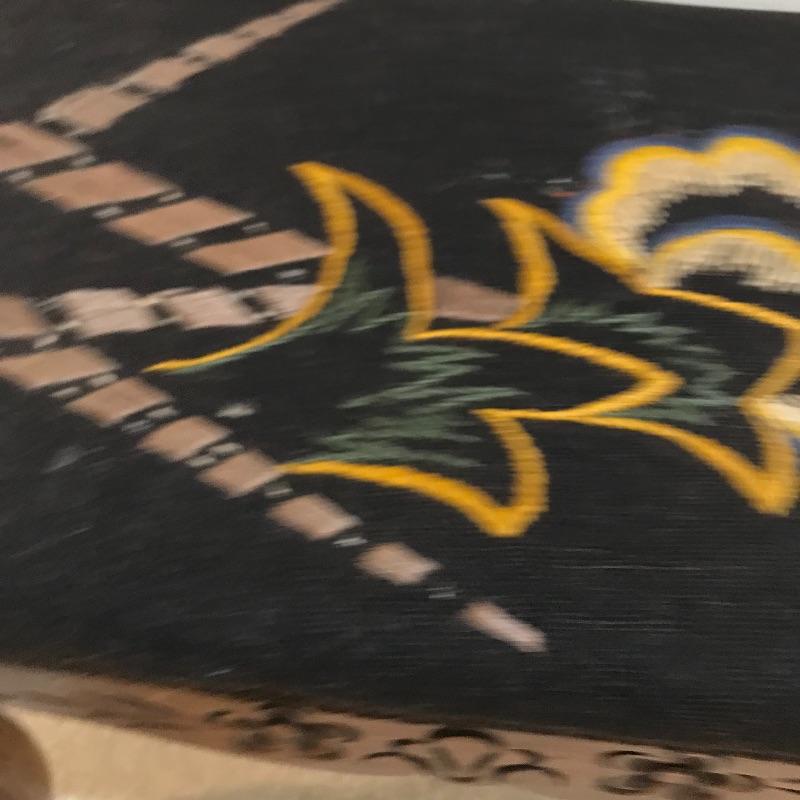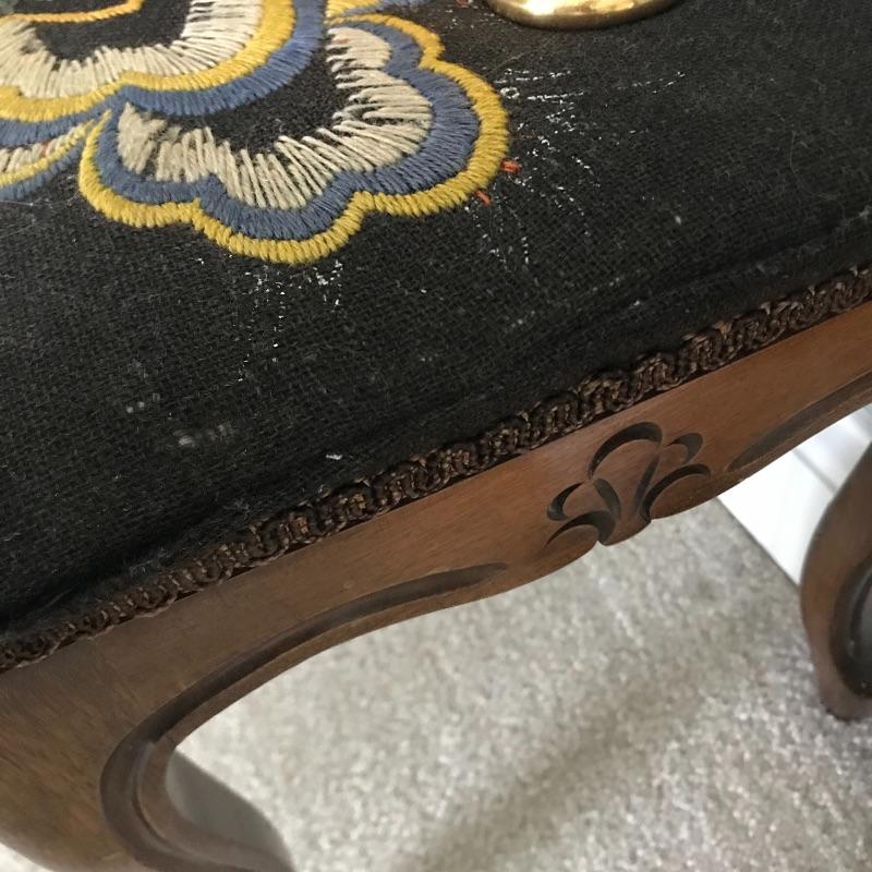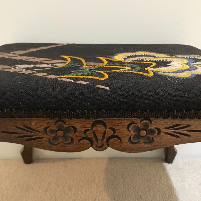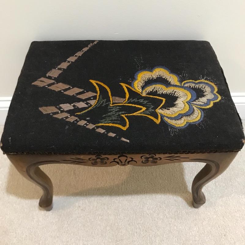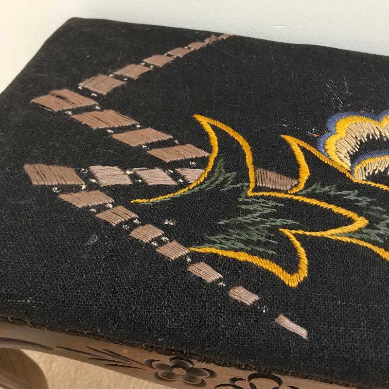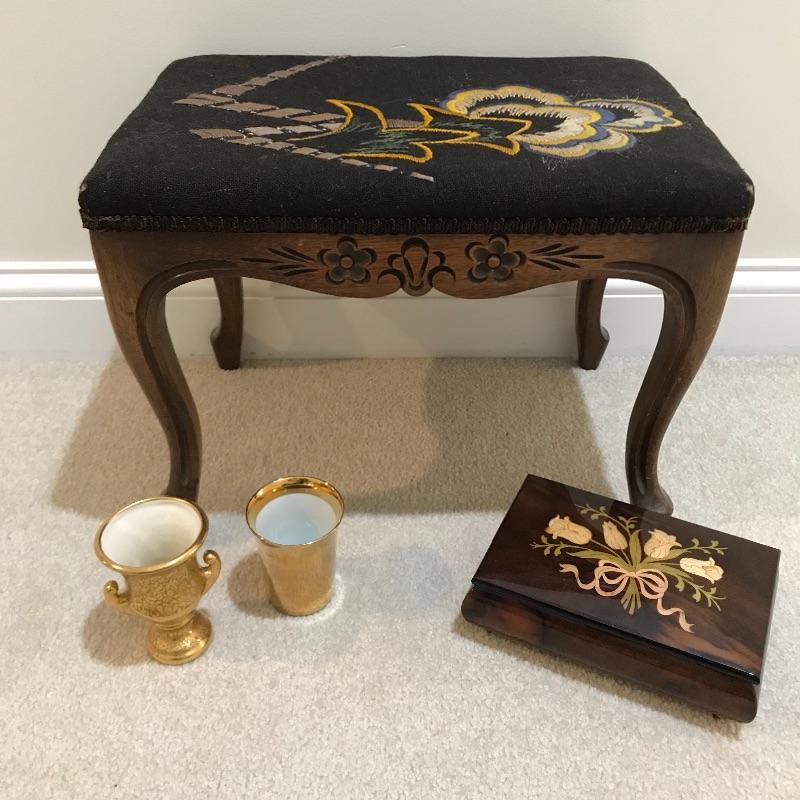 A charming and unique wood carved stool with hand-embroidered top. Embroidery is black with an unusual and appealing design. Stool measures approximately 17” x 12” x 13”. Also included here is an Italian music box measuring approximately 8.5” x 5.5” x 3”, and two small gold vases. The taller vase measures approximately 4.5”h.