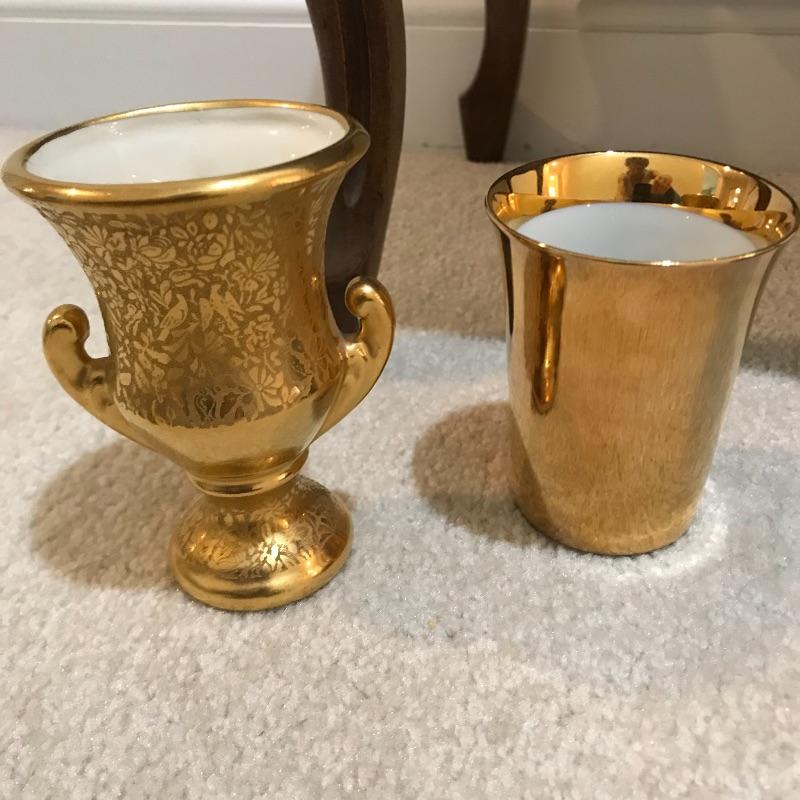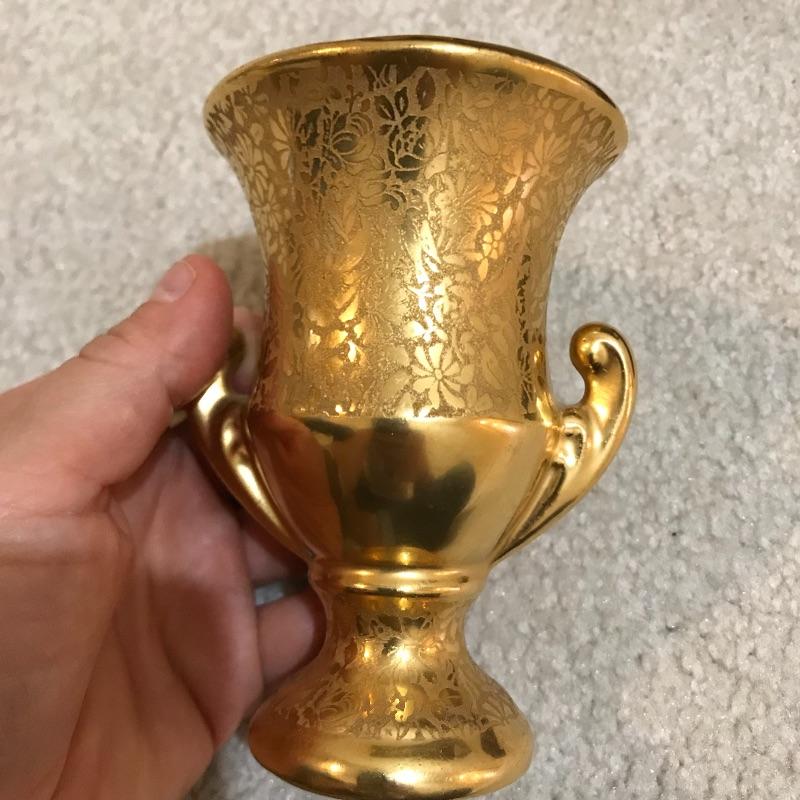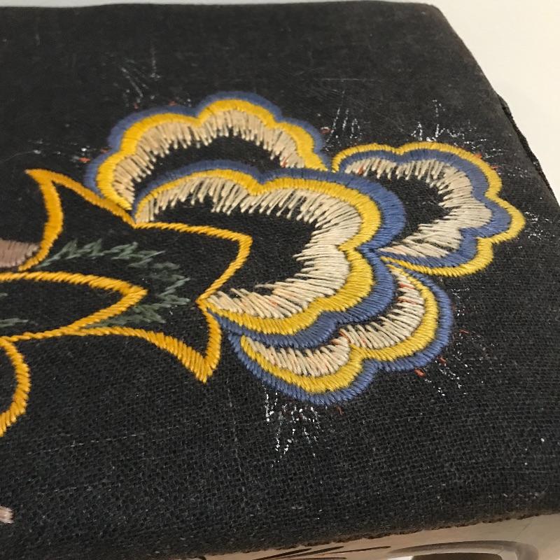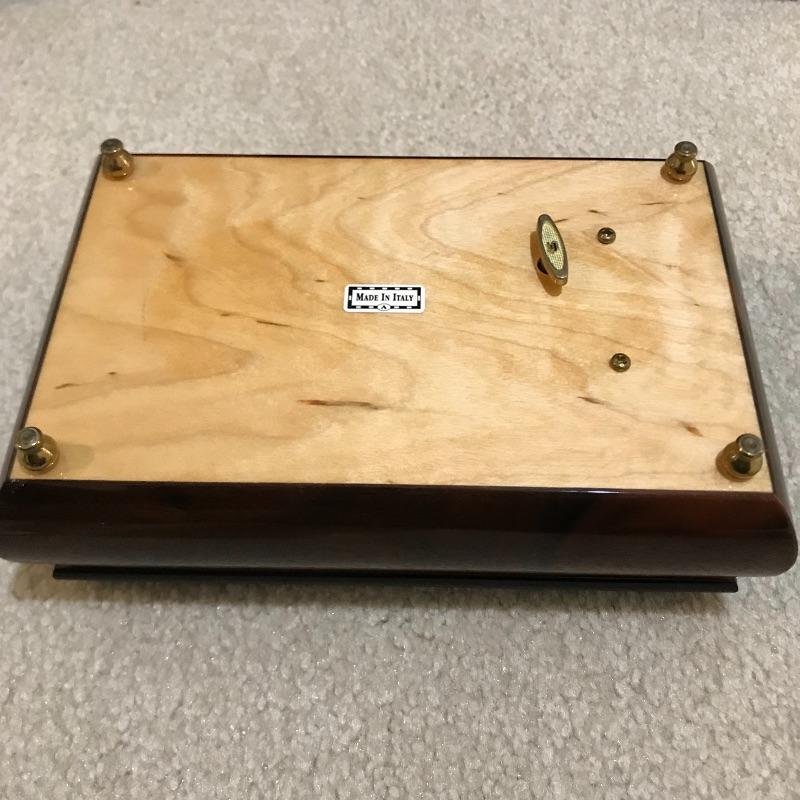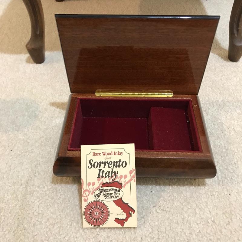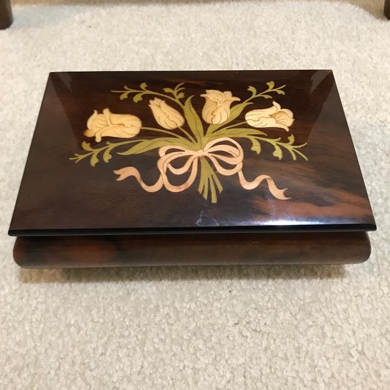 A charming and unique wood carved stool with hand-embroidered top. Embroidery is black with an unusual and appealing design. Stool measures approximately 17” x 12” x 13”. Also included here is an Italian music box measuring approximately 8.5” x 5.5” x 3”, and two small gold vases. The taller vase measures approximately 4.5”h.