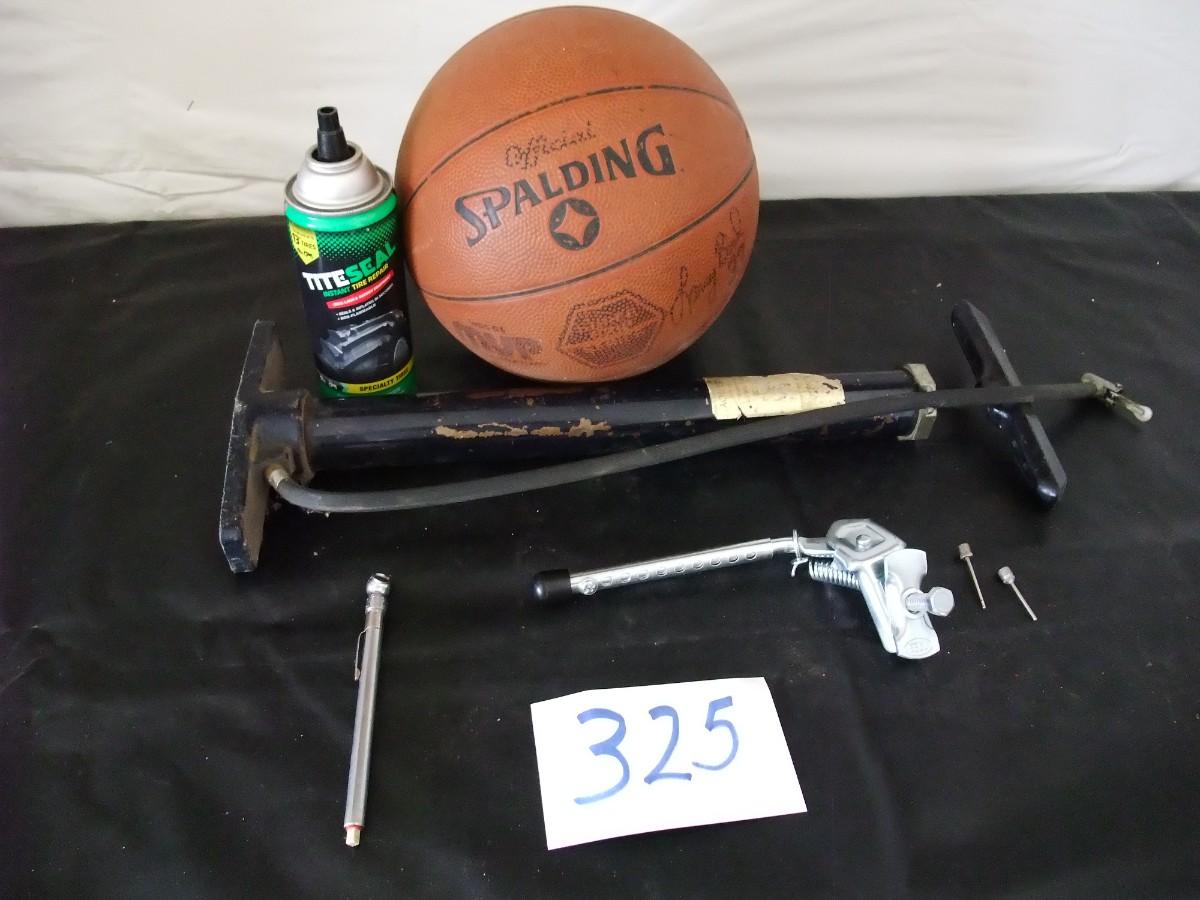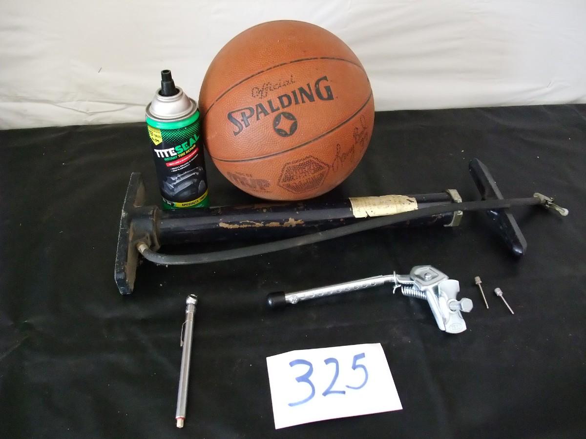 LOT 325 SPALDING BASKETBALL, AIR PUMP, ADJUSTABLE KICKSTAND, AIR NEEDLES, TIRE GAUGE, & TIRE SEALANT