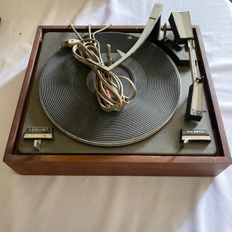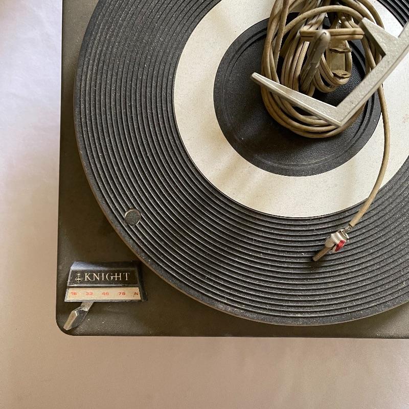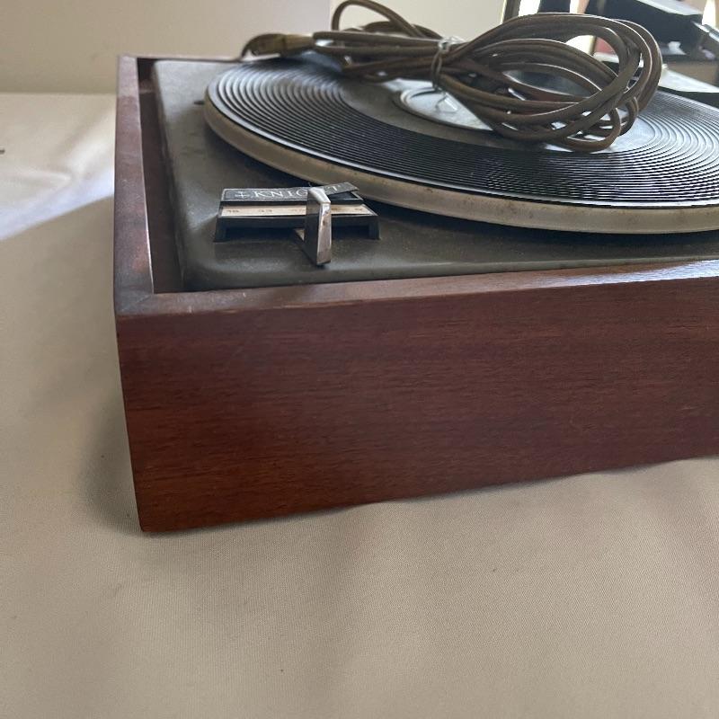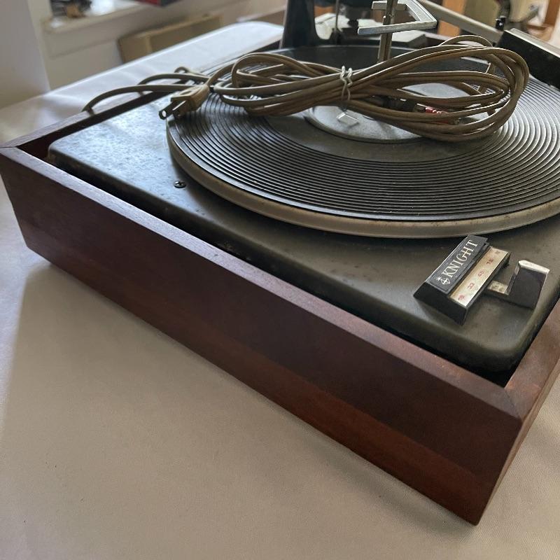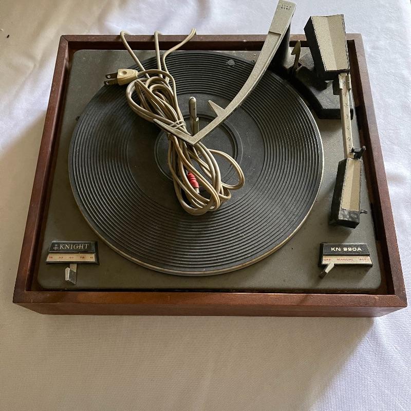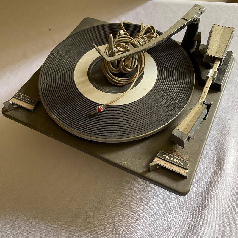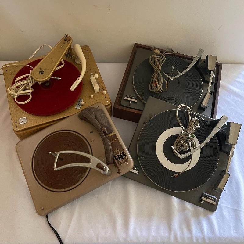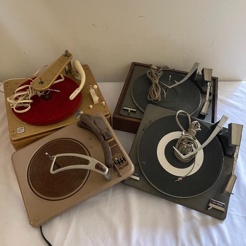 Group of four turntables from various makers. Two are Knight turntables, both are model 990A. One is Marconi, Swedish made, and the type number is A-517-056. The last is a single High Fidelity turntable, model 31471.
