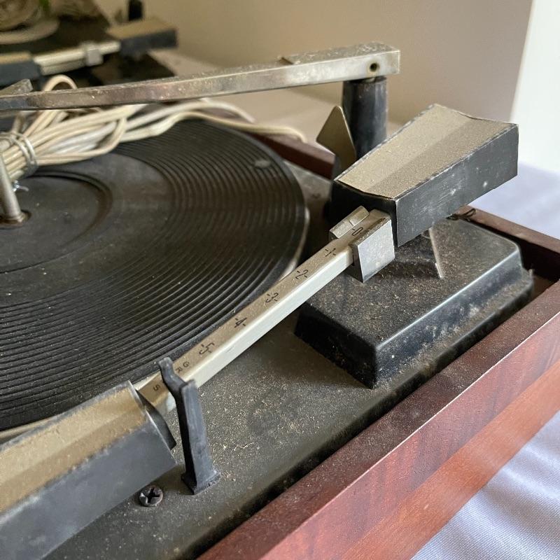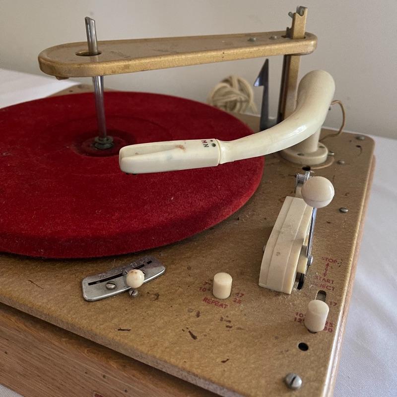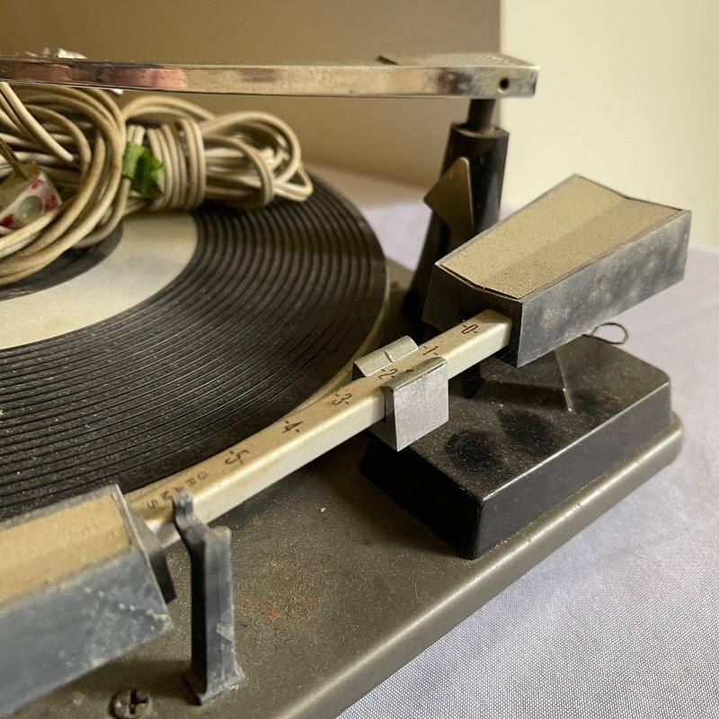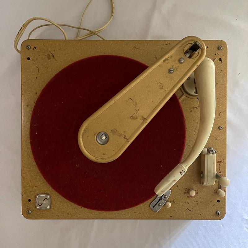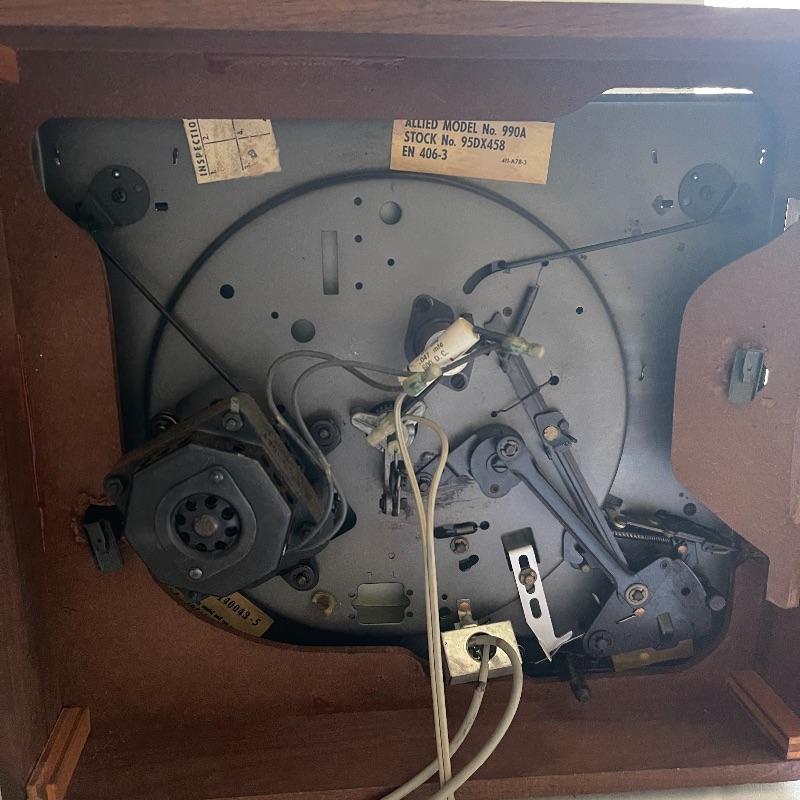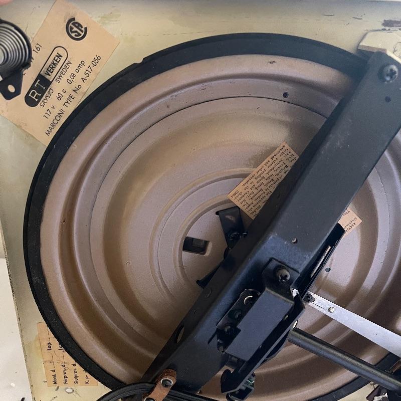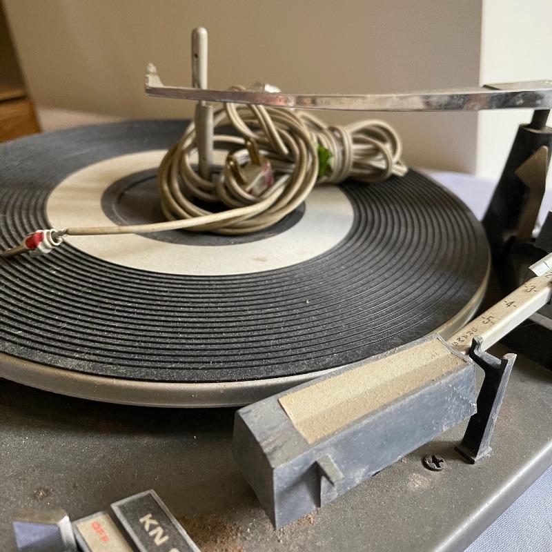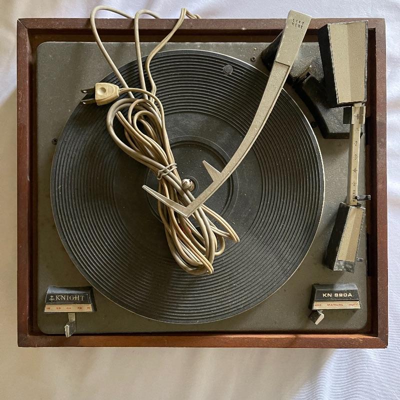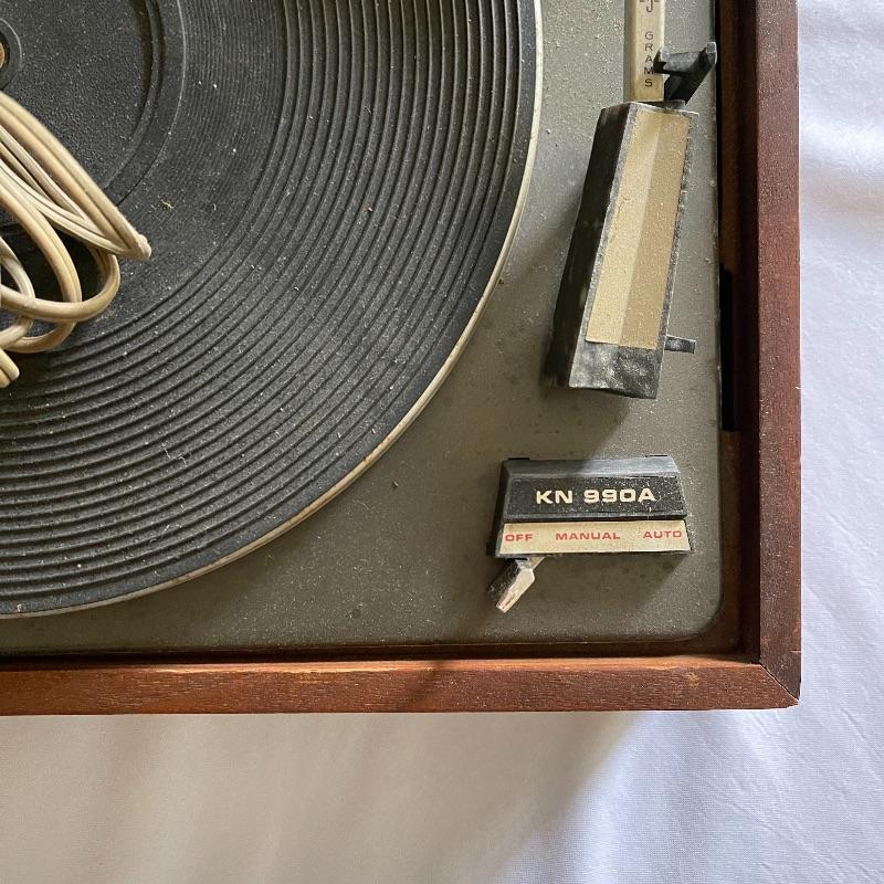 Group of four turntables from various makers. Two are Knight turntables, both are model 990A. One is Marconi, Swedish made, and the type number is A-517-056. The last is a single High Fidelity turntable, model 31471.