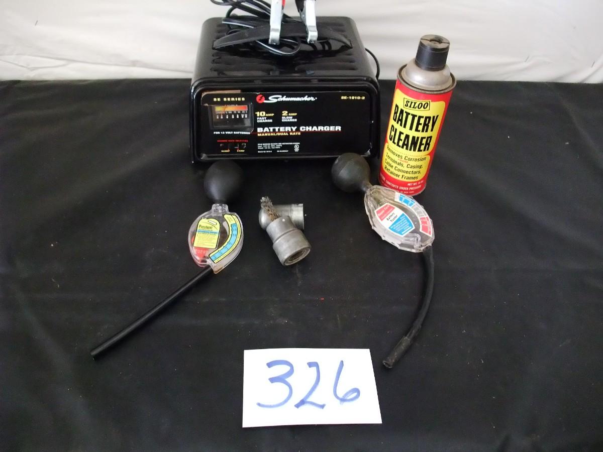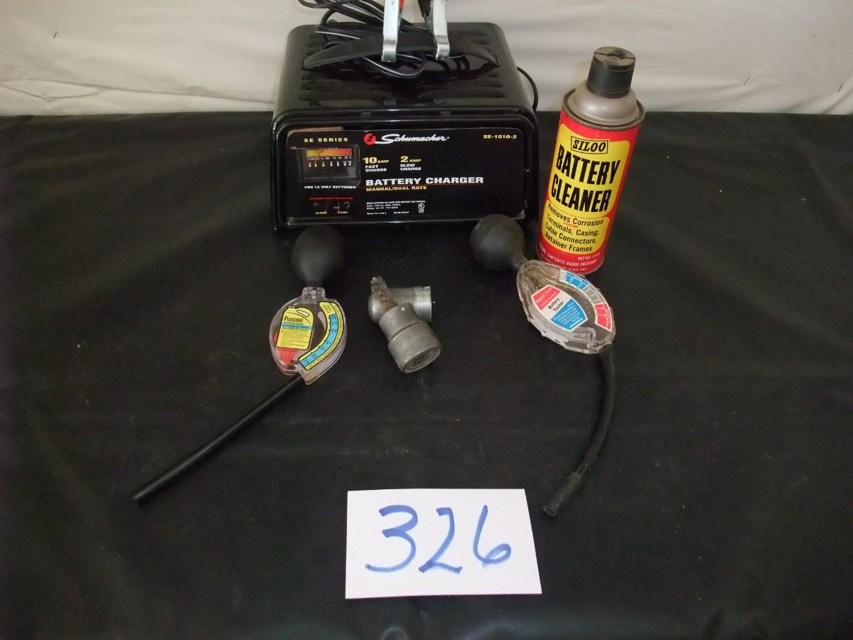 LOT 326 BATTERY CHARGER , BATTERY CLEANER, BATTERY & ANTIFREEZE TESTER, TERMINAL BRUSHES