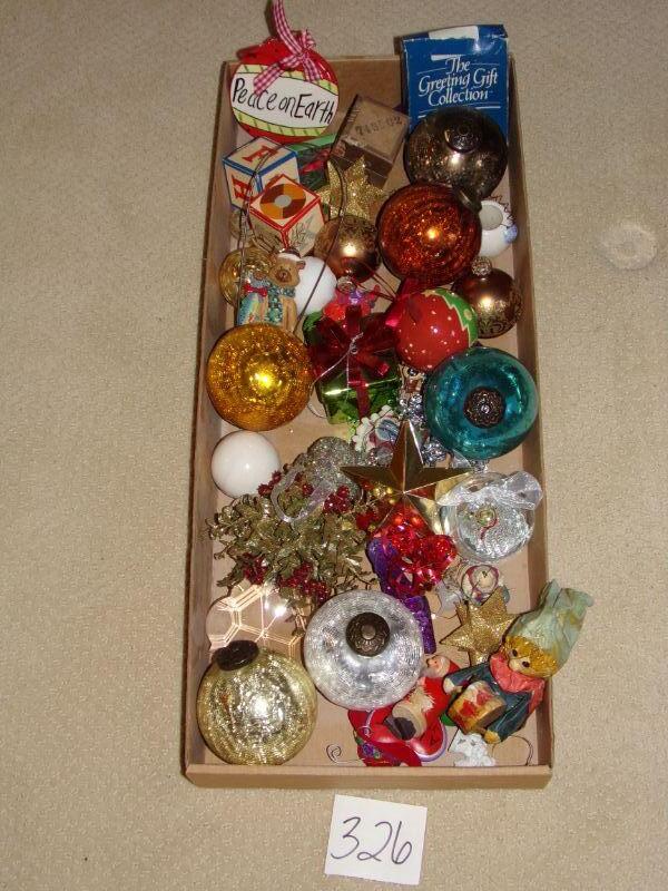 BOX OF CHRISTMAS ORNAMENTS. THAT INCLUDE SOME VINTAGE, SOME FROM FOREIGN COUNTRIES AND OTHERS THAT ARE UNIQUE