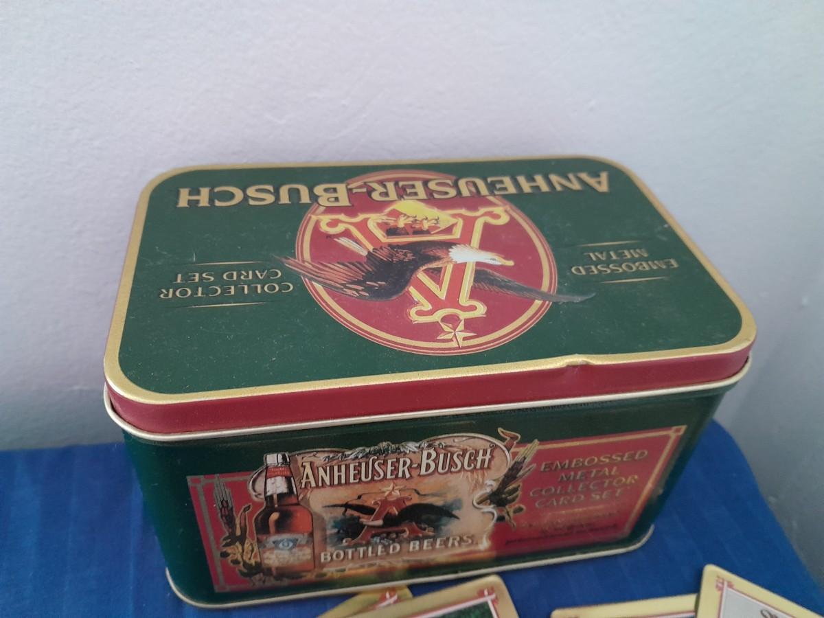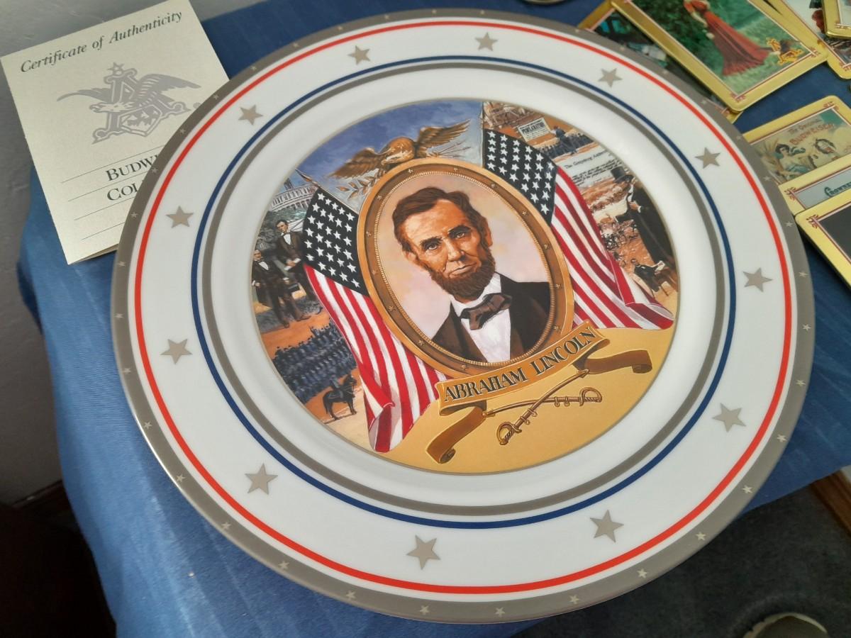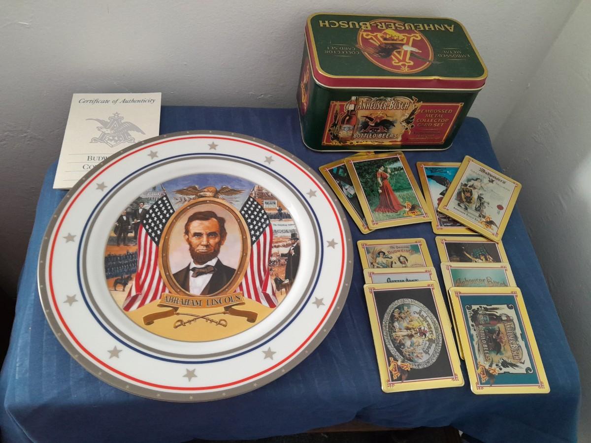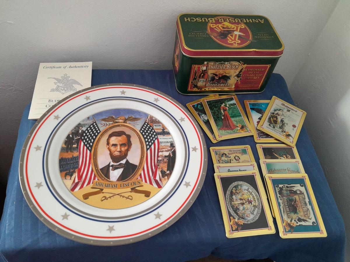 BUDWEISER ABRAHAM LINCOLN COLLECTORS PLATE 10" AND TIN WITH EMBOSSED METAL COLLECTOR CARD SET