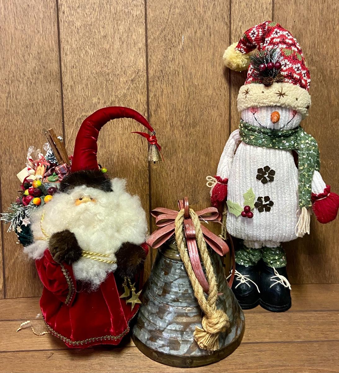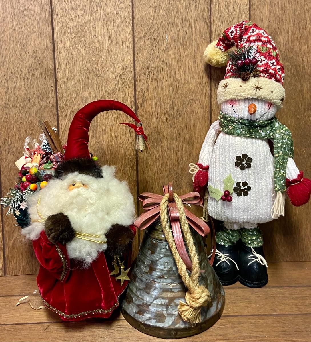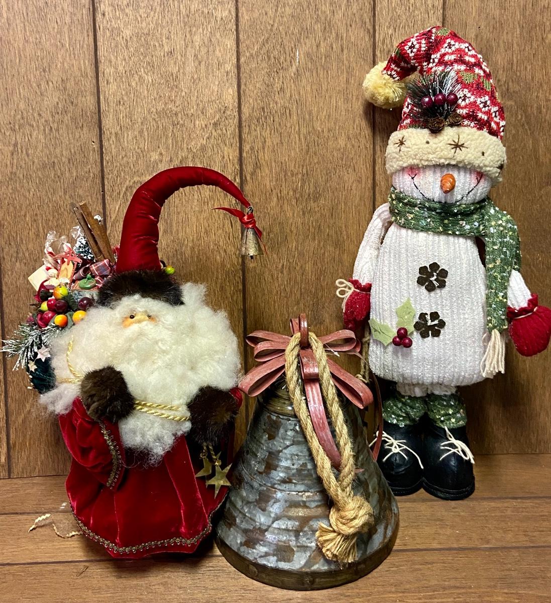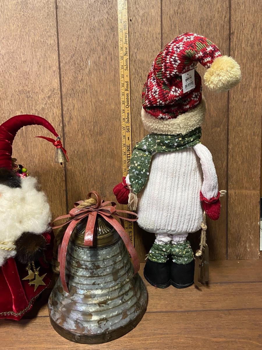 Lot 326: Unique Santa, Large Metal Bell, and Standing Snowman