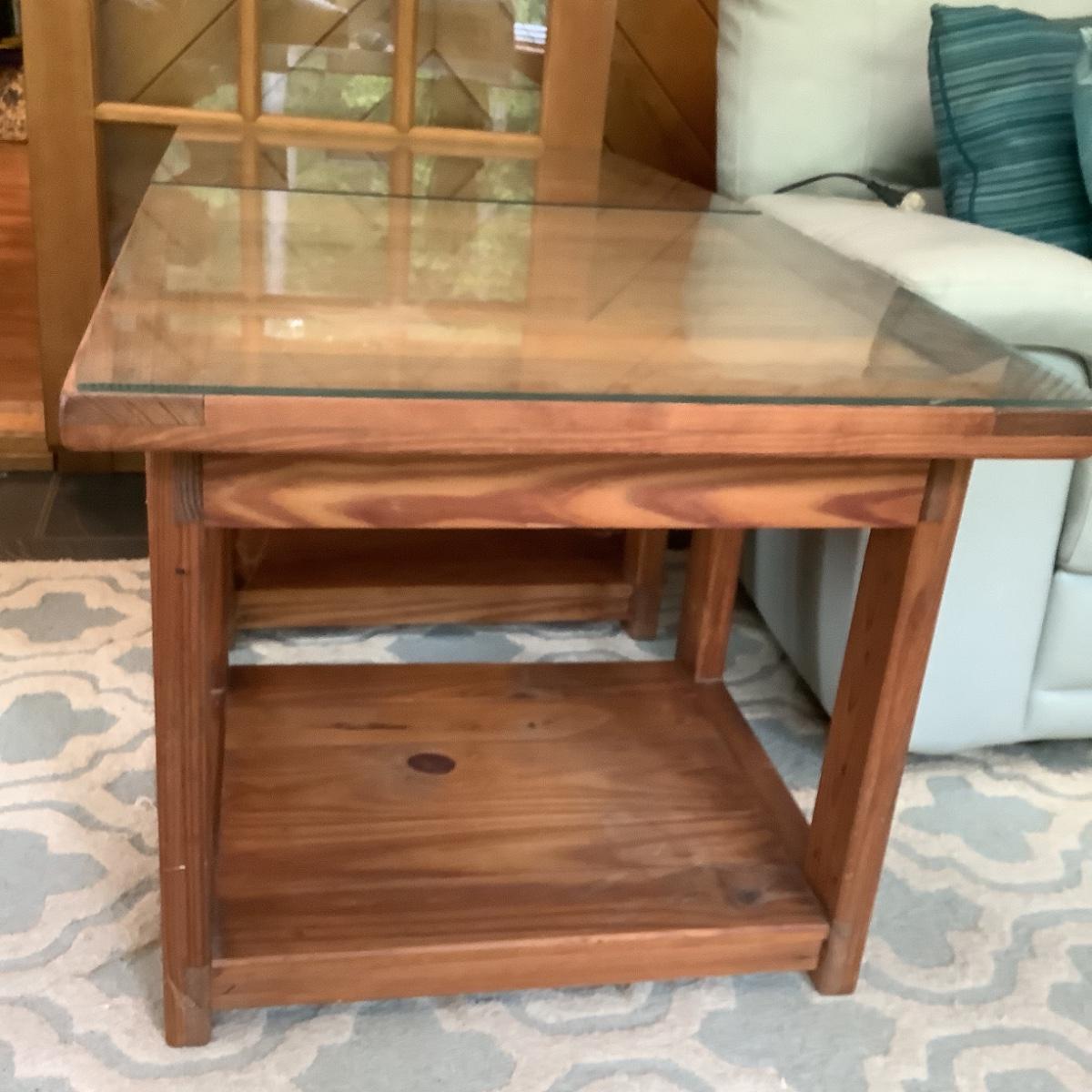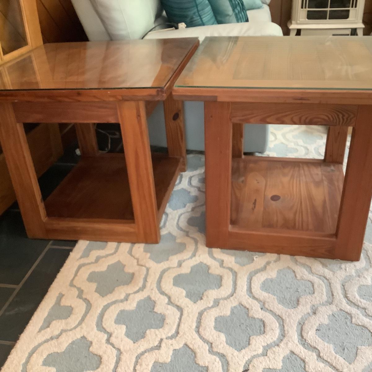 Pair of Wooden End Tables with Glass Top and Wooden Bottom Shelf by This End Up Furniture Company