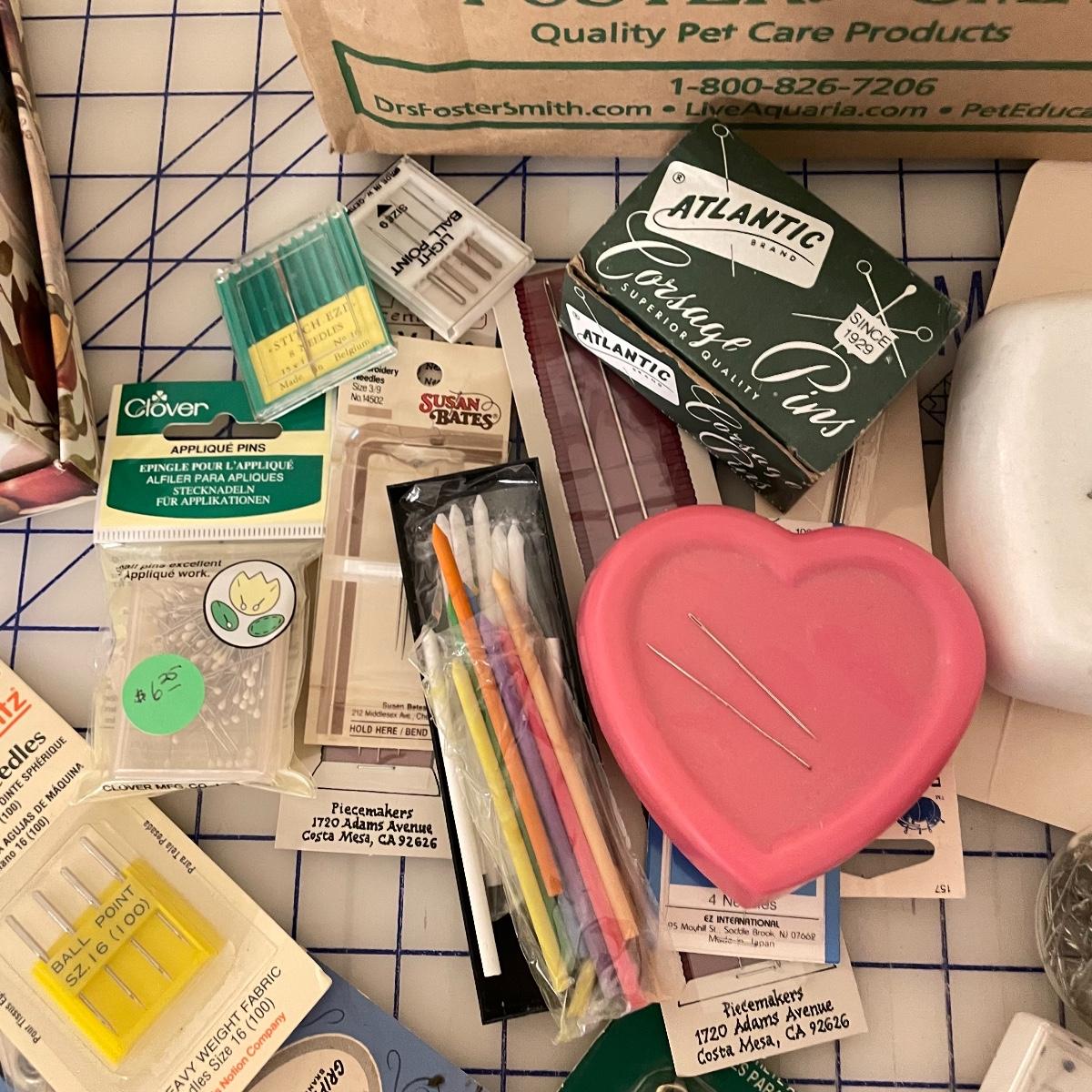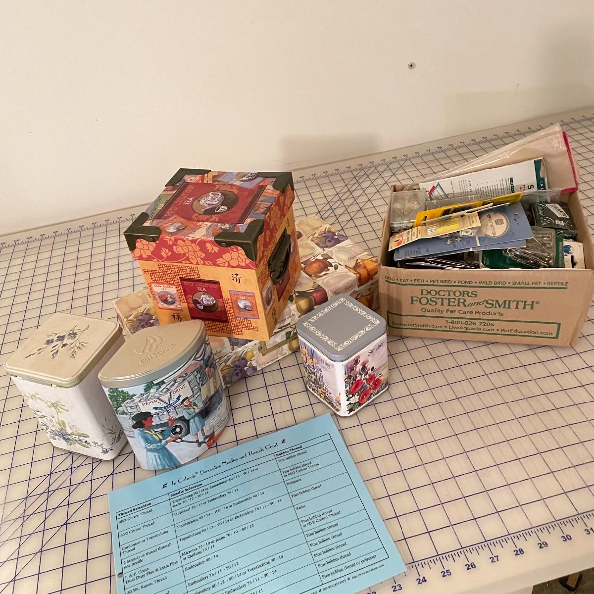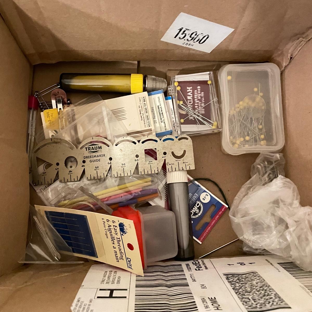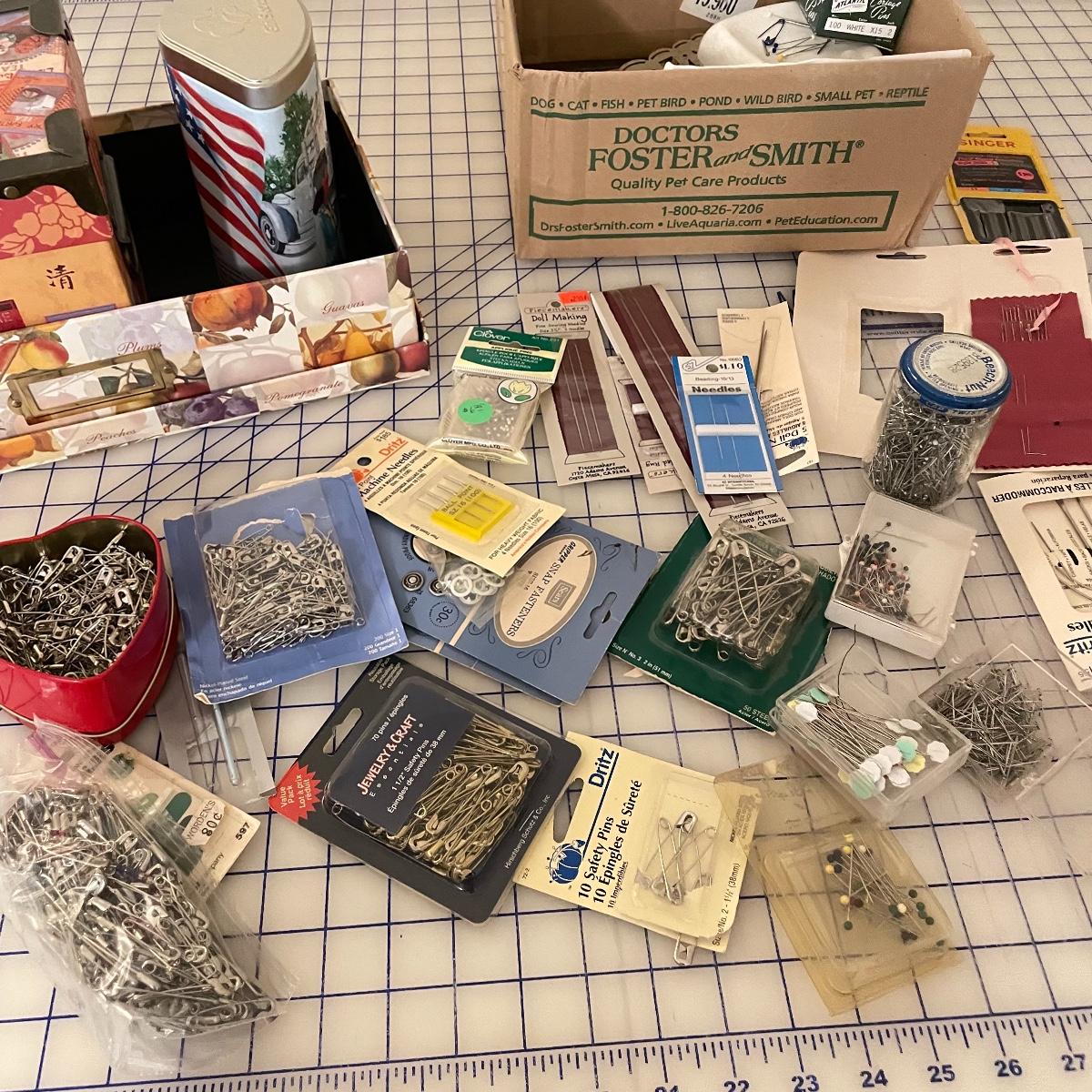 Lot full of pins, needs and sewing tools like tracing kit, dressmaker guide, thimbles and more! Lots of pins including safety pins. Lot also includes plenty of needles in a variety of sizes and intentions. Five tins and boxes, the largest is a fruity cardboard stationary box measuring 13.5” x 7” x 3.5”. Local pick up only.