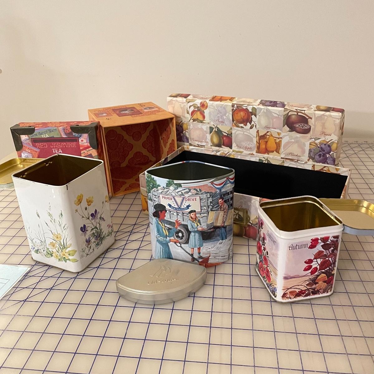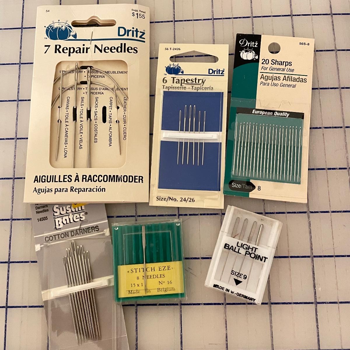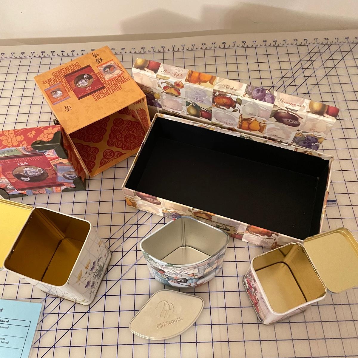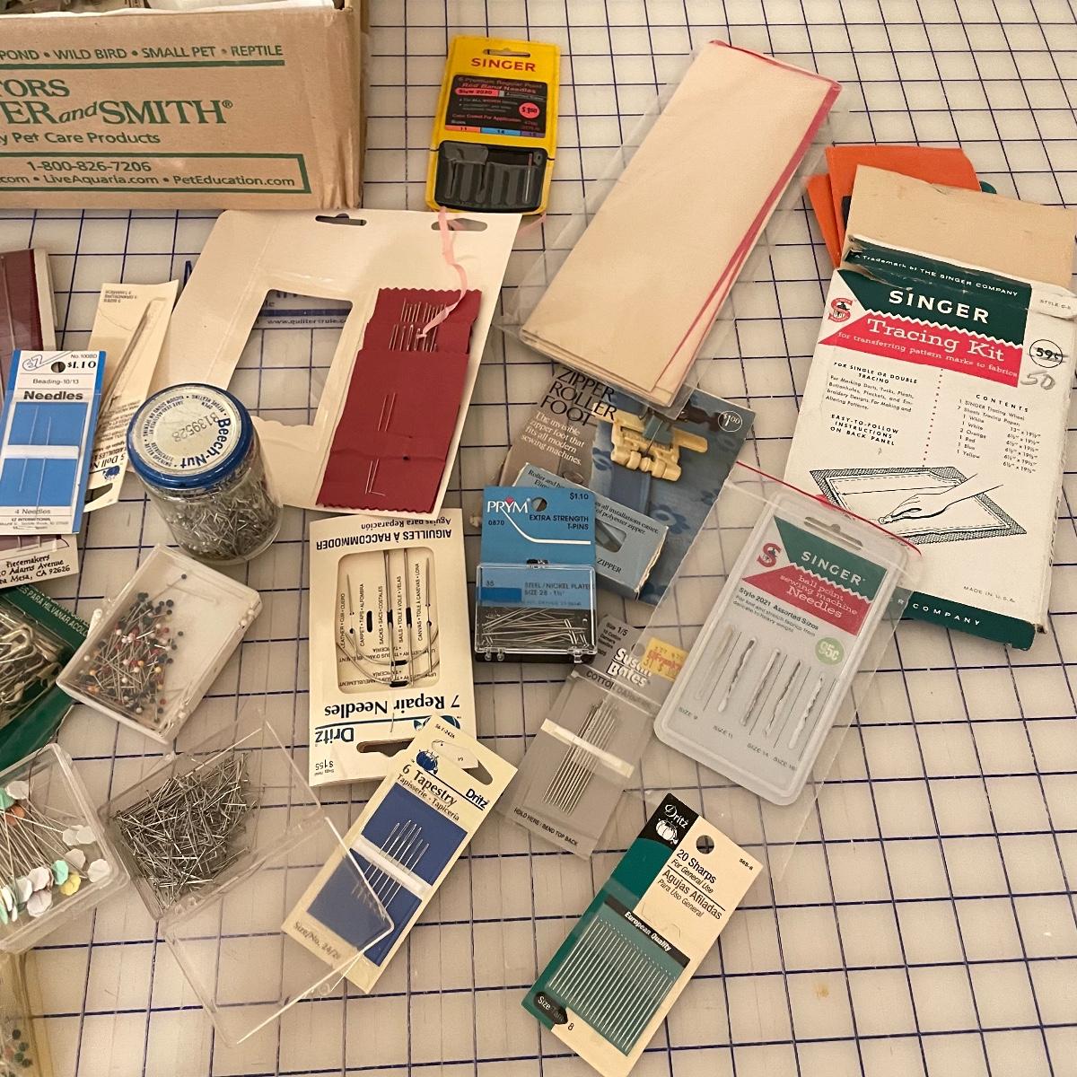 Lot full of pins, needs and sewing tools like tracing kit, dressmaker guide, thimbles and more! Lots of pins including safety pins. Lot also includes plenty of needles in a variety of sizes and intentions. Five tins and boxes, the largest is a fruity cardboard stationary box measuring 13.5” x 7” x 3.5”. Local pick up only.