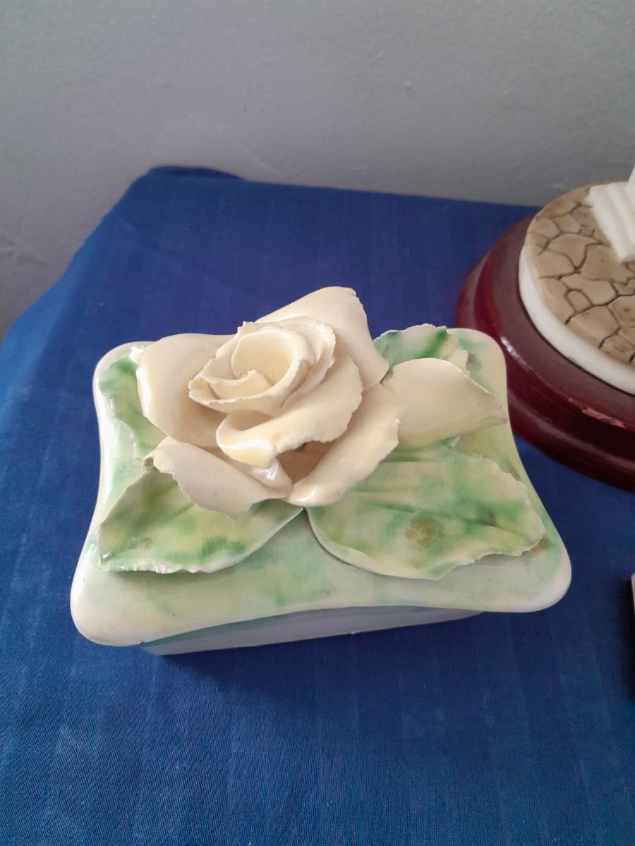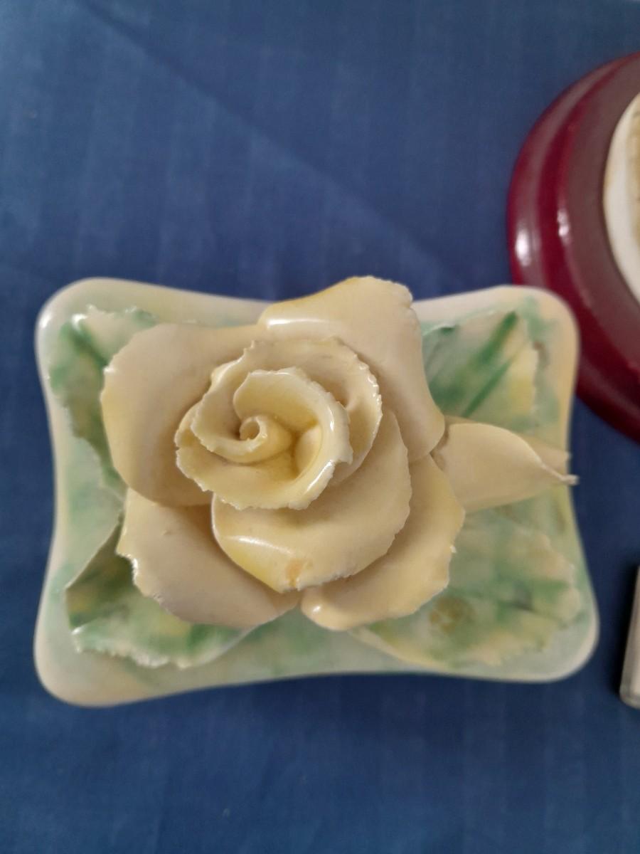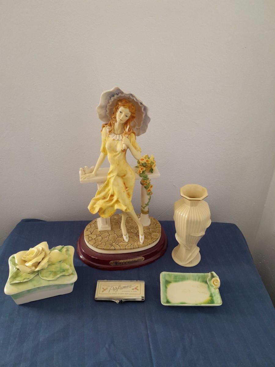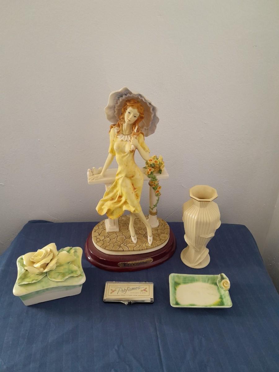 12" RUBY'S COLLECTION GIRL FIGURE, TWO SMALL YELLOW ROSE PORCELAIN BOXES, LENOX VASE, AND BOX WITH THREE NIPS OF SELECTED FAMOUS PERFUMES