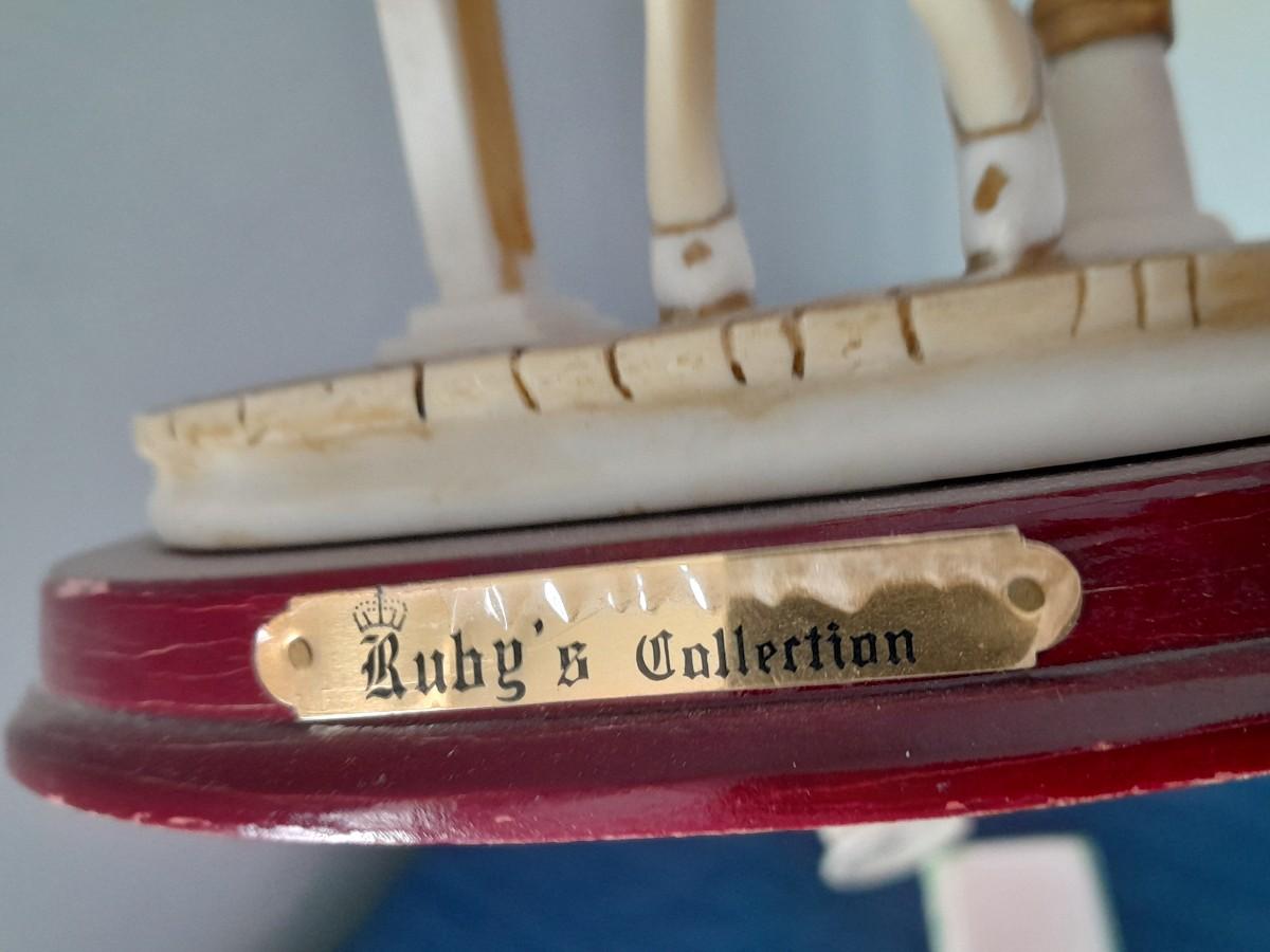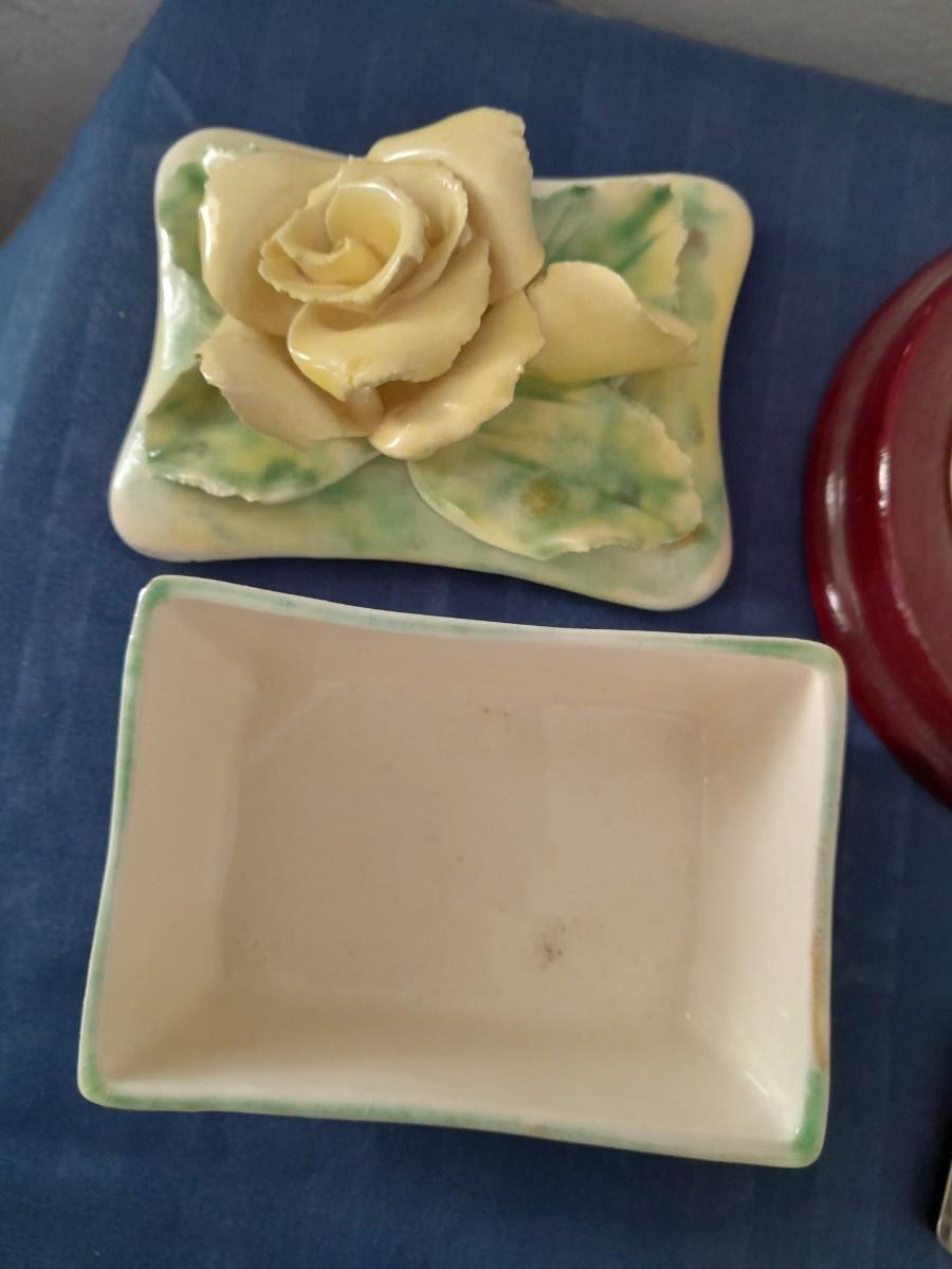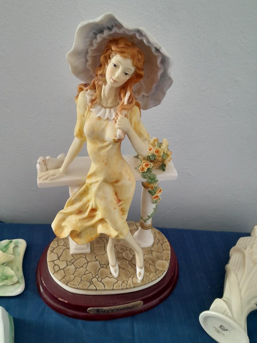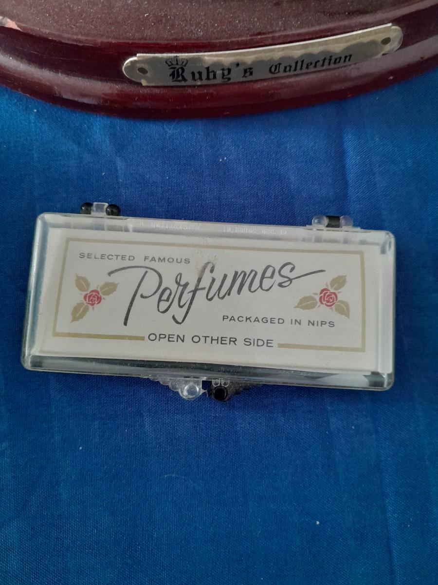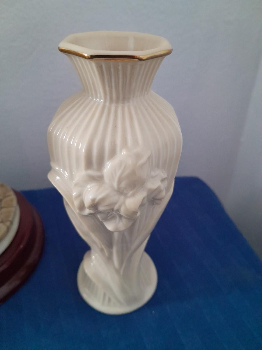 12" RUBY'S COLLECTION GIRL FIGURE, TWO SMALL YELLOW ROSE PORCELAIN BOXES, LENOX VASE, AND BOX WITH THREE NIPS OF SELECTED FAMOUS PERFUMES