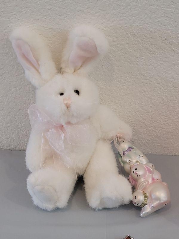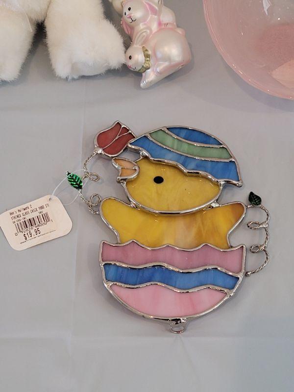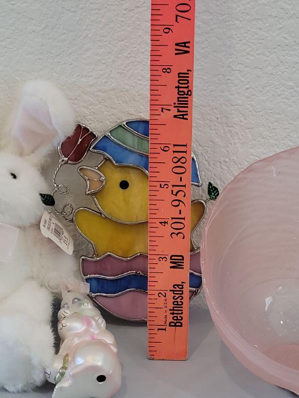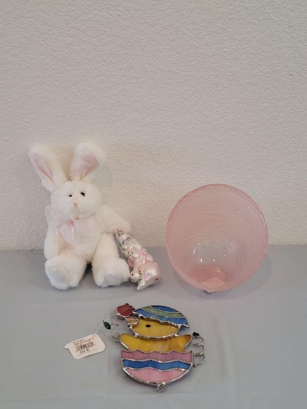 Lot 327: New Easter Bunny holding an Ornament, Hatched Chick Stained Glass Deco and Pink Glass Deco
