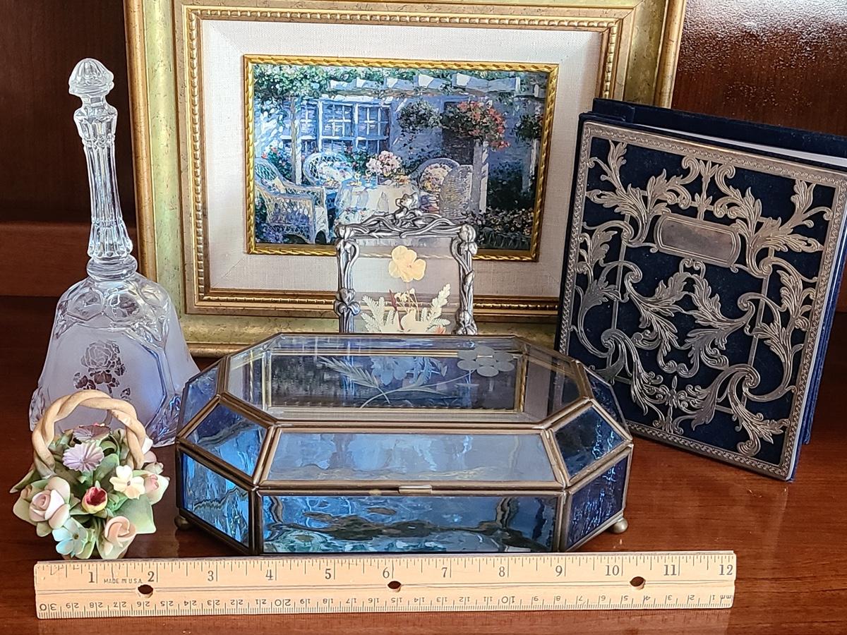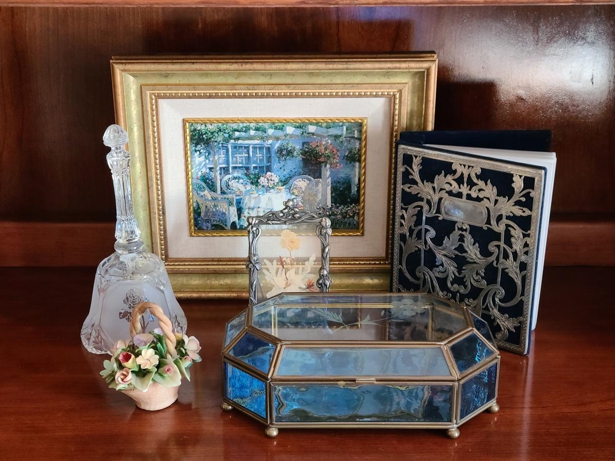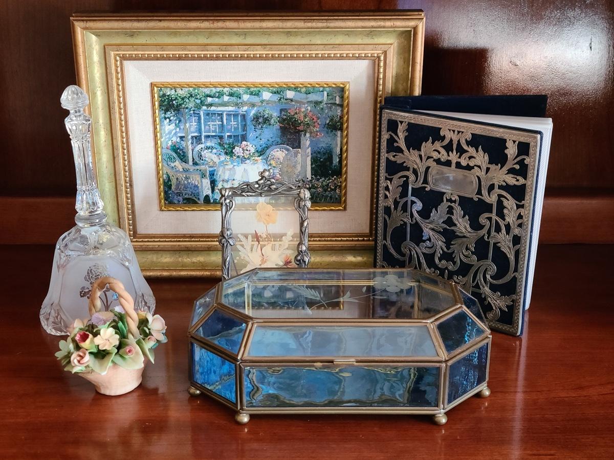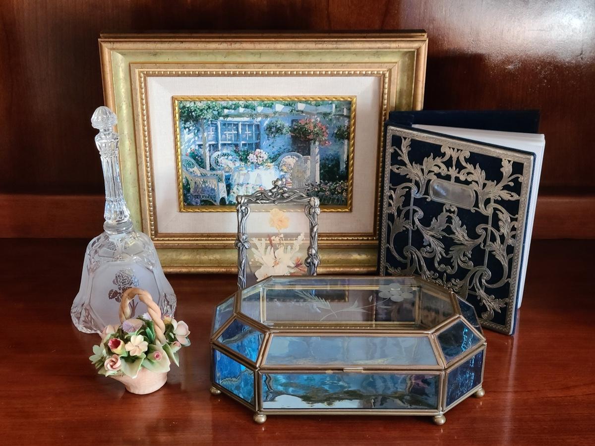 This is a lovely lot of home decor including a small painting on canvas in gold frame, a blue glass/etched floral mirrored jewelry box, crystal bell and more! Please see all pictures as they are the best representation of the items in the lot, the condition of the lot, and will show measurements if taken. If purchasing furniture you must be able to move yourself with your own help, and truck. .