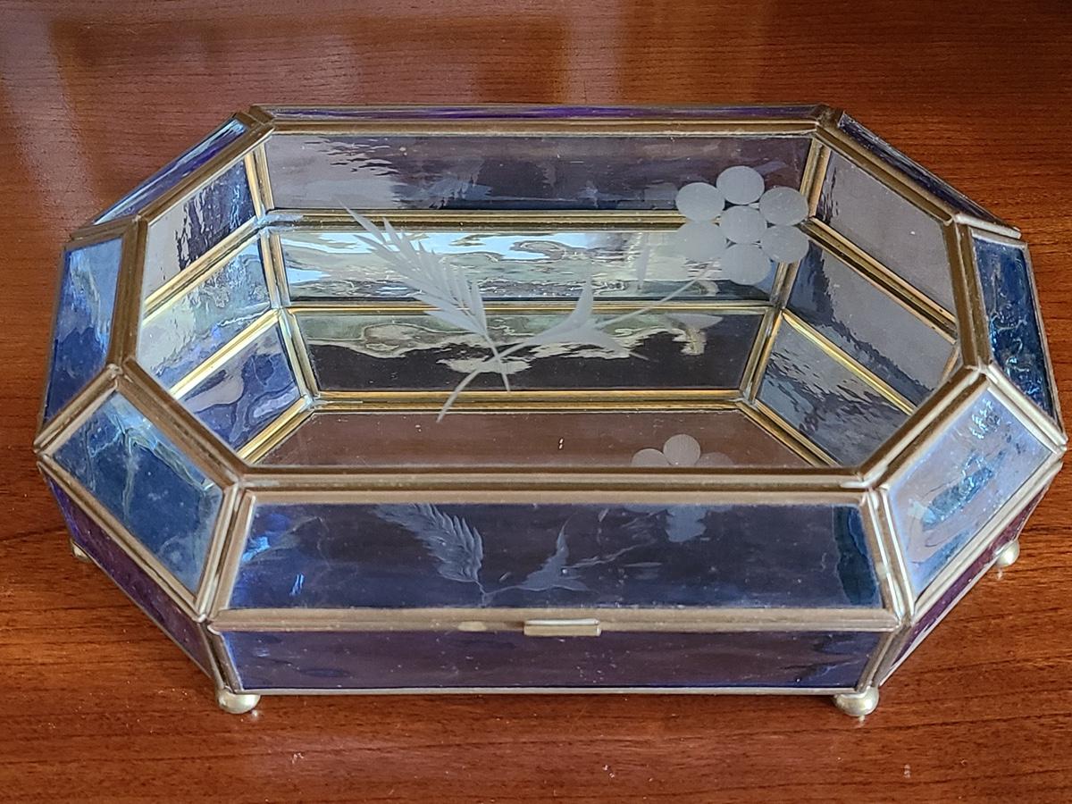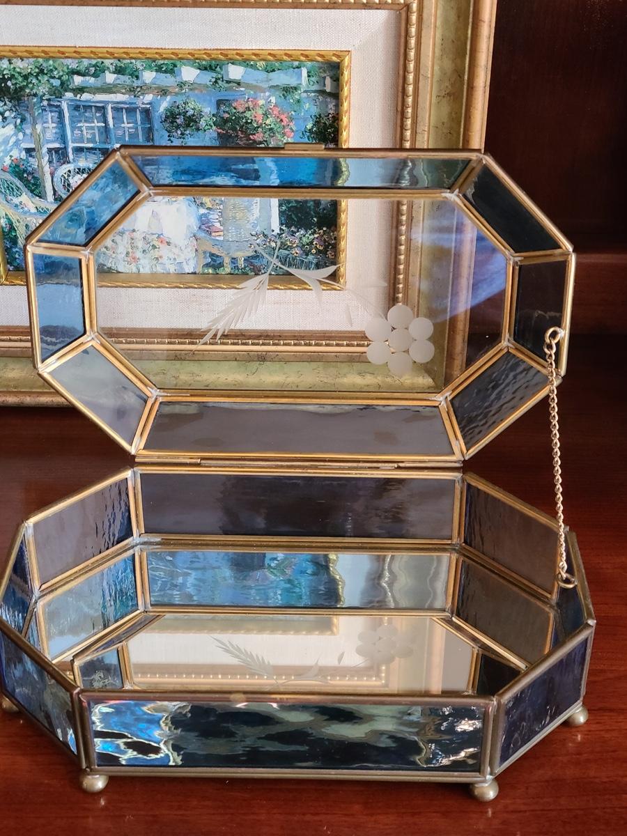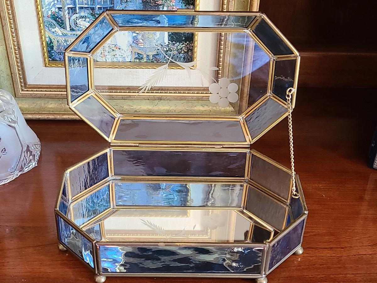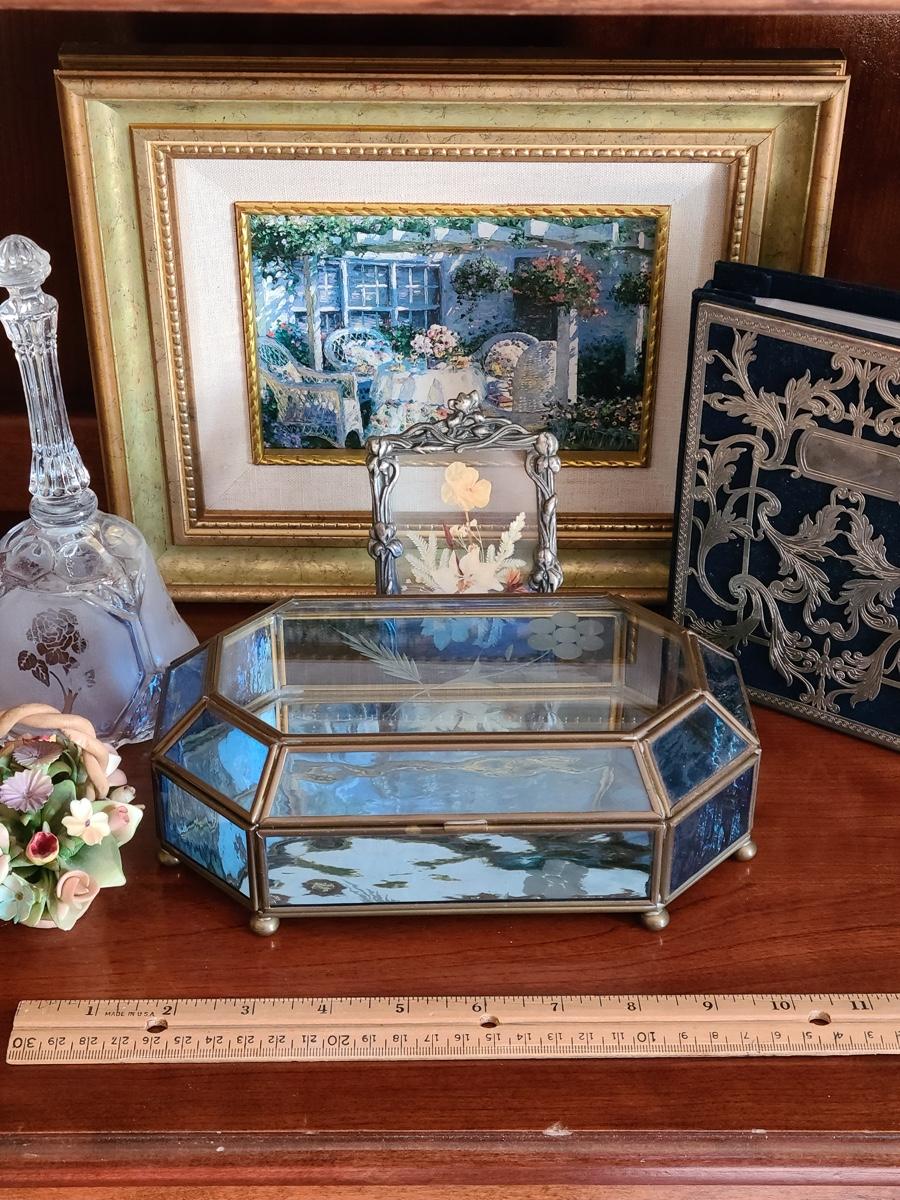 This is a lovely lot of home decor including a small painting on canvas in gold frame, a blue glass/etched floral mirrored jewelry box, crystal bell and more! Please see all pictures as they are the best representation of the items in the lot, the condition of the lot, and will show measurements if taken. If purchasing furniture you must be able to move yourself with your own help, and truck. .