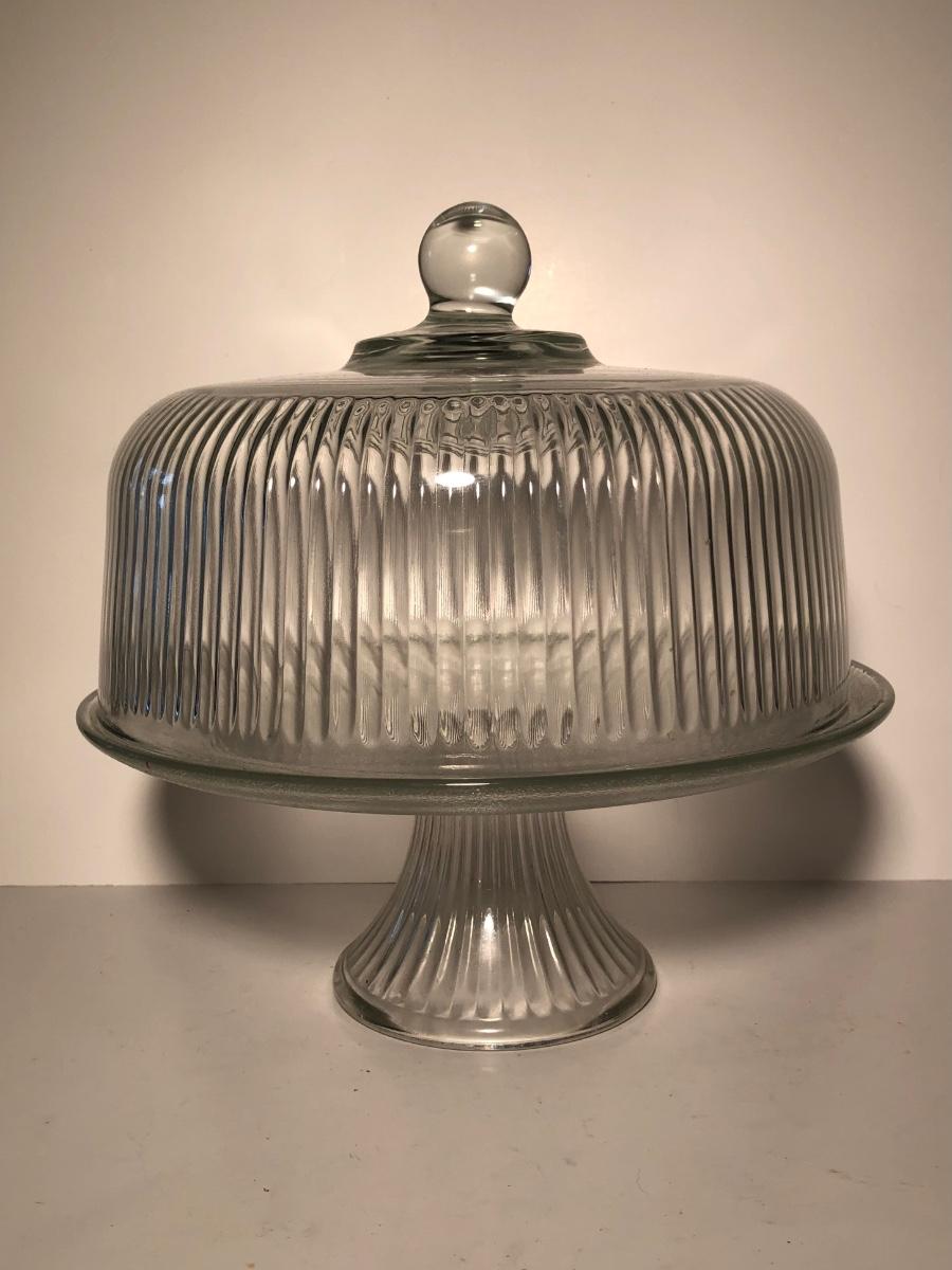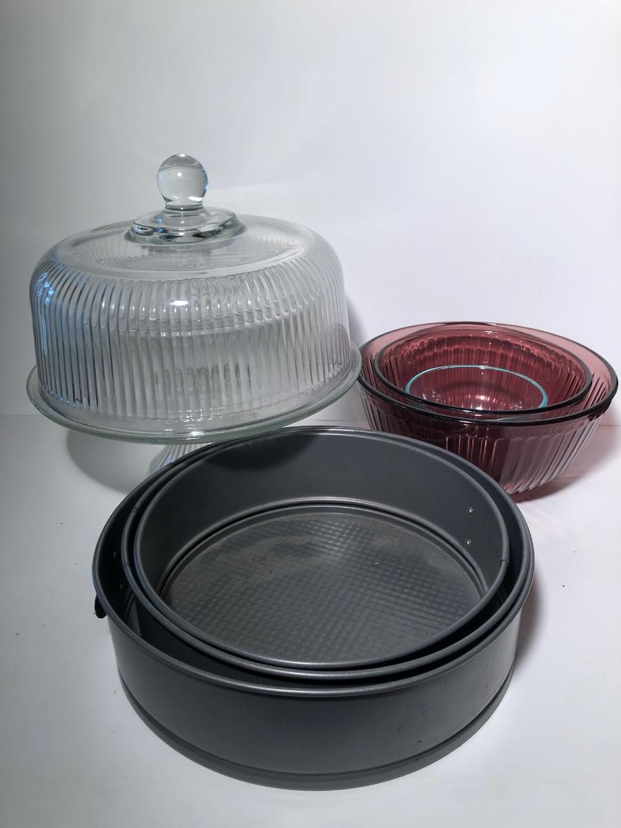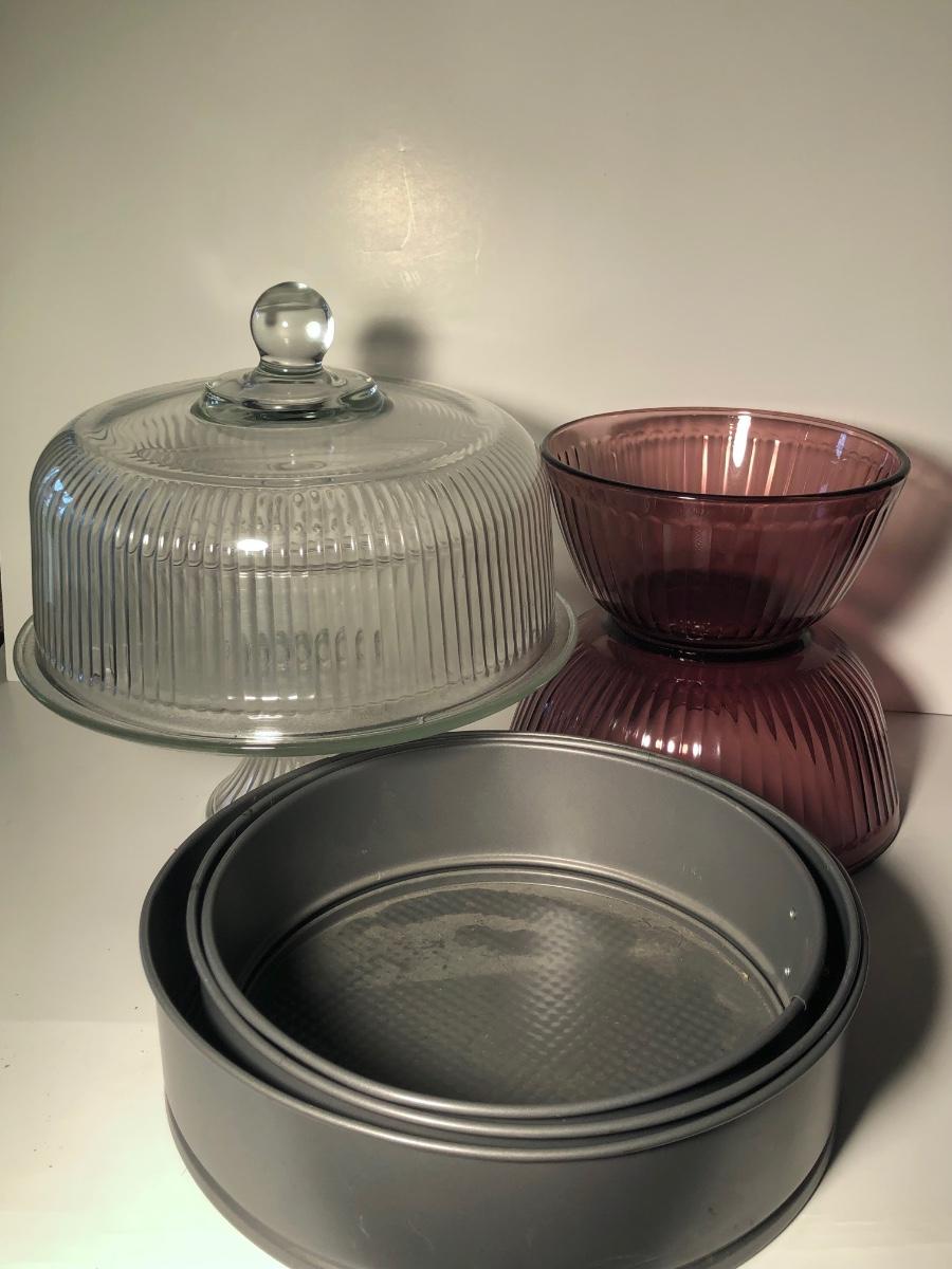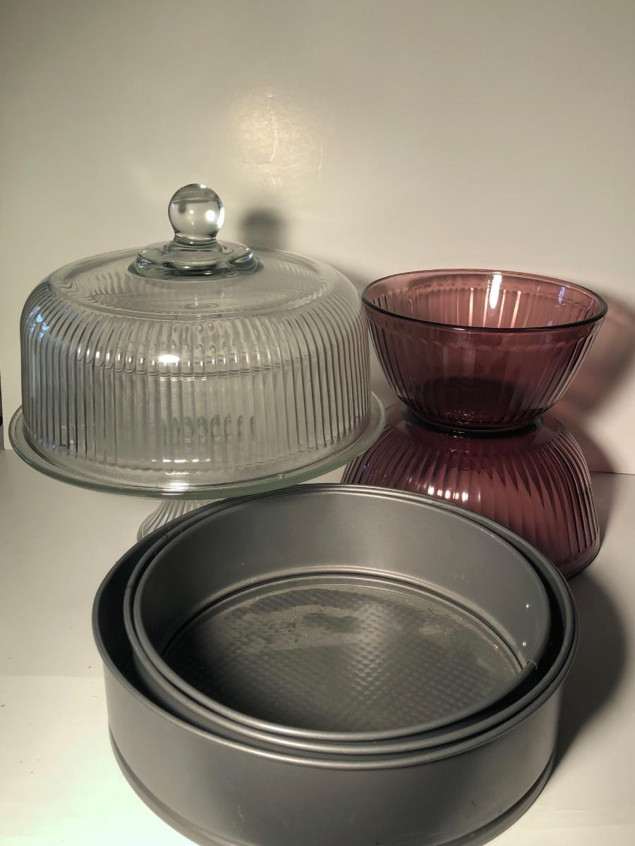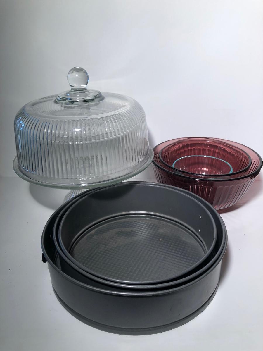 LOT 327L: Glass Cake Stand w/ Cloche, Spring Form Cake Pans & Pink Glass Pyrex Mixing Bowls