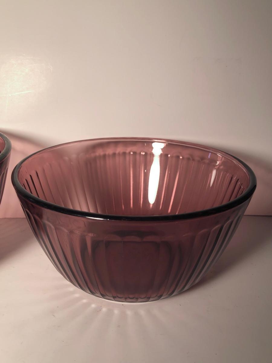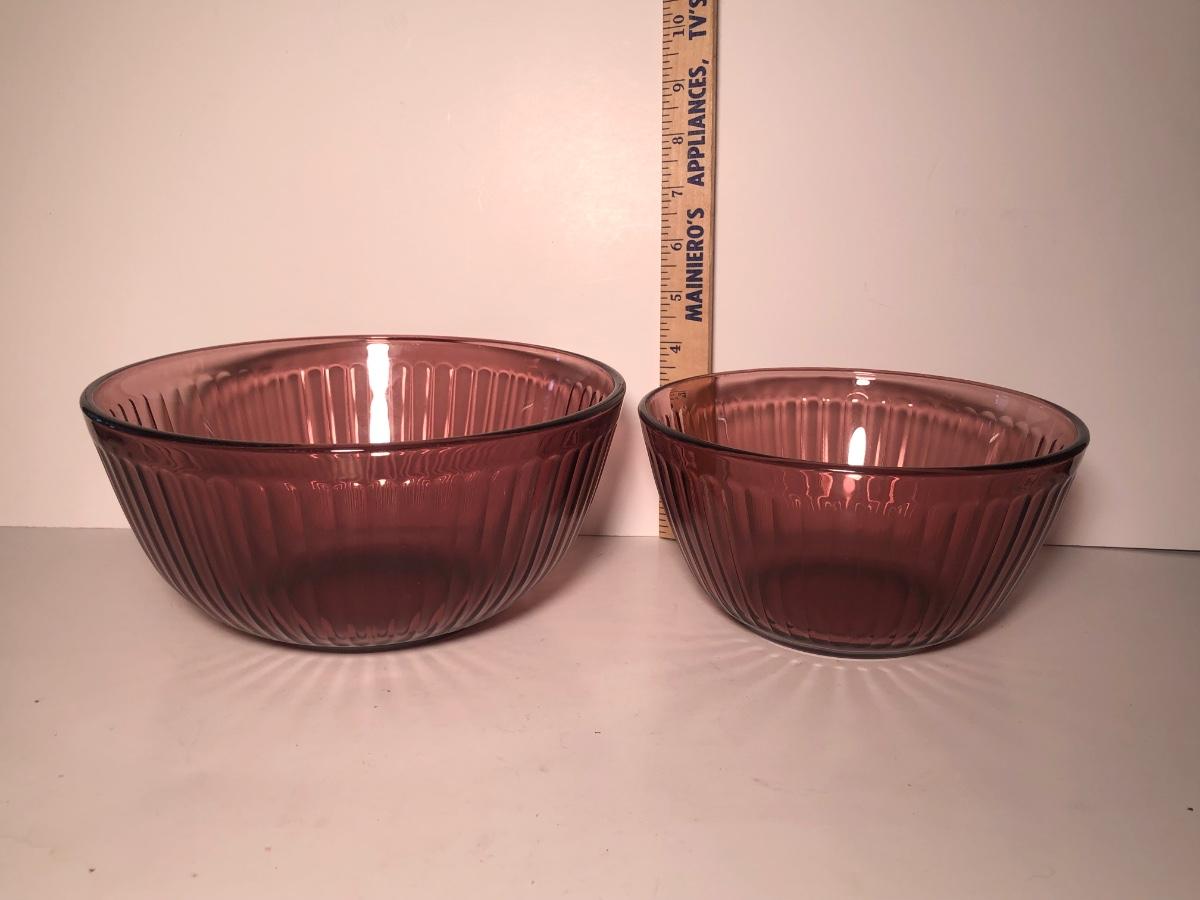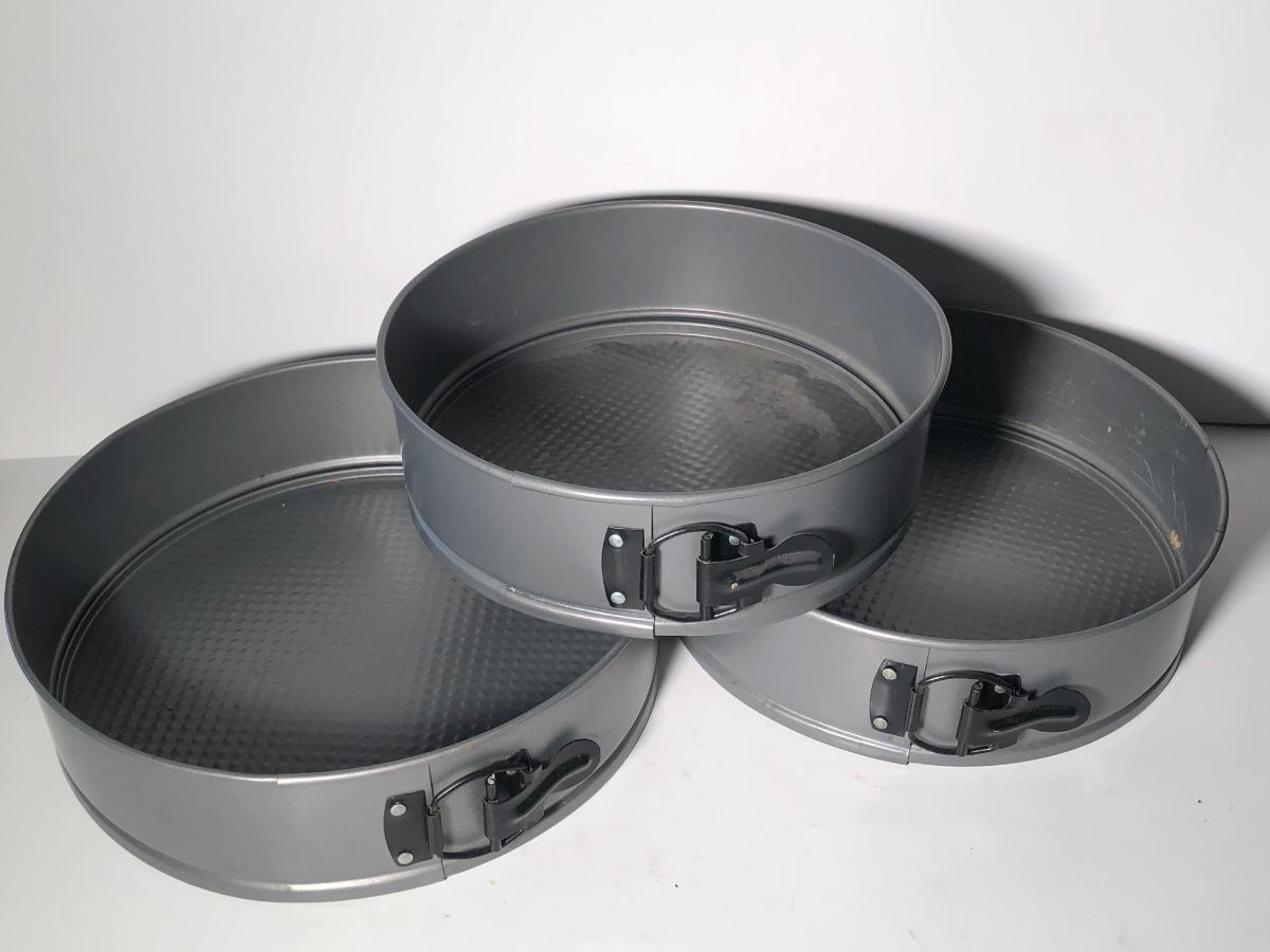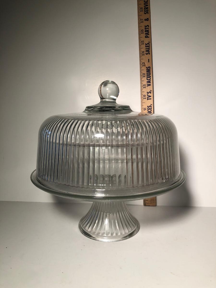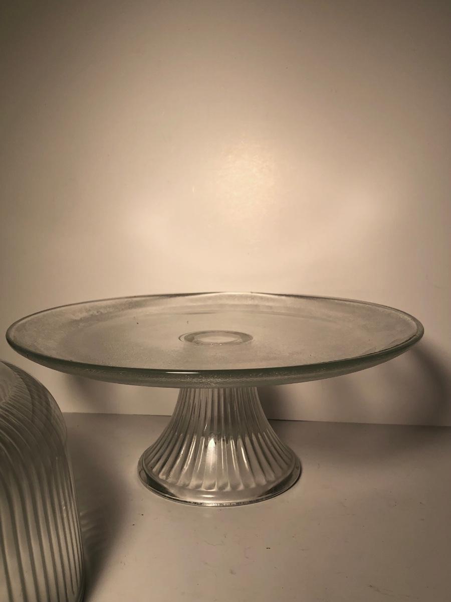 LOT 327L: Glass Cake Stand w/ Cloche, Spring Form Cake Pans & Pink Glass Pyrex Mixing Bowls