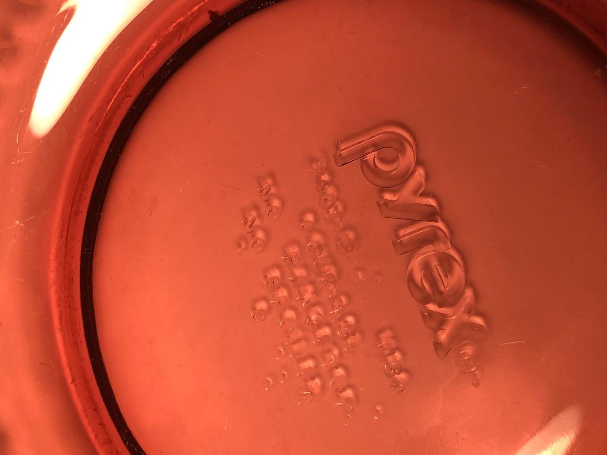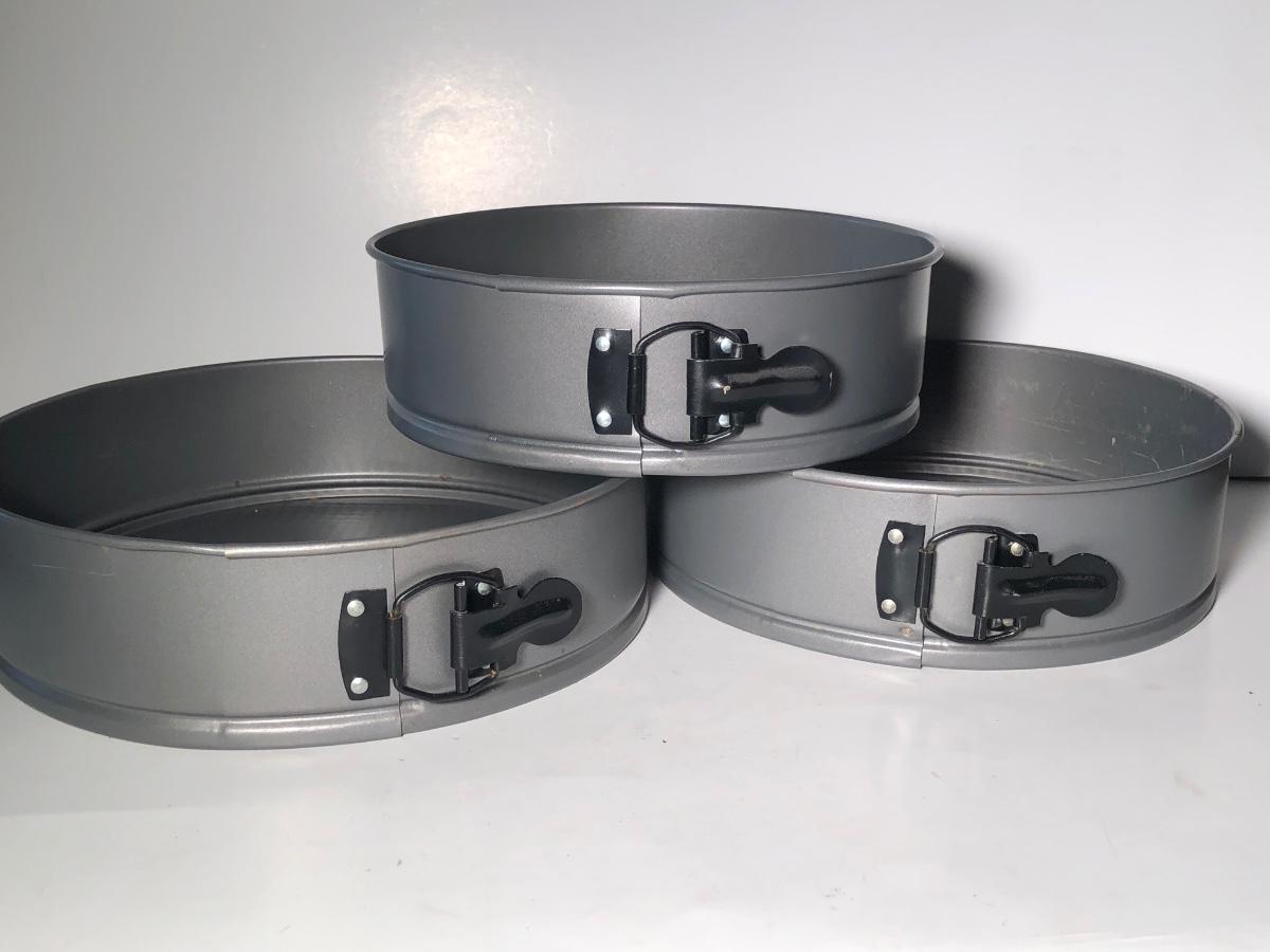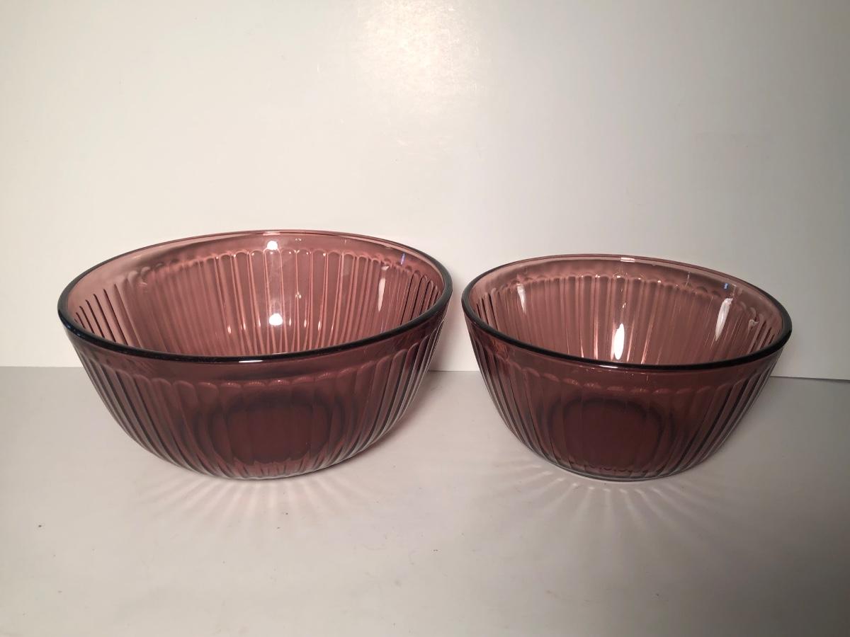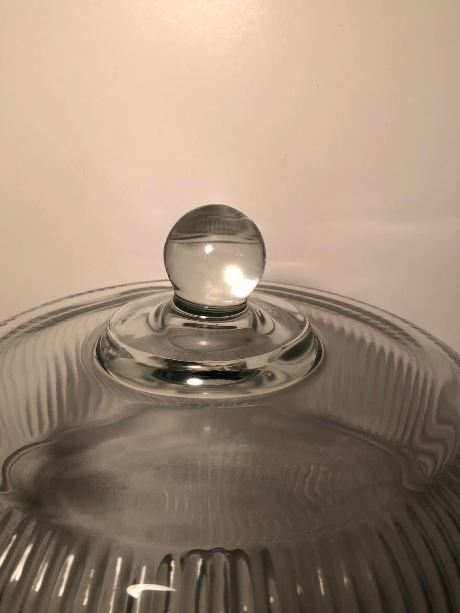 LOT 327L: Glass Cake Stand w/ Cloche, Spring Form Cake Pans & Pink Glass Pyrex Mixing Bowls