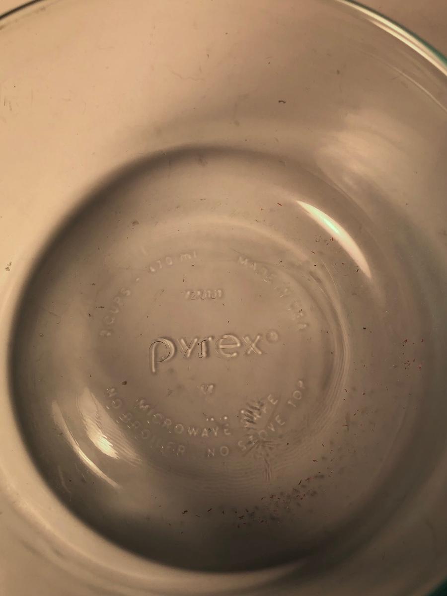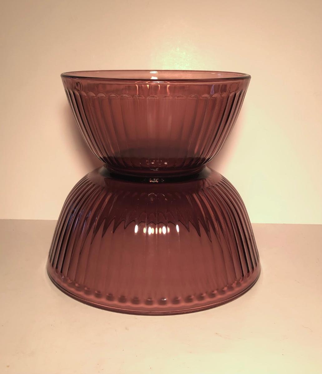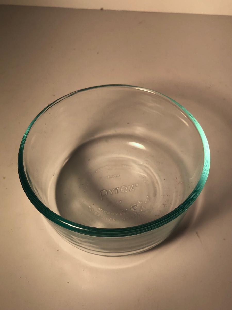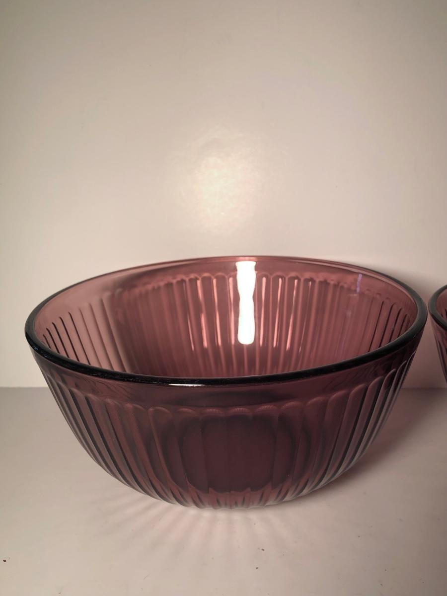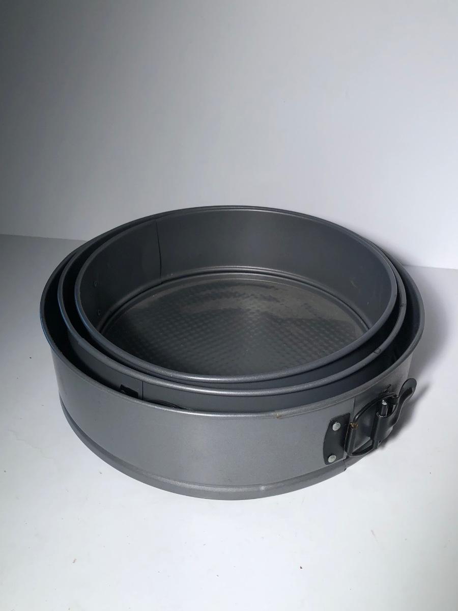 LOT 327L: Glass Cake Stand w/ Cloche, Spring Form Cake Pans & Pink Glass Pyrex Mixing Bowls