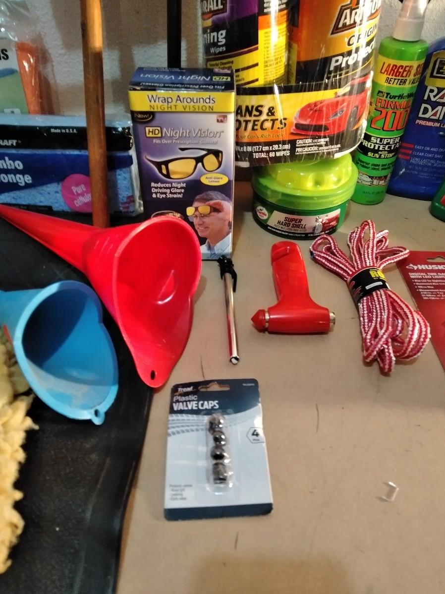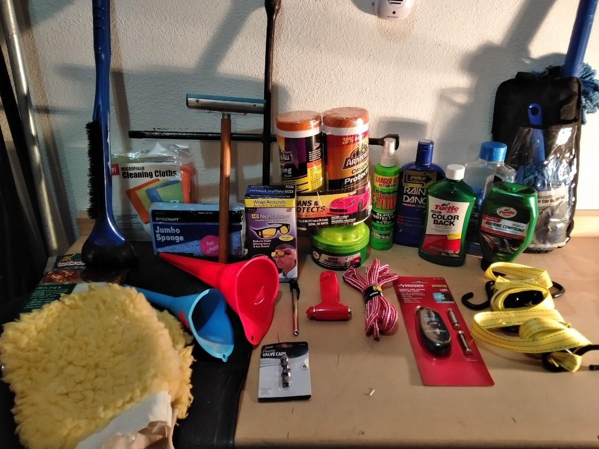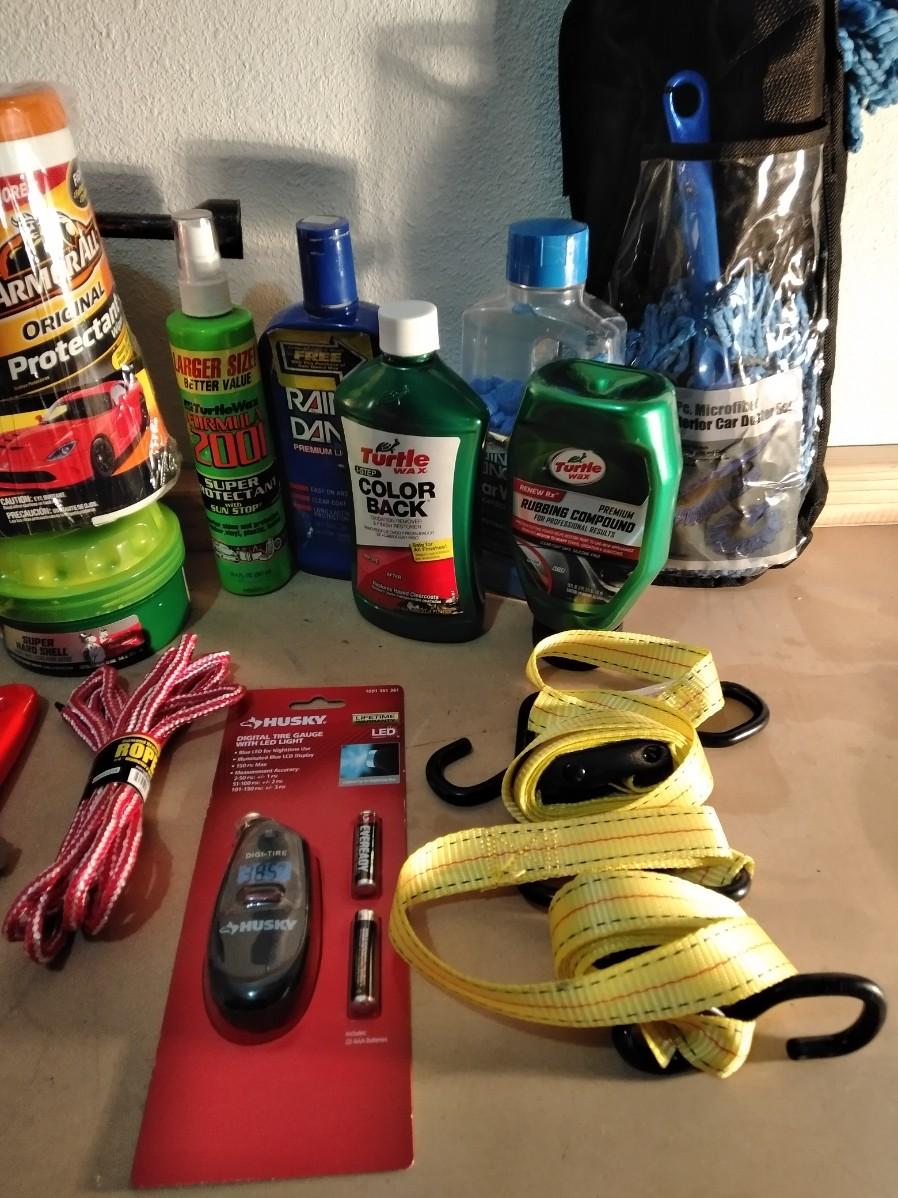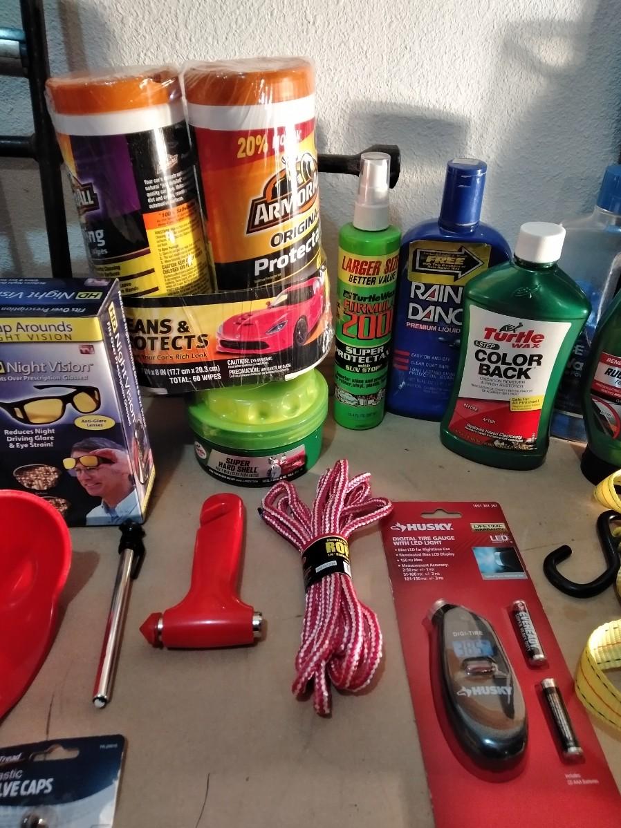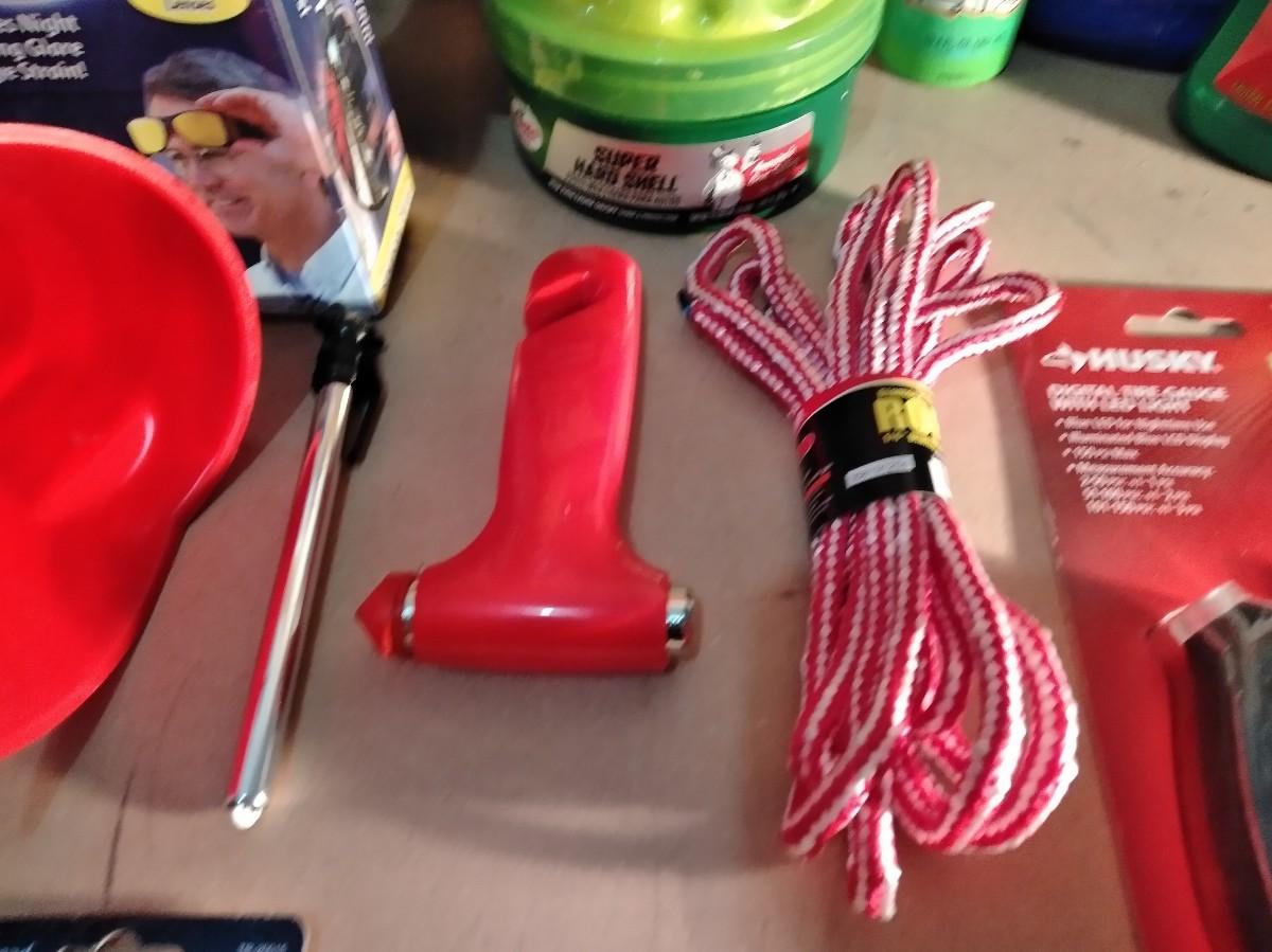 ARMORALL CLEANER, CAR POLISHES, ROPE, FUNNELS, ICE SCRAPER, RATCHET STRAPS, FOURWAY LUG WRENCH, AND MORE