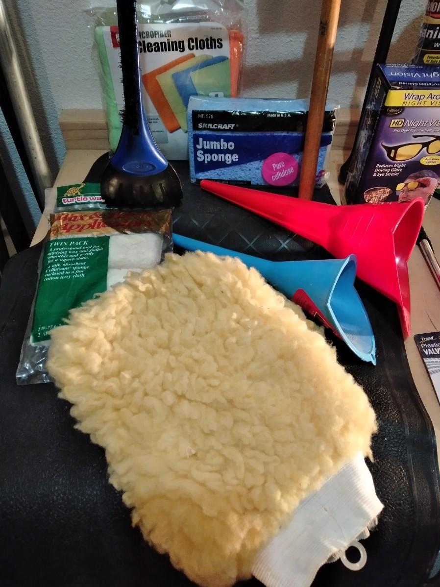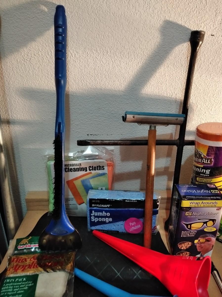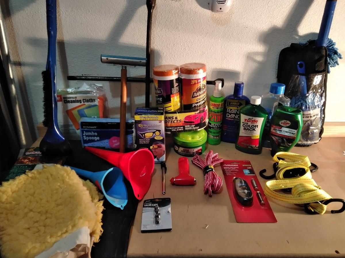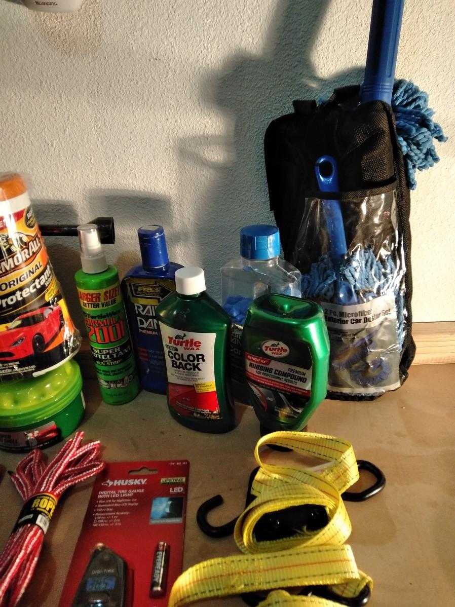ARMORALL CLEANER, CAR POLISHES, ROPE, FUNNELS, ICE SCRAPER, RATCHET STRAPS, FOURWAY LUG WRENCH, AND MORE