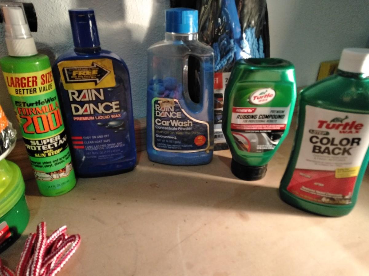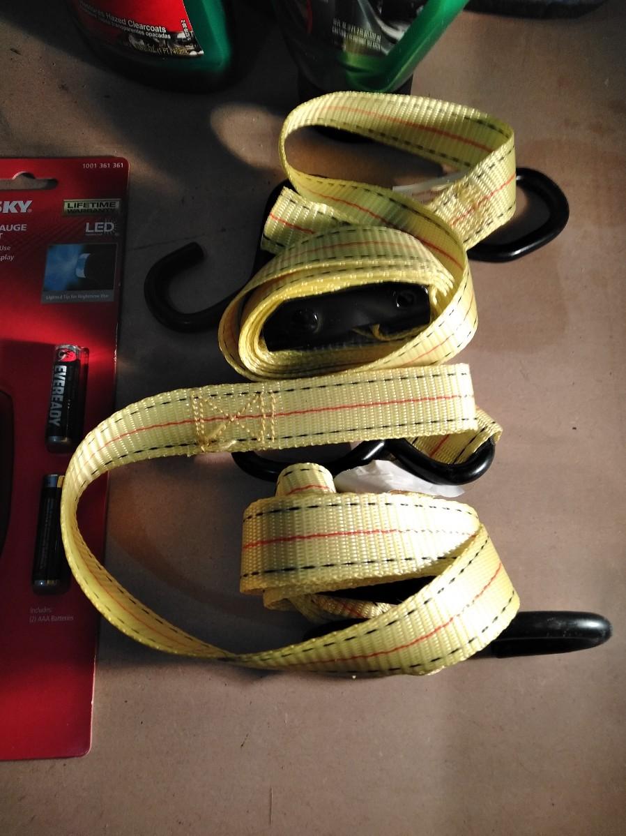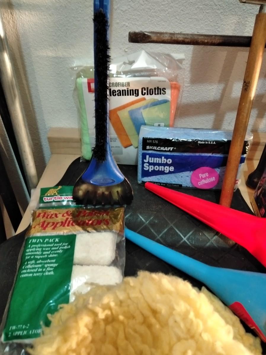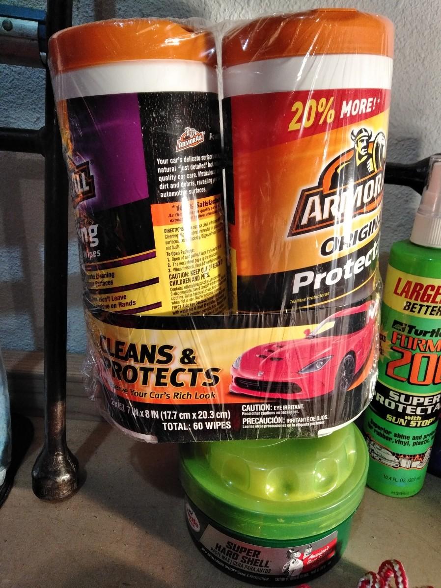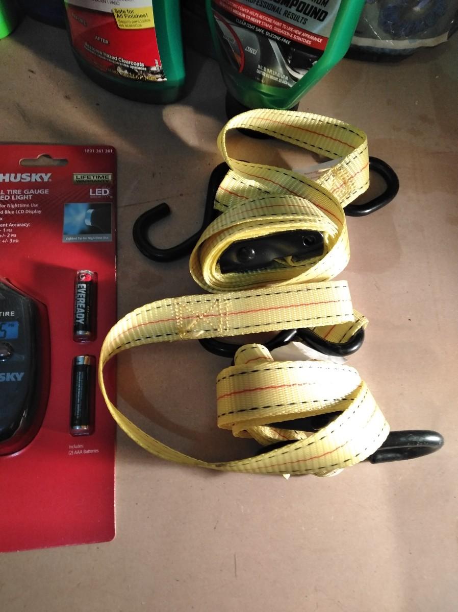 ARMORALL CLEANER, CAR POLISHES, ROPE, FUNNELS, ICE SCRAPER, RATCHET STRAPS, FOURWAY LUG WRENCH, AND MORE