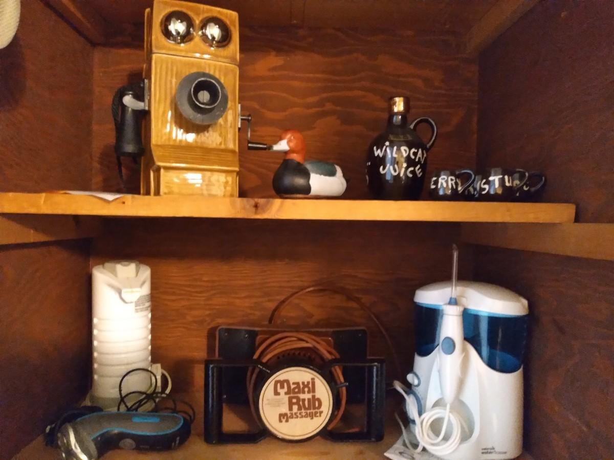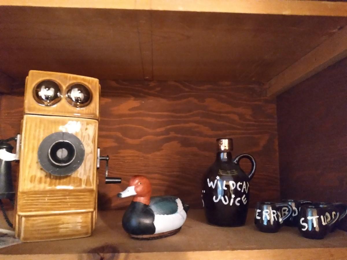 COLLECTIBLE VINTAGE PHONE JIMBEAM BOTTLE, WOODEN DUCK, SHAVING CREAM WARMER AND MORE