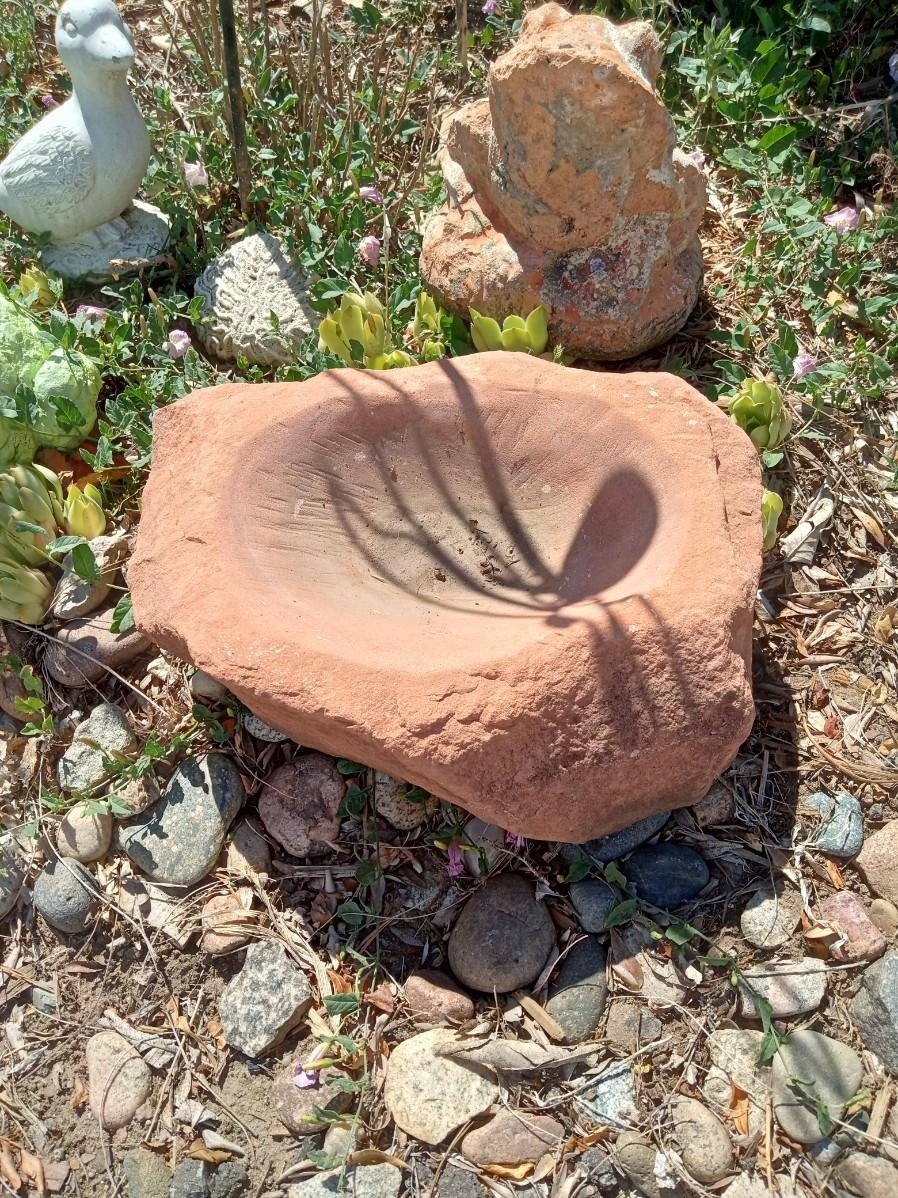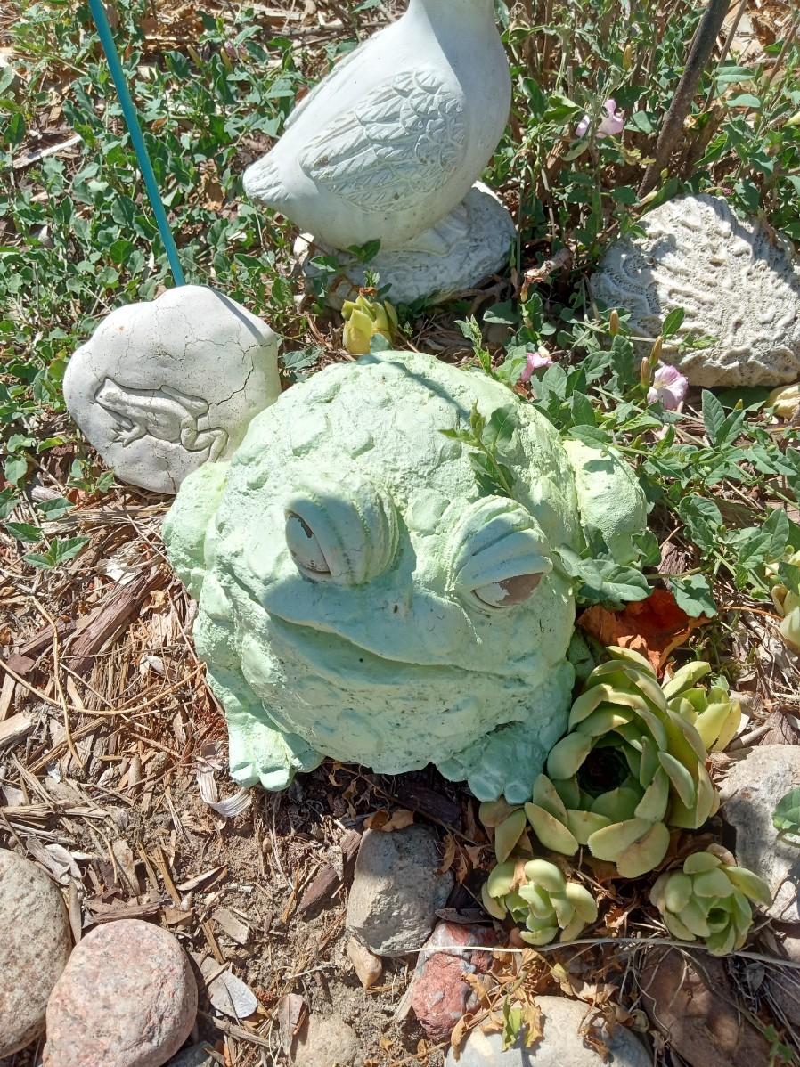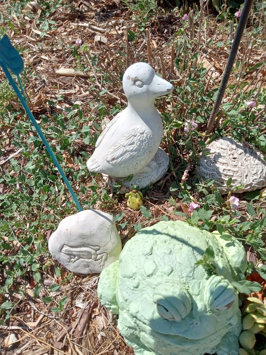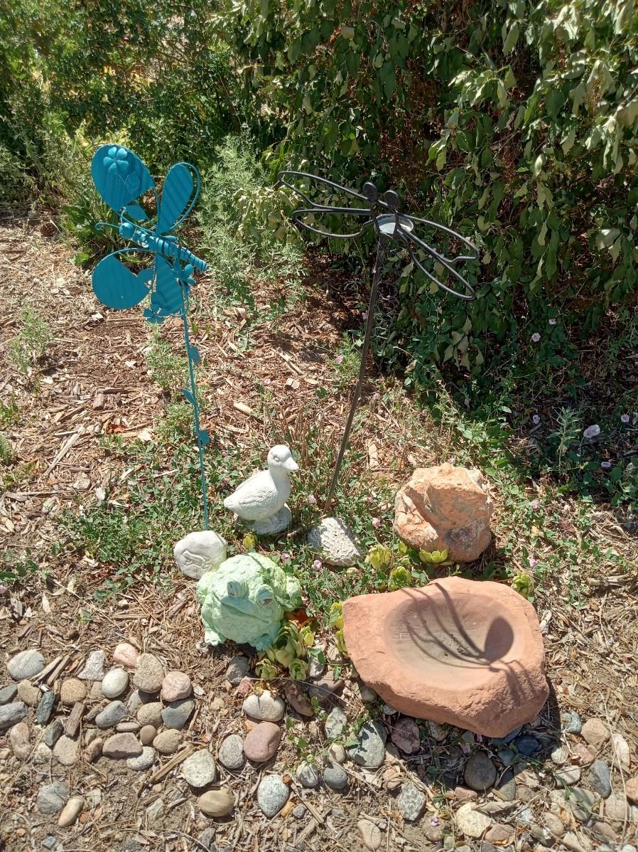 2 STAKED DRAGONFLIES, BUTTERFLY, 2 FROGS, A SMALL DUCK AND A ROCK WITH A POOL