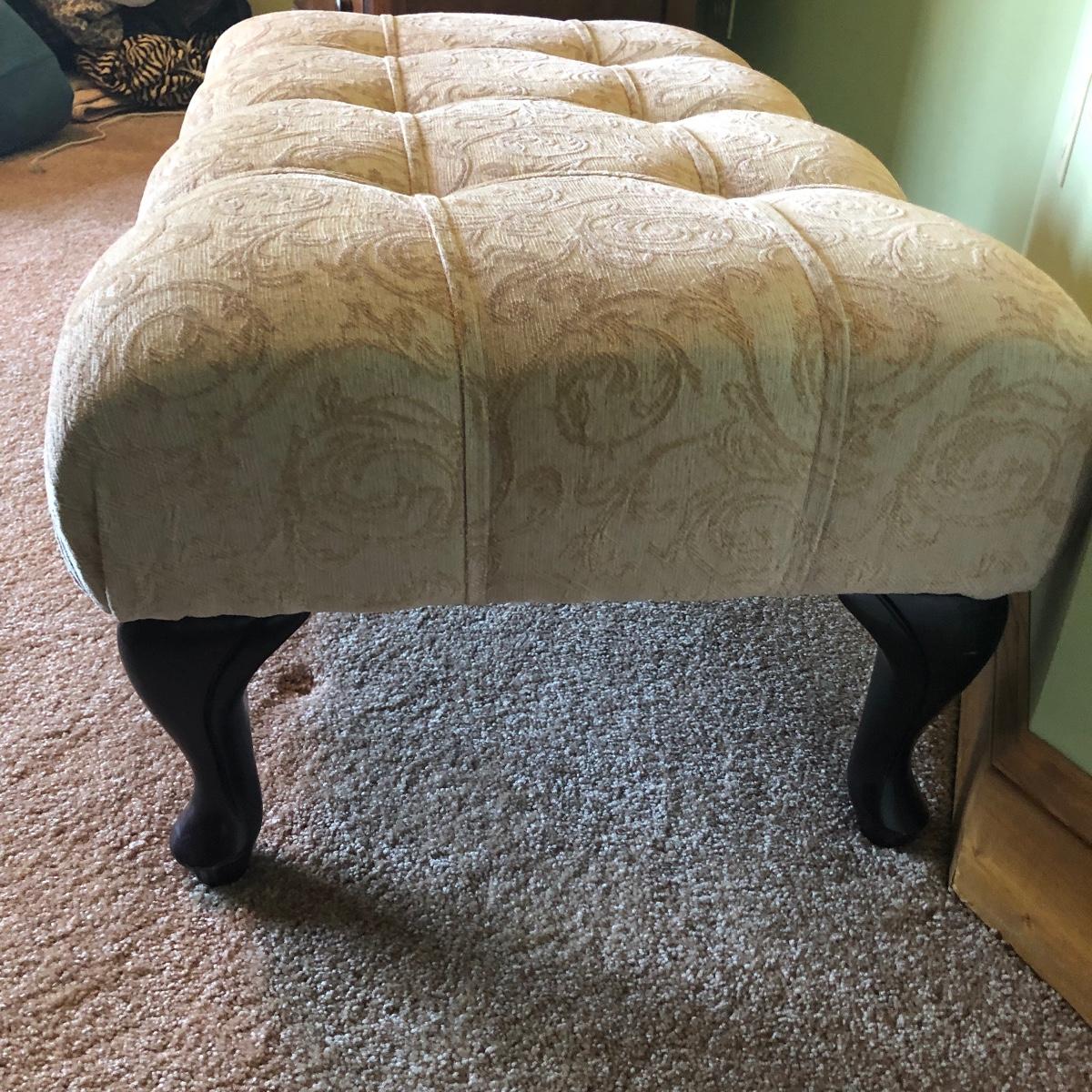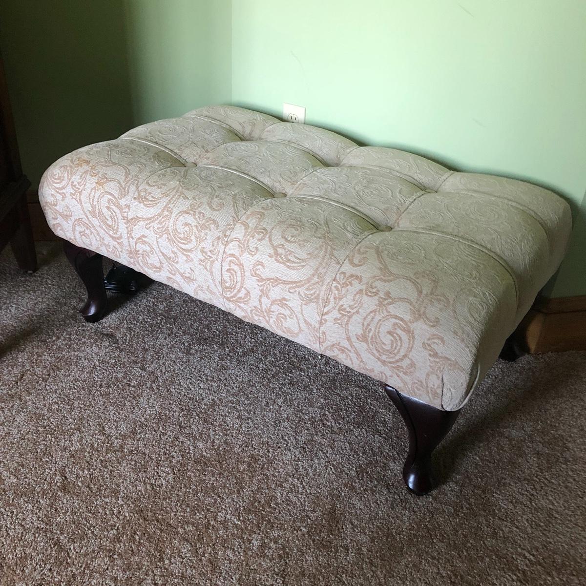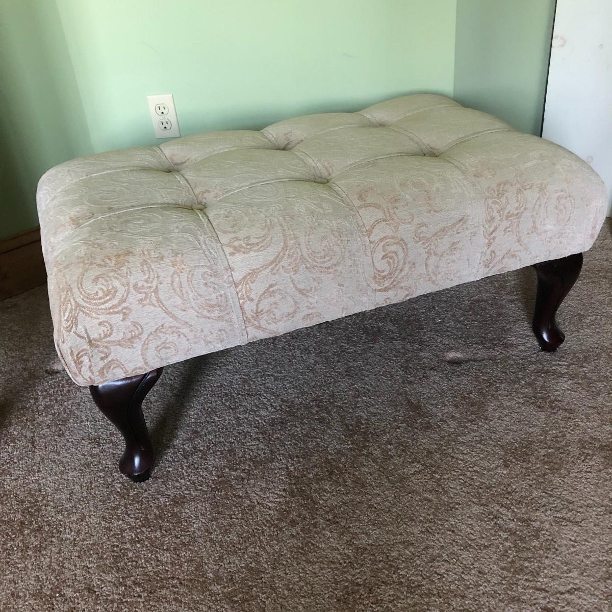 This large elegant ottoman is super clean and extremely attractive! A perfect addition to your primary bedroom or living room, this ottoman measures 23” x 38” x 36”. It is a lovely pale tan color with a raised slightly darker tan design and has very dark colored wood curved legs.