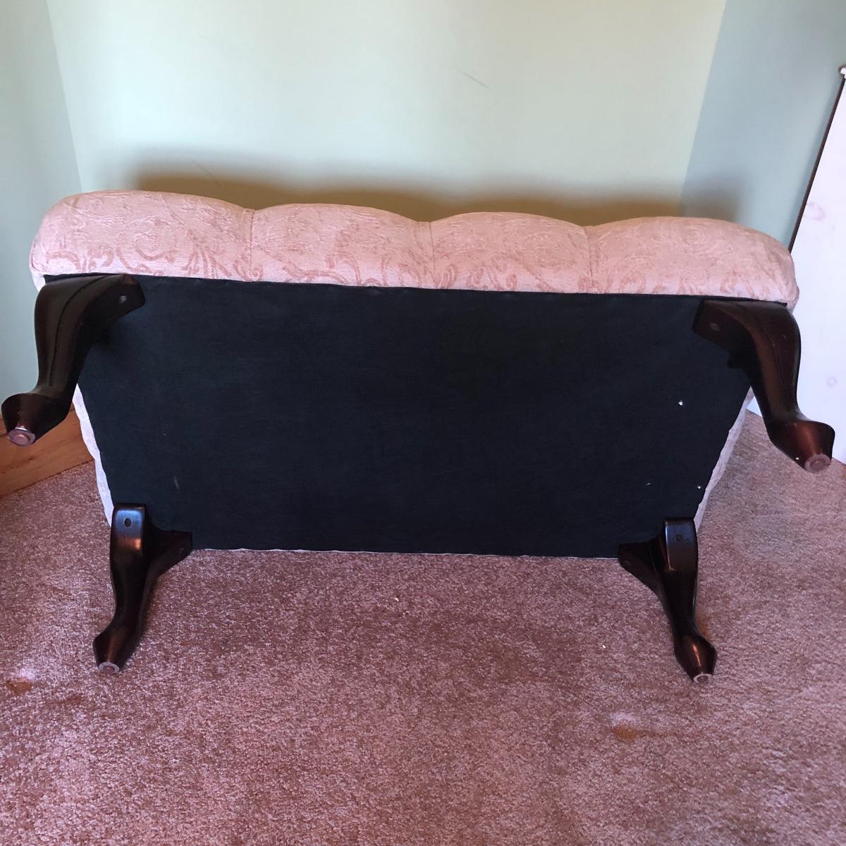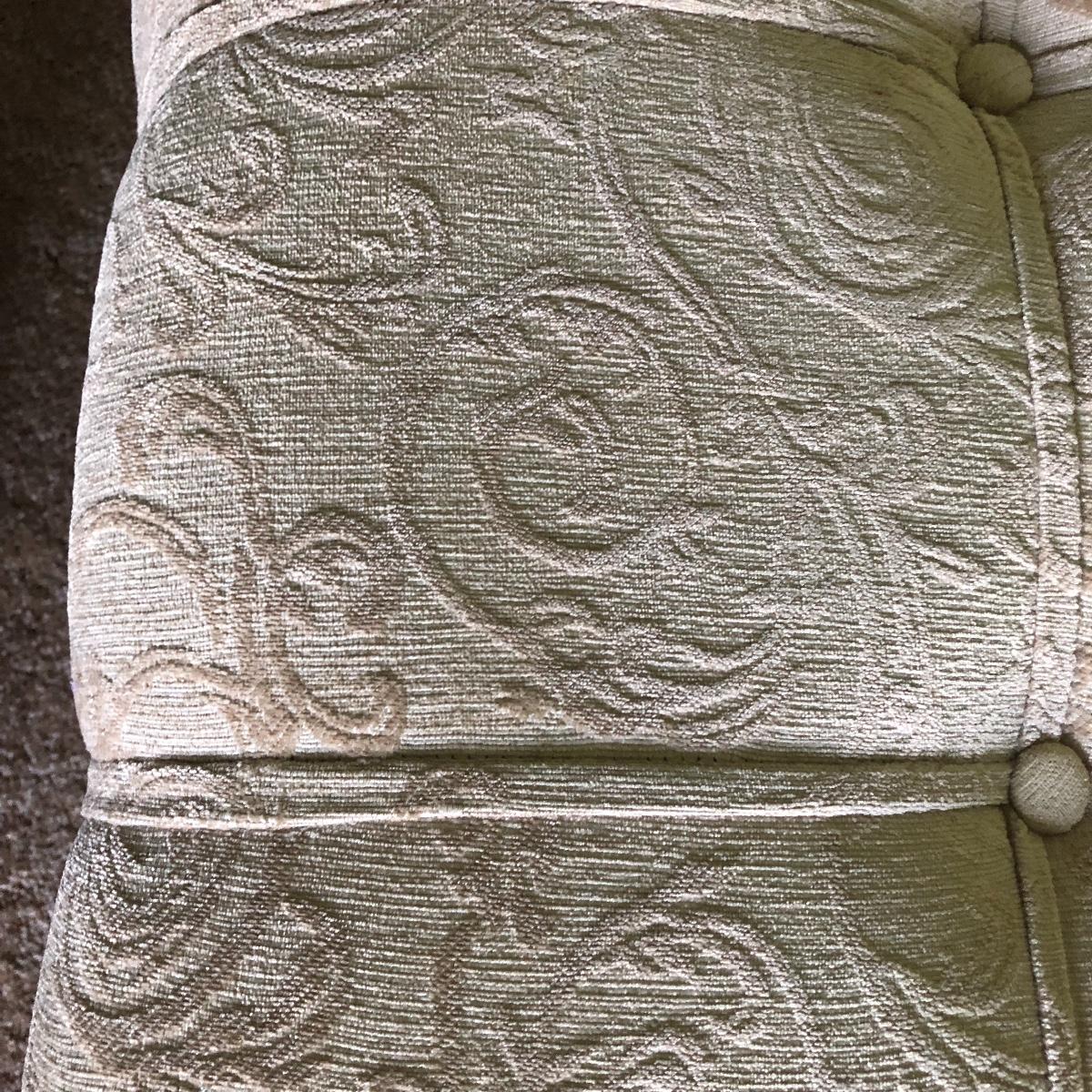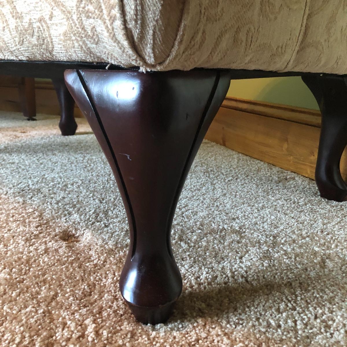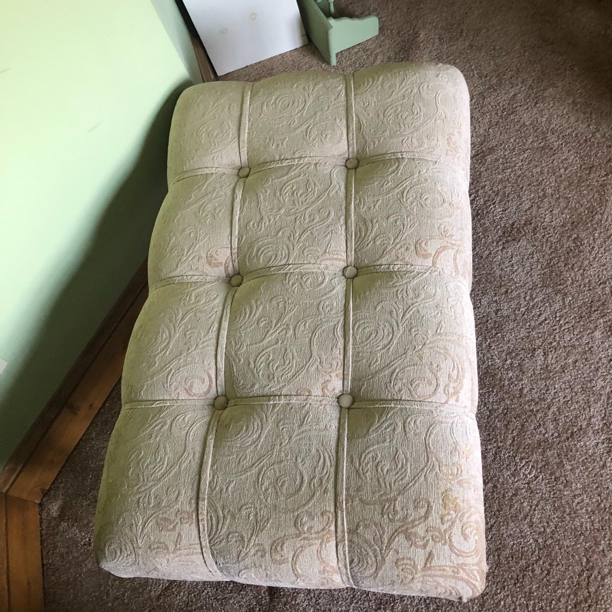 This large elegant ottoman is super clean and extremely attractive! A perfect addition to your primary bedroom or living room, this ottoman measures 23” x 38” x 36”. It is a lovely pale tan color with a raised slightly darker tan design and has very dark colored wood curved legs.