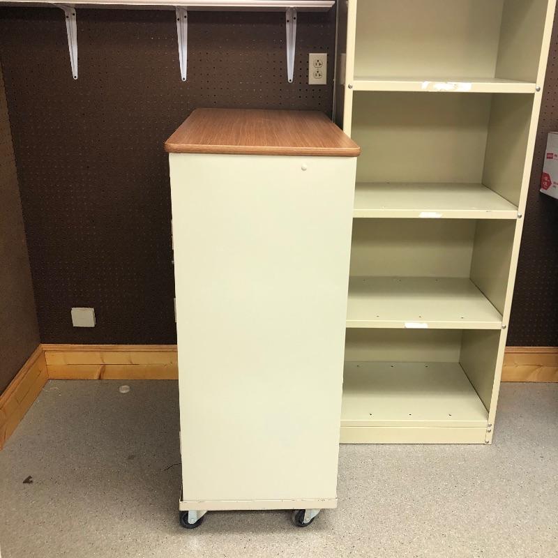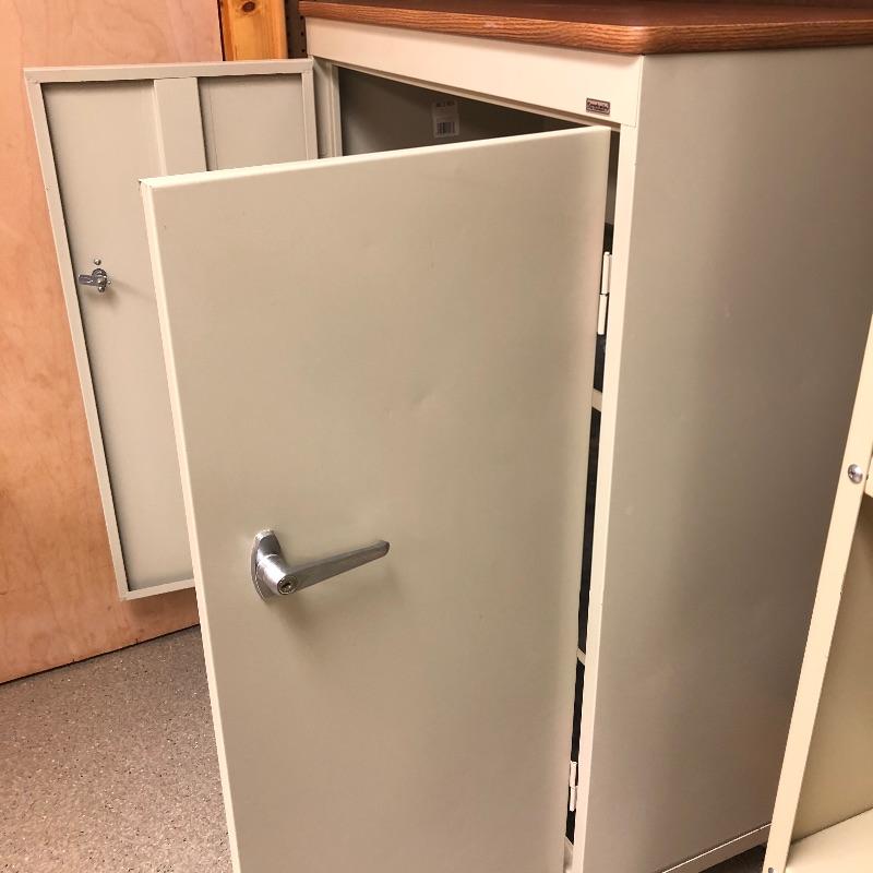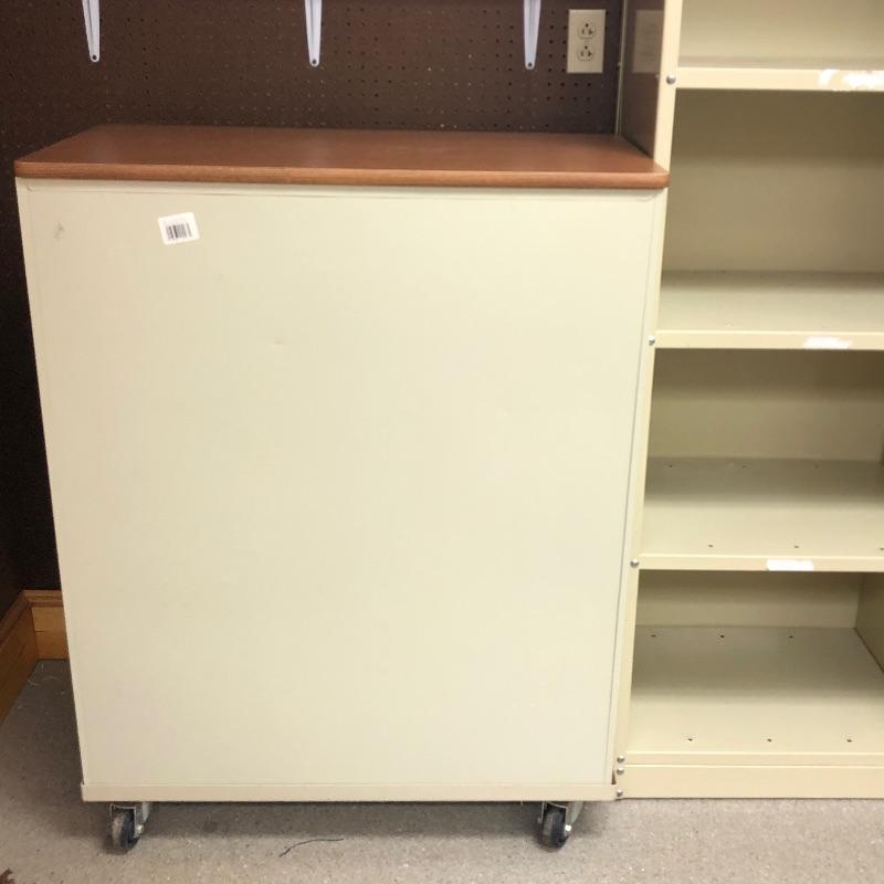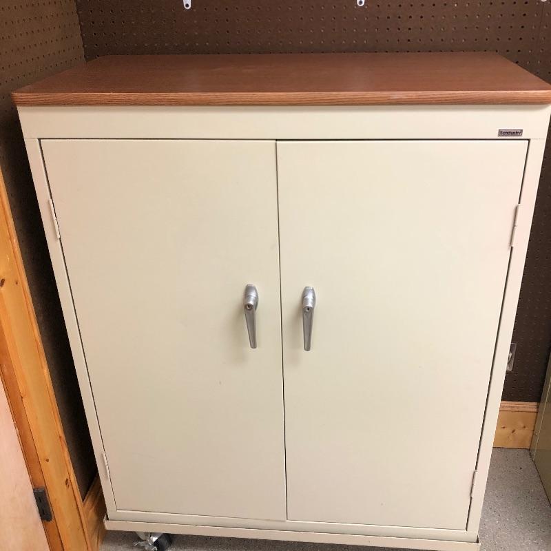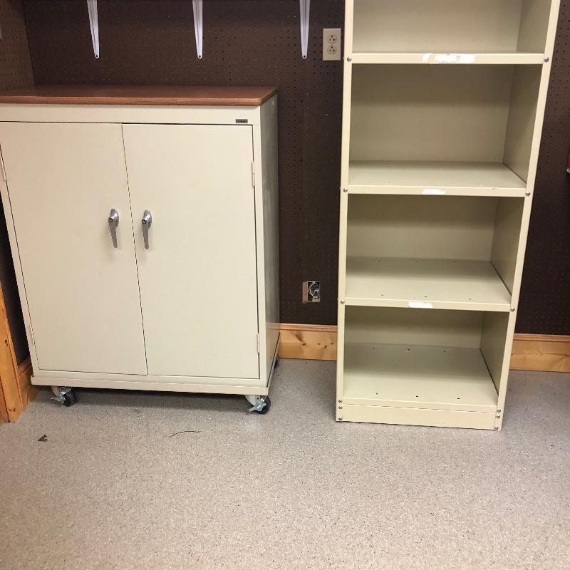 Super nice metal cabinet with manufactured wood top and casters. As an added bonus you also get the tall metal shelving unit. Tall unit measures 24” x 18” x 84”. Local pickup only.