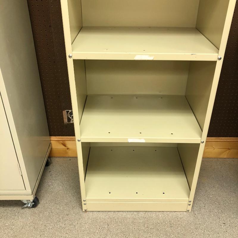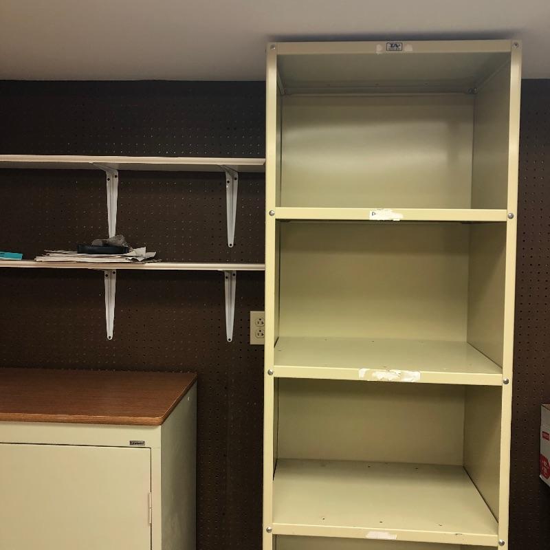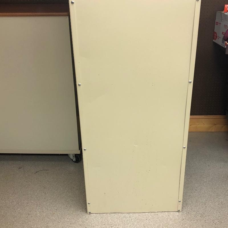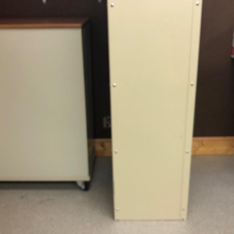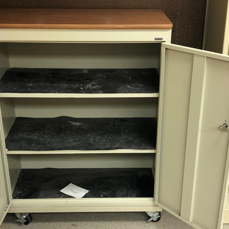 Super nice metal cabinet with manufactured wood top and casters. As an added bonus you also get the tall metal shelving unit. Tall unit measures 24” x 18” x 84”. Local pickup only.