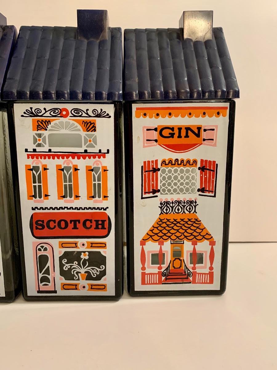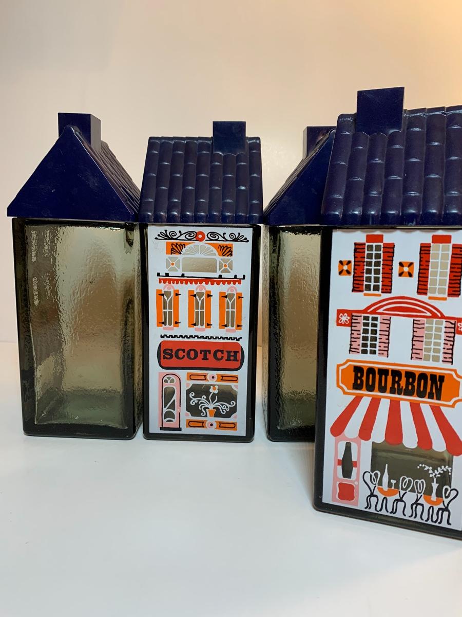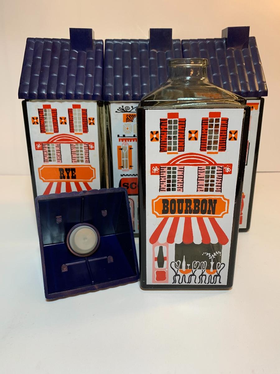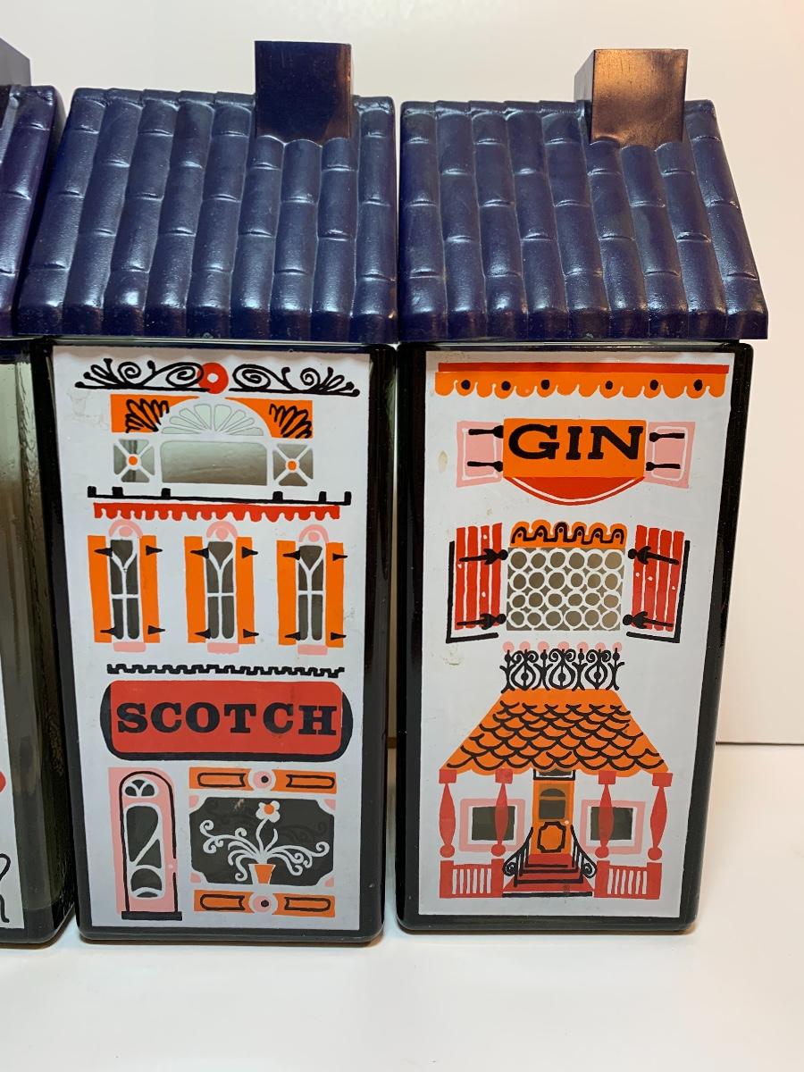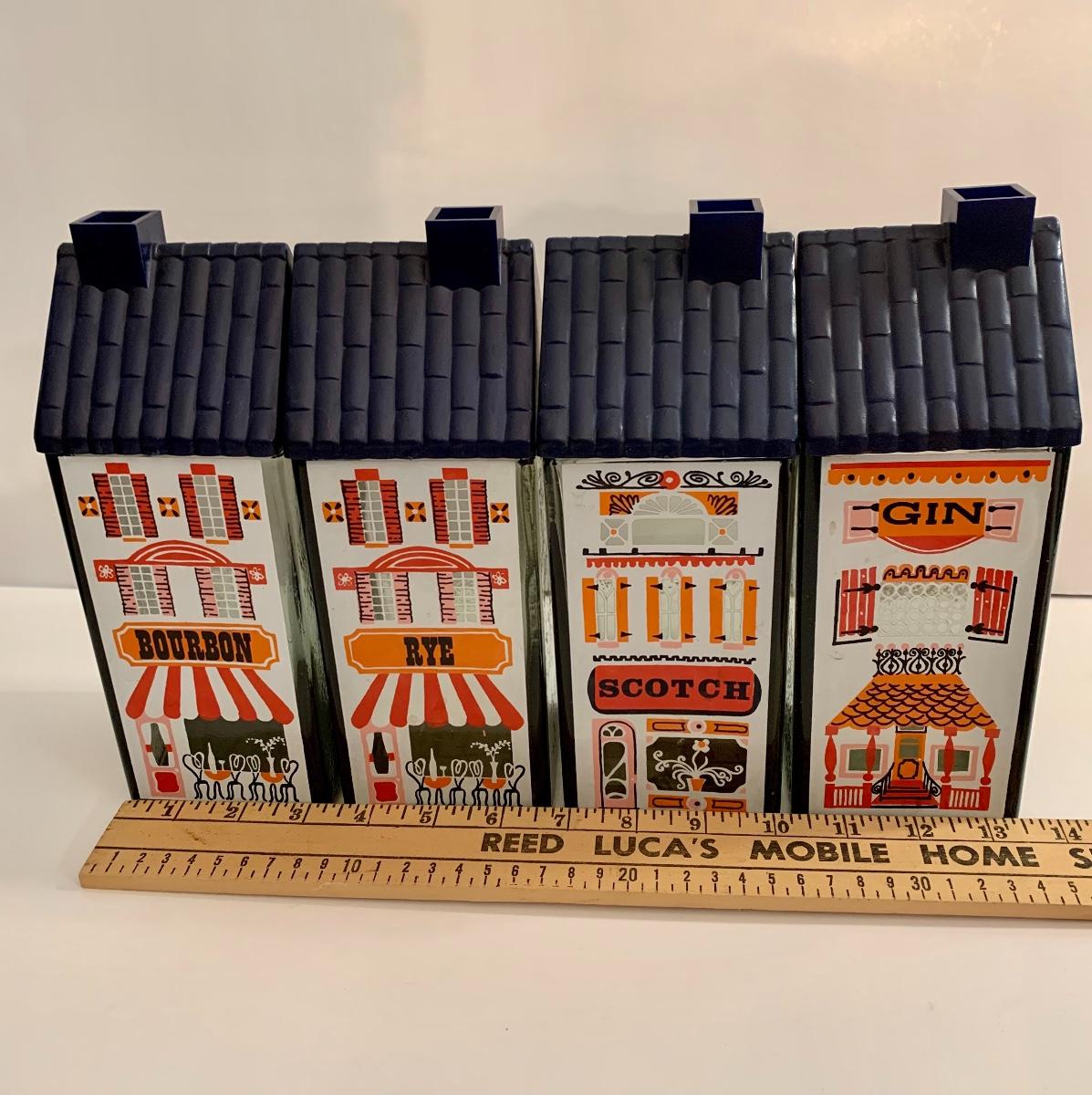 Designed to look like quaint row house shop fronts. This colorful has 4 bottle each with a unique design. Each bottle is square with large plastic lids that are shaped like roofs with chimney's. Bourbon, Rye, Scotch and Gin. No corks, can use wine corks if you want. Please see all pictures as they are the best representation of the items. The pictures show condition, measurements if taken, and what is included in the lot. Due to the large amount that we photograph and the time frame, we are not always able to take measurements. All items unless noted, are pre-owned and have been used. If you purchased furniture, you must bring help. We do not allow one person to carry large furniture out on their own. Bring help, tools and a truck for the safety of our client’s homes, and your personal safety. Company policy. Thank you.