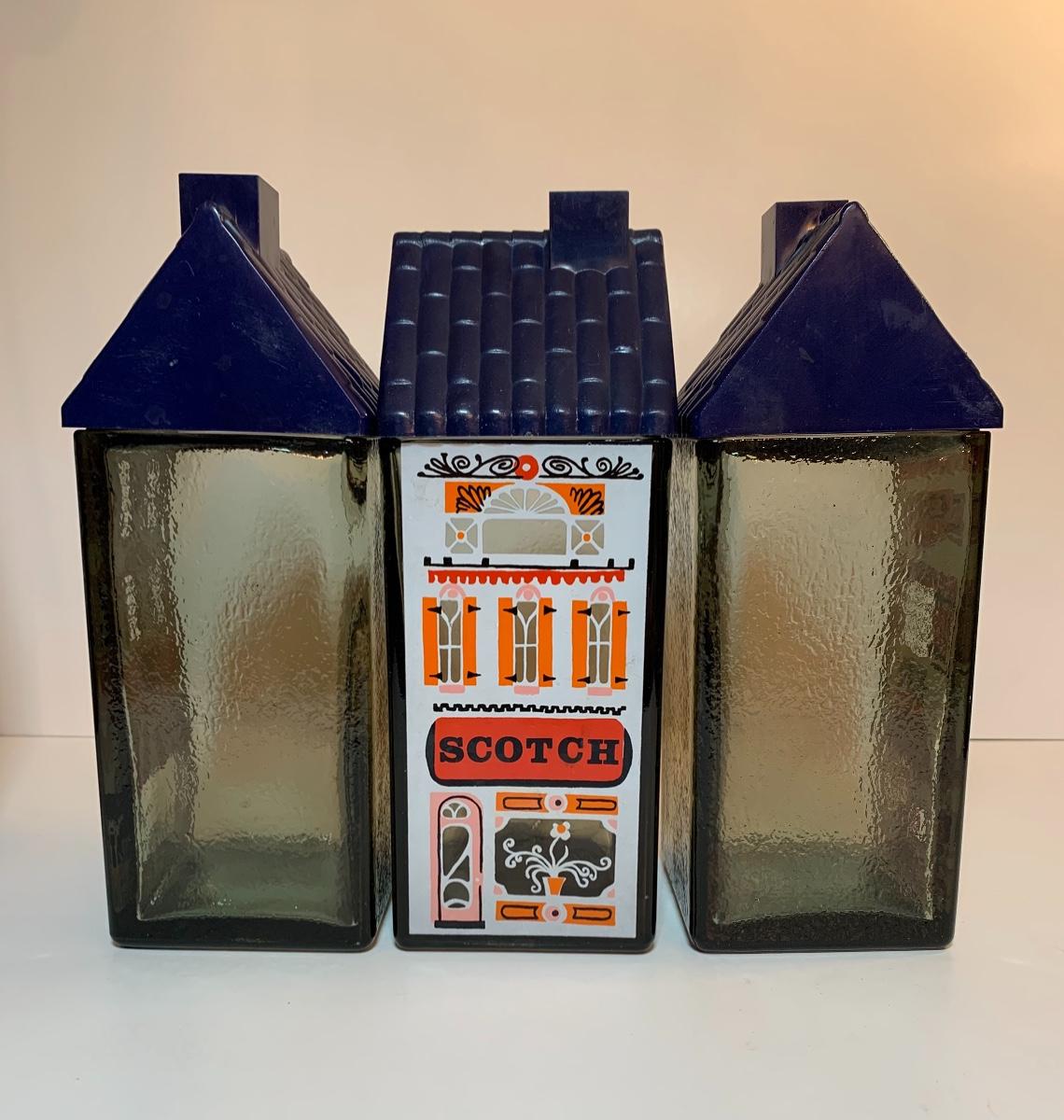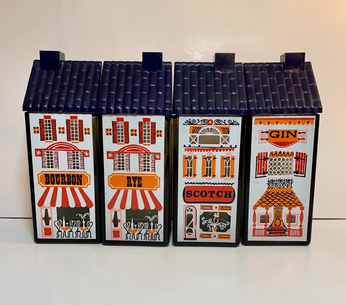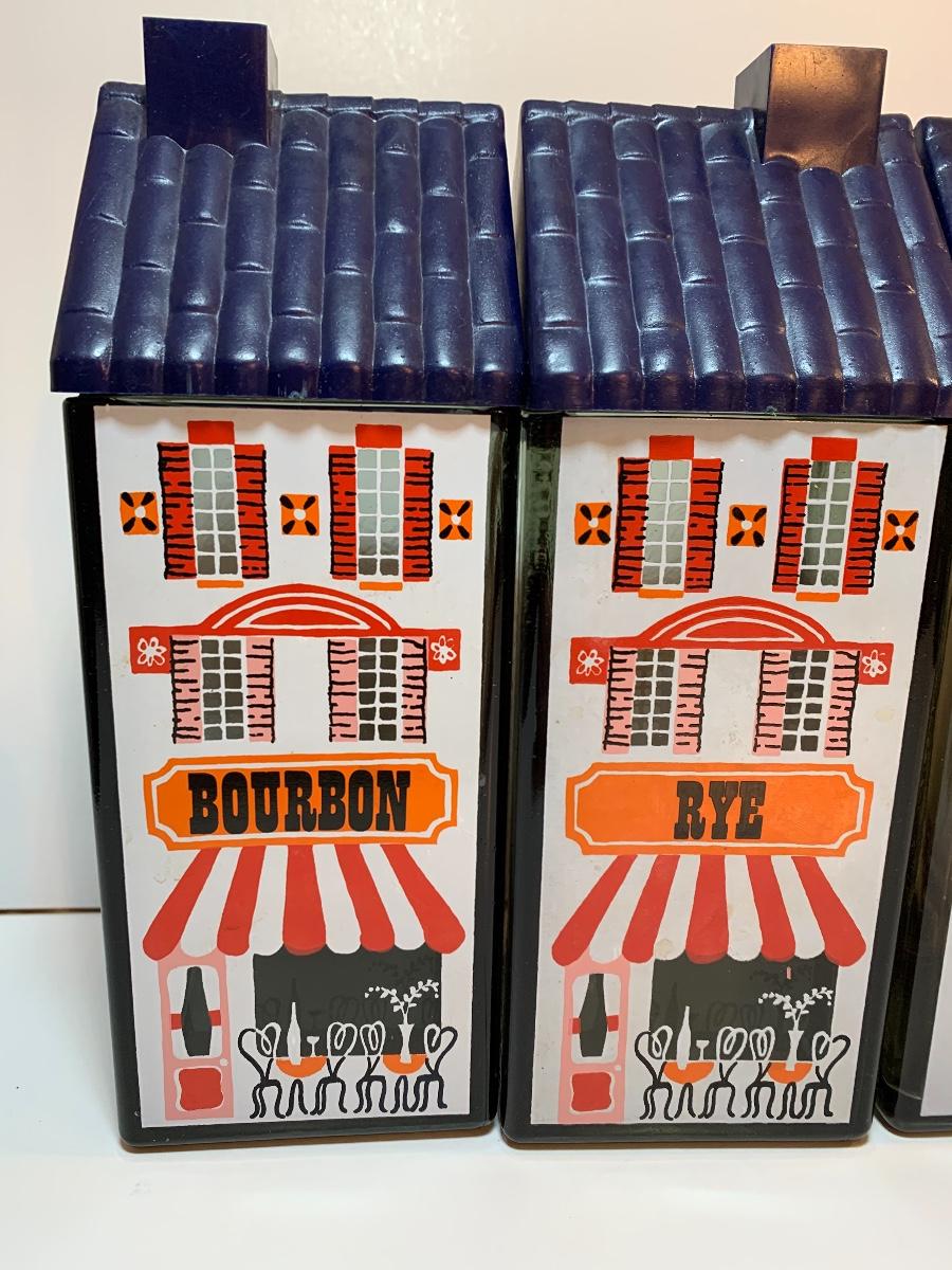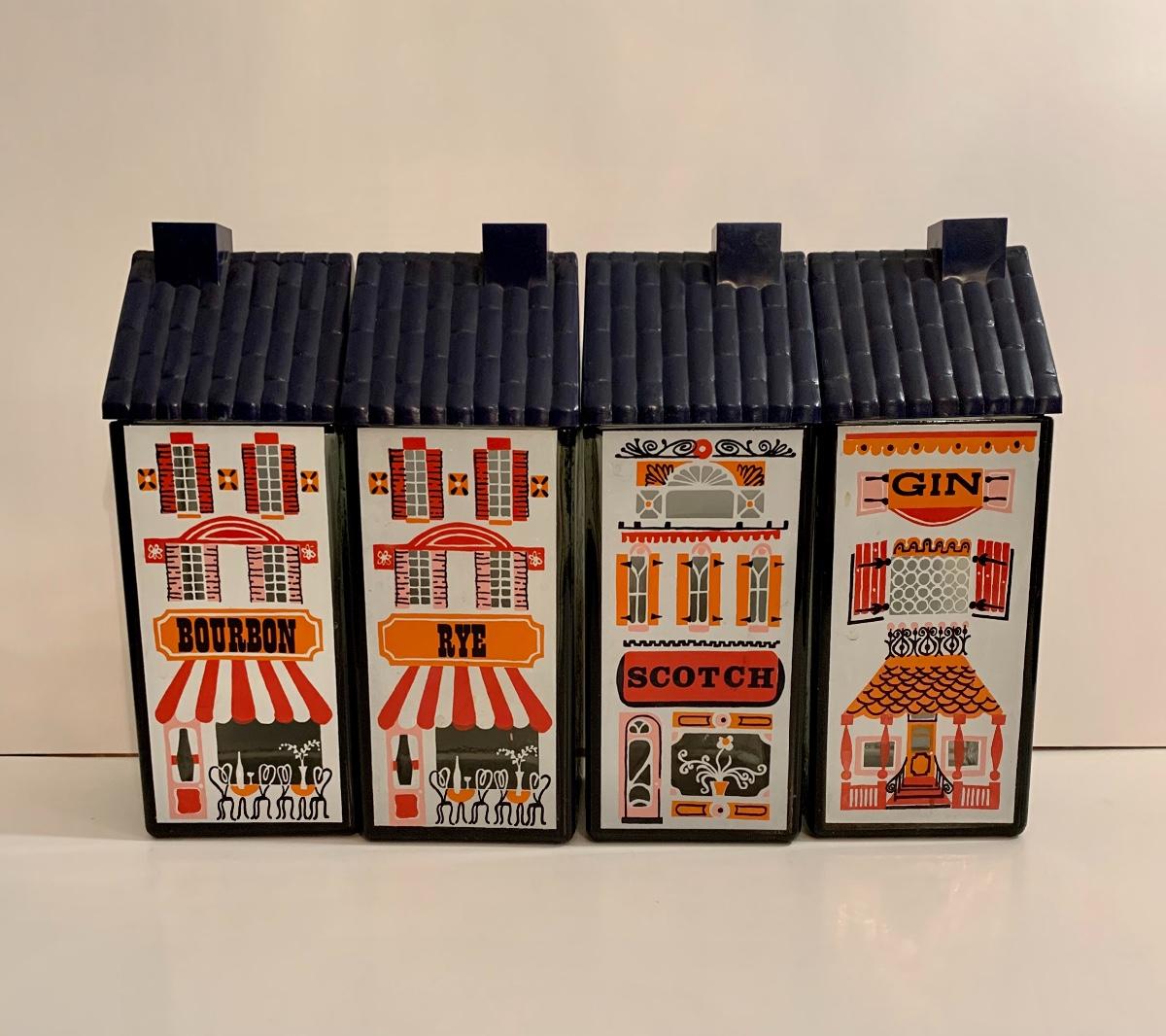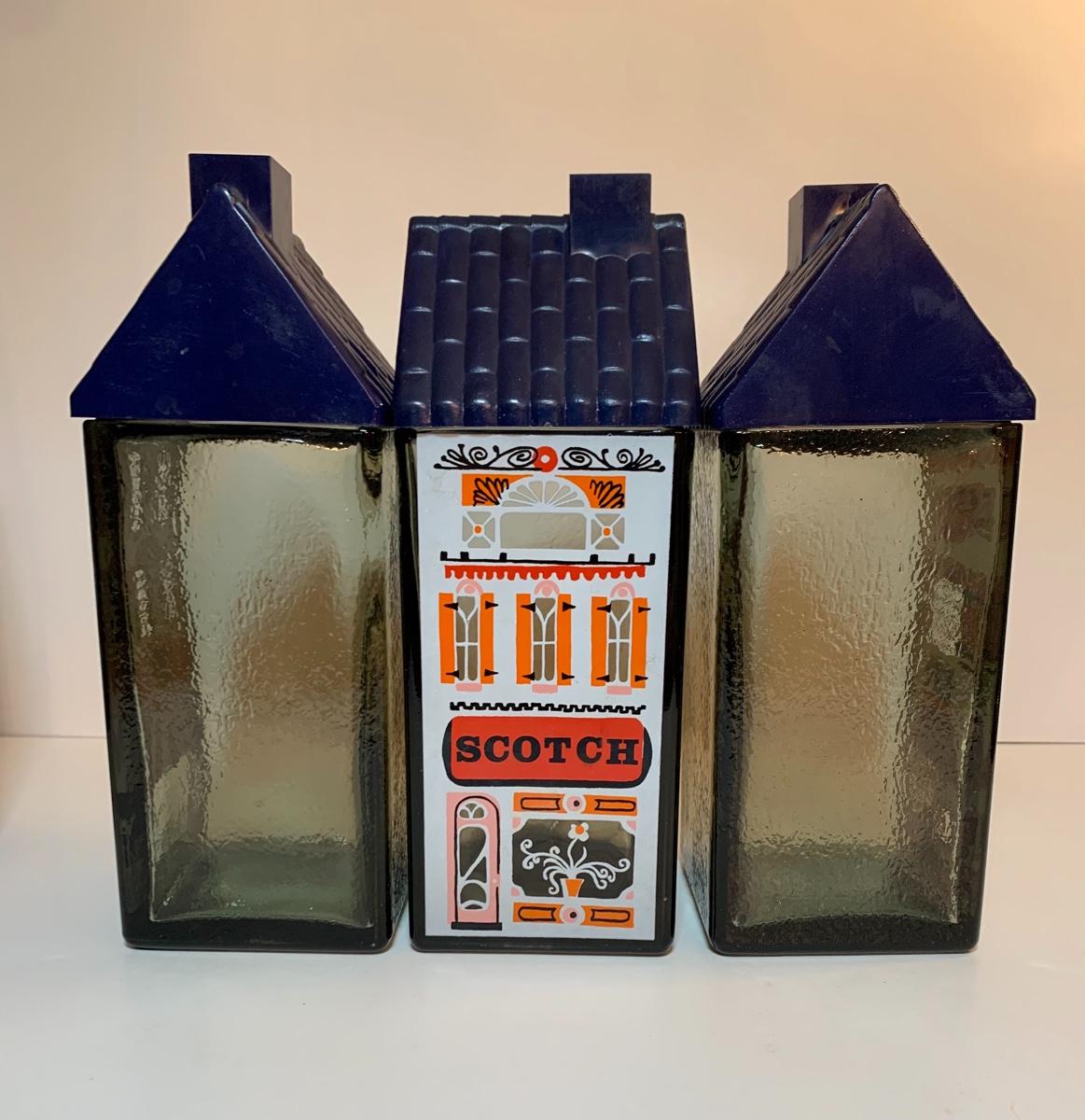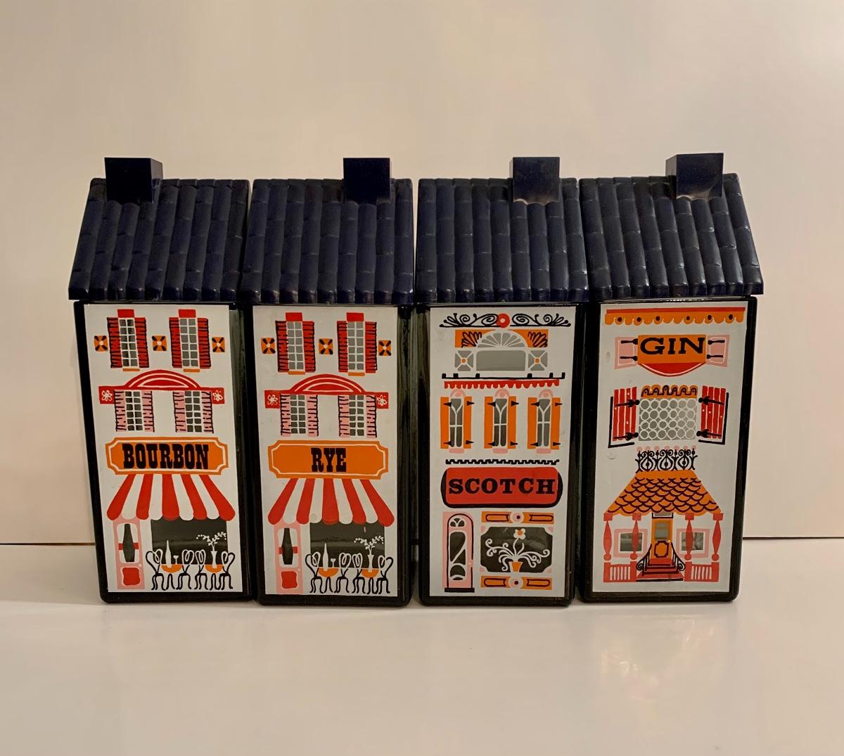 Designed to look like quaint row house shop fronts. This colorful has 4 bottle each with a unique design. Each bottle is square with large plastic lids that are shaped like roofs with chimney's. Bourbon, Rye, Scotch and Gin. No corks, can use wine corks if you want. Please see all pictures as they are the best representation of the items. The pictures show condition, measurements if taken, and what is included in the lot. Due to the large amount that we photograph and the time frame, we are not always able to take measurements. All items unless noted, are pre-owned and have been used. If you purchased furniture, you must bring help. We do not allow one person to carry large furniture out on their own. Bring help, tools and a truck for the safety of our client’s homes, and your personal safety. Company policy. Thank you.