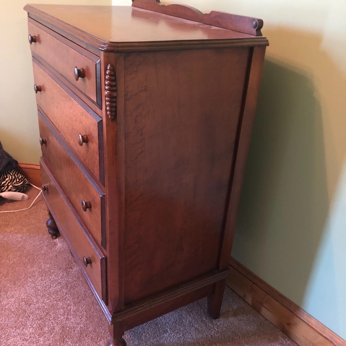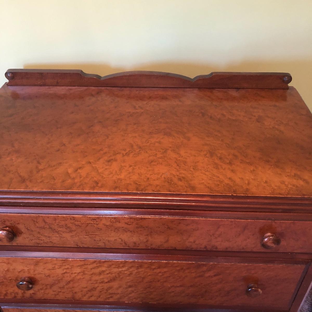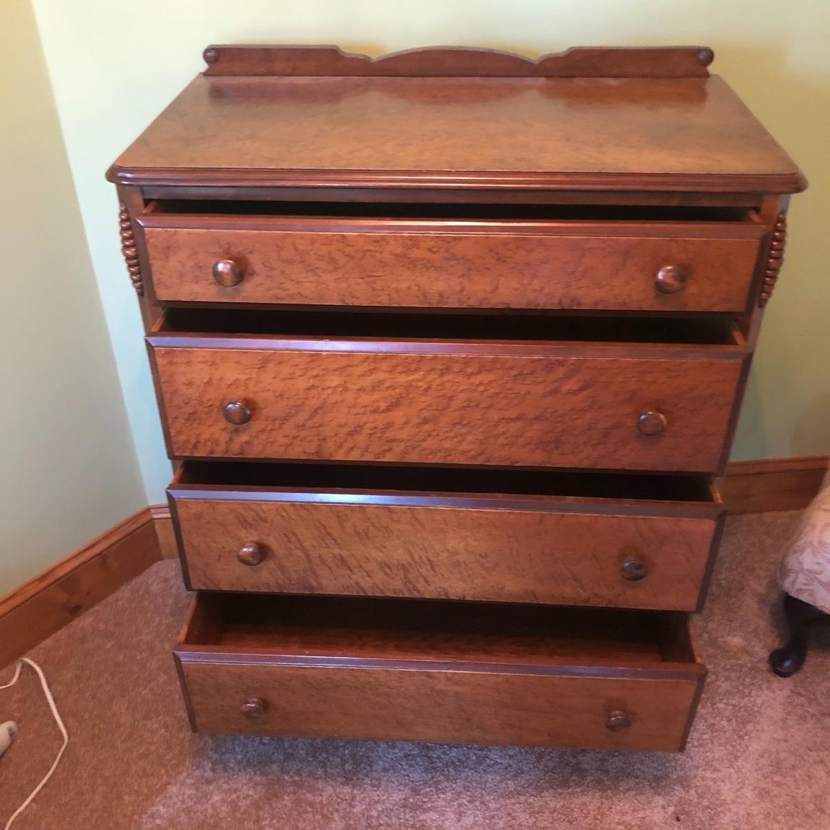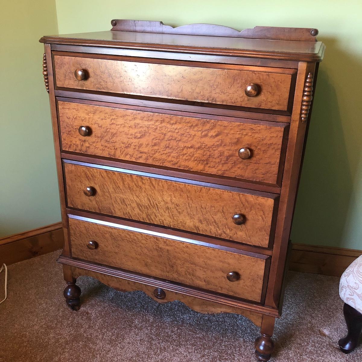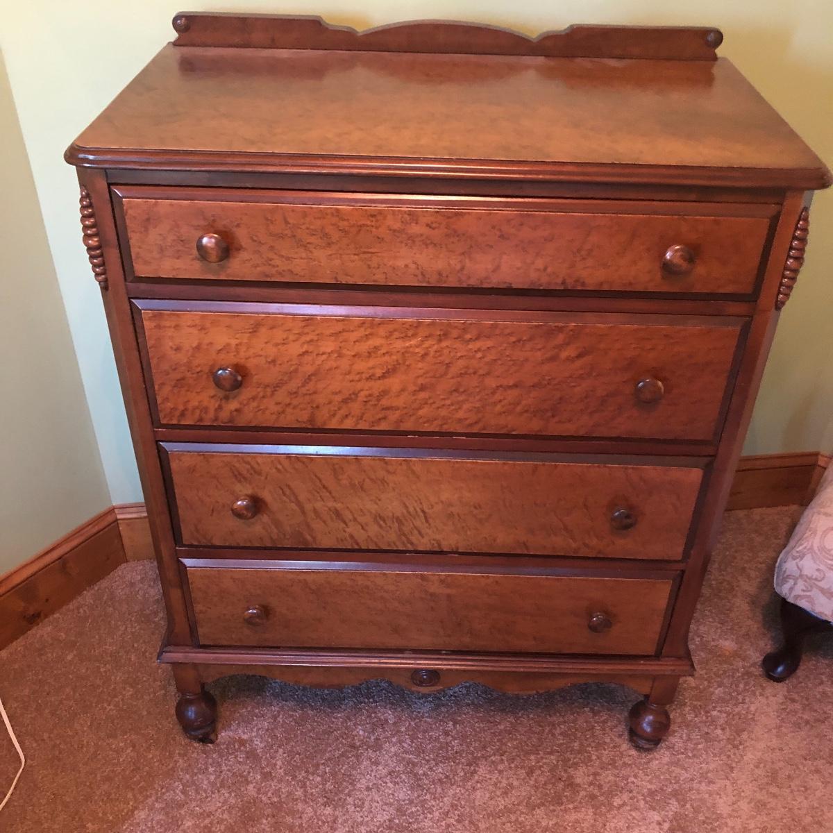 This gorgeous dresser has a matching vanity in Lot 326. This dresser has four dovetailed drawers with matching wood knobs and exquisitely turned legs sitting atop caster wheels. This is a beautifully crafted piece of solid wood furniture that measures 18” deep x 35” wide x 44” tall. There are some minor scuffs shown in images. Item is located upstairs, Please bring help to load.
