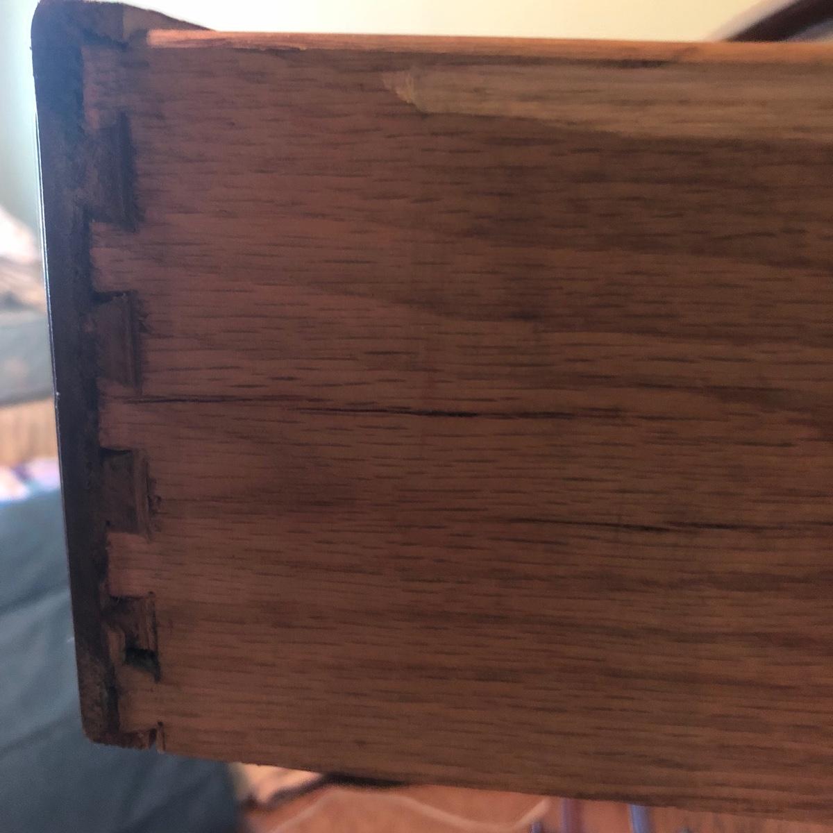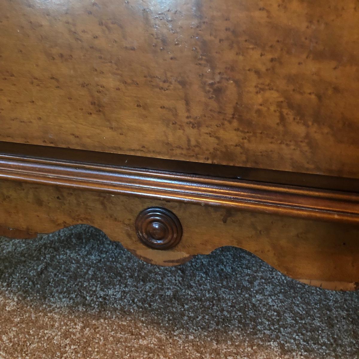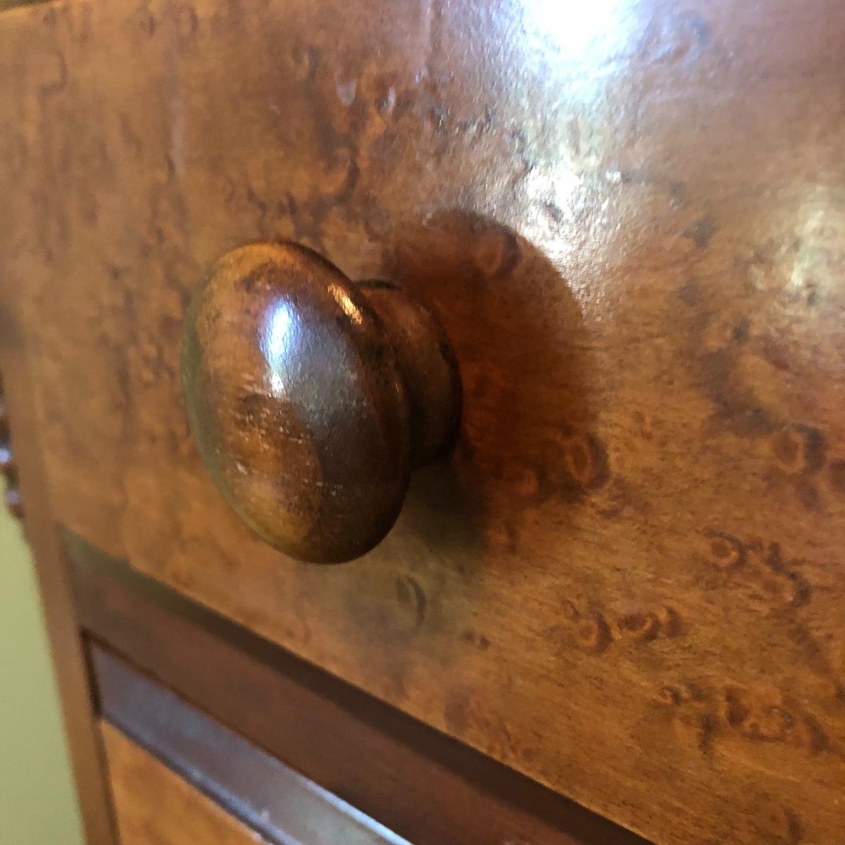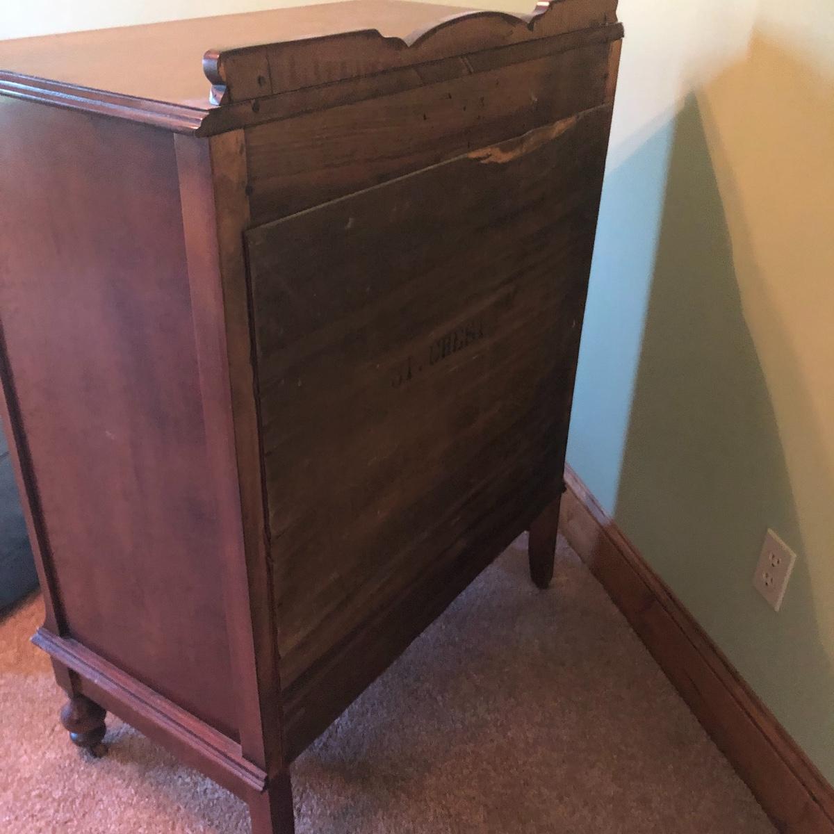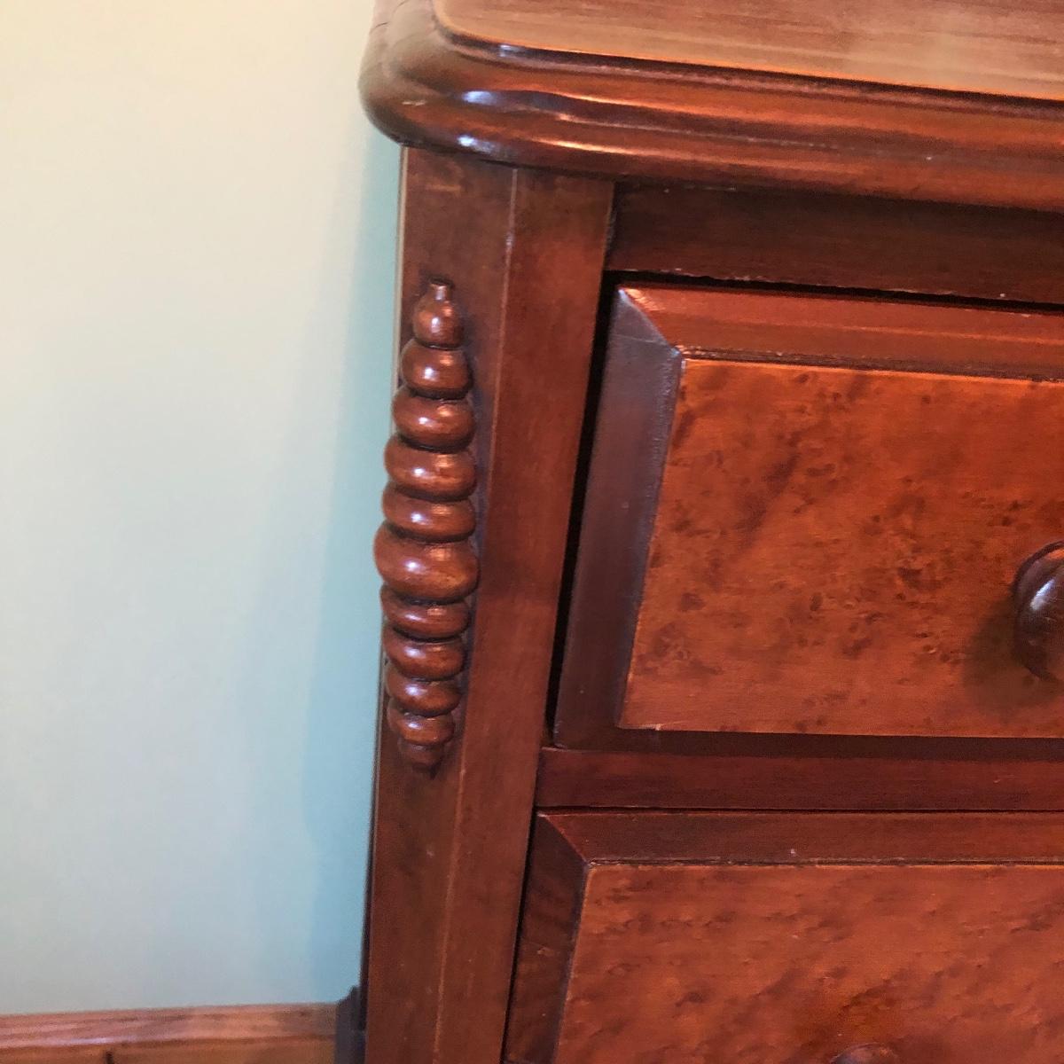This gorgeous dresser has a matching vanity in Lot 326. This dresser has four dovetailed drawers with matching wood knobs and exquisitely turned legs sitting atop caster wheels. This is a beautifully crafted piece of solid wood furniture that measures 18” deep x 35” wide x 44” tall. There are some minor scuffs shown in images. Item is located upstairs, Please bring help to load.