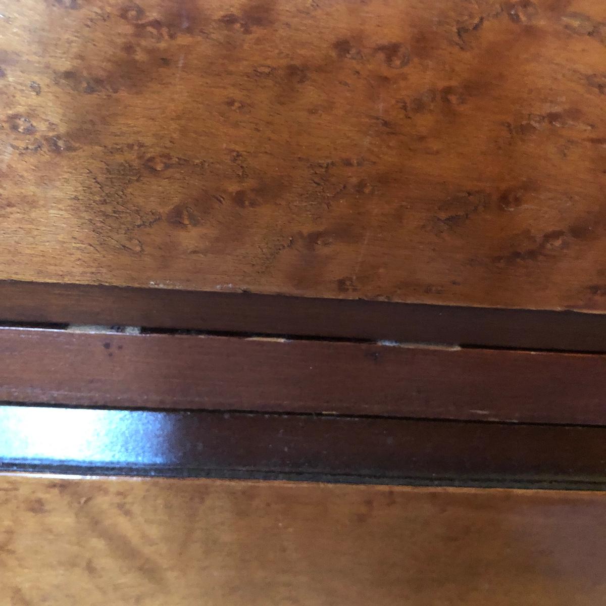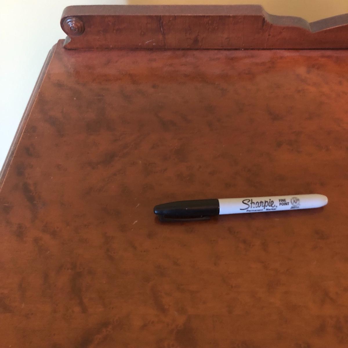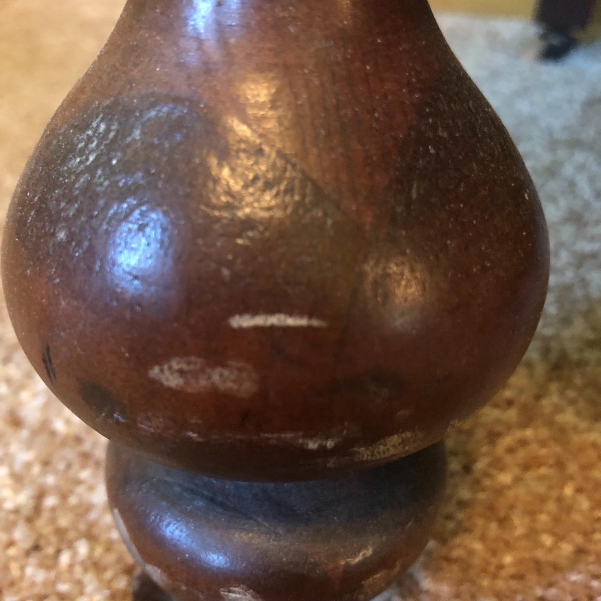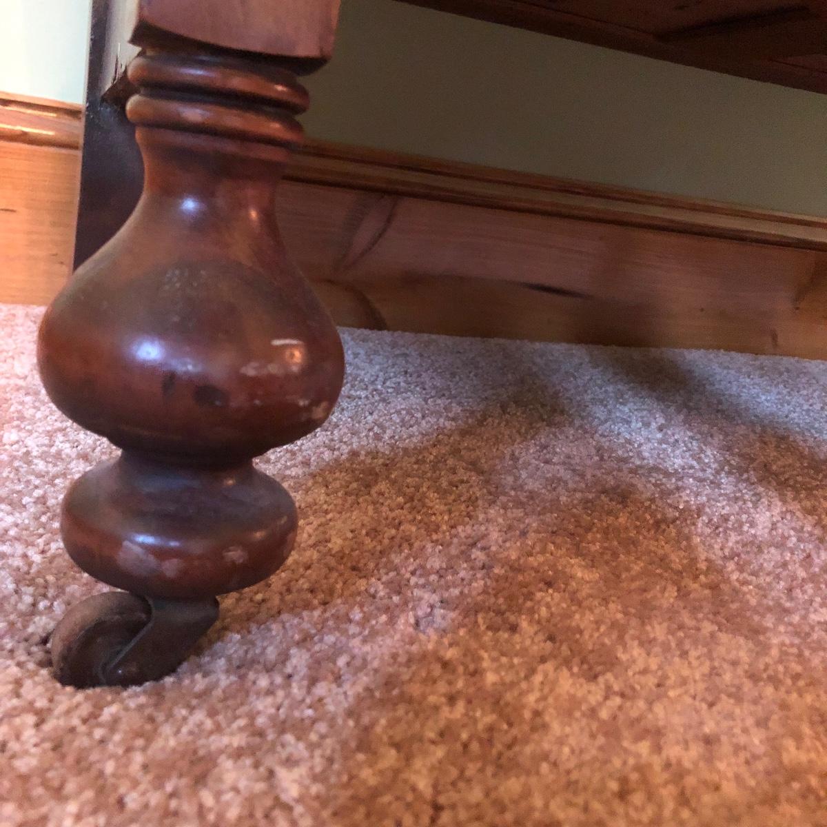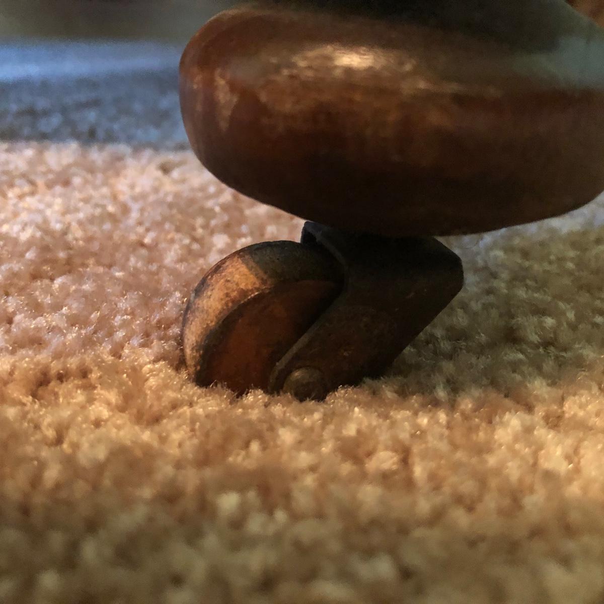 This gorgeous dresser has a matching vanity in Lot 326. This dresser has four dovetailed drawers with matching wood knobs and exquisitely turned legs sitting atop caster wheels. This is a beautifully crafted piece of solid wood furniture that measures 18” deep x 35” wide x 44” tall. There are some minor scuffs shown in images. Item is located upstairs, Please bring help to load.