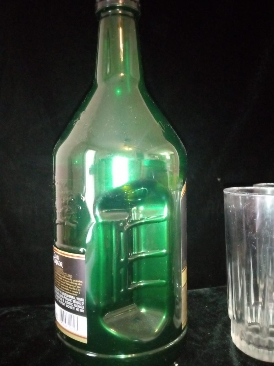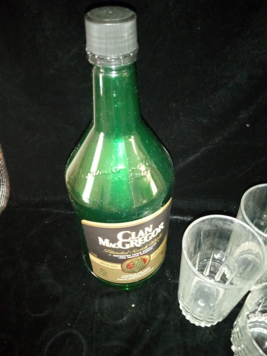 DRINKING GLASSES AND PARTIAL BOTTLE OF SCOTCH