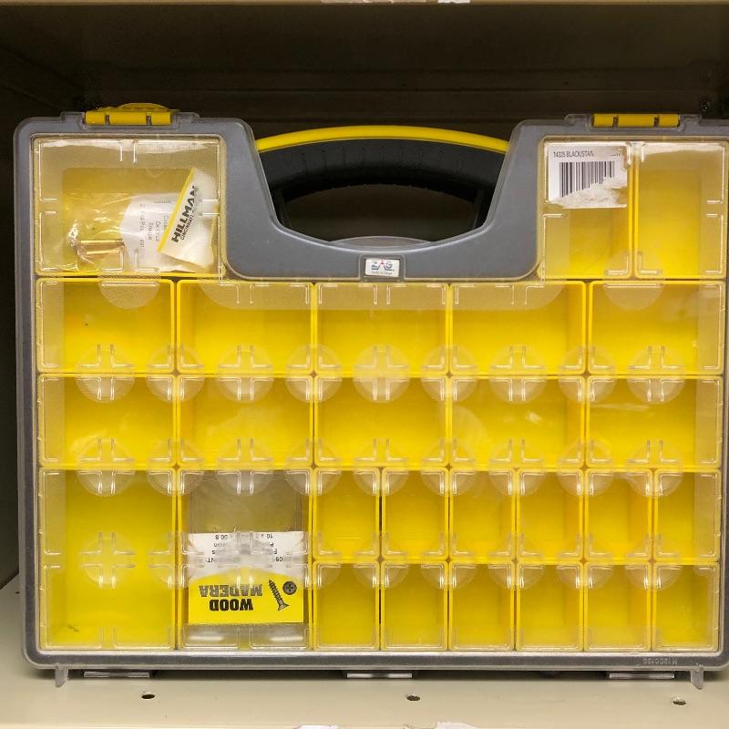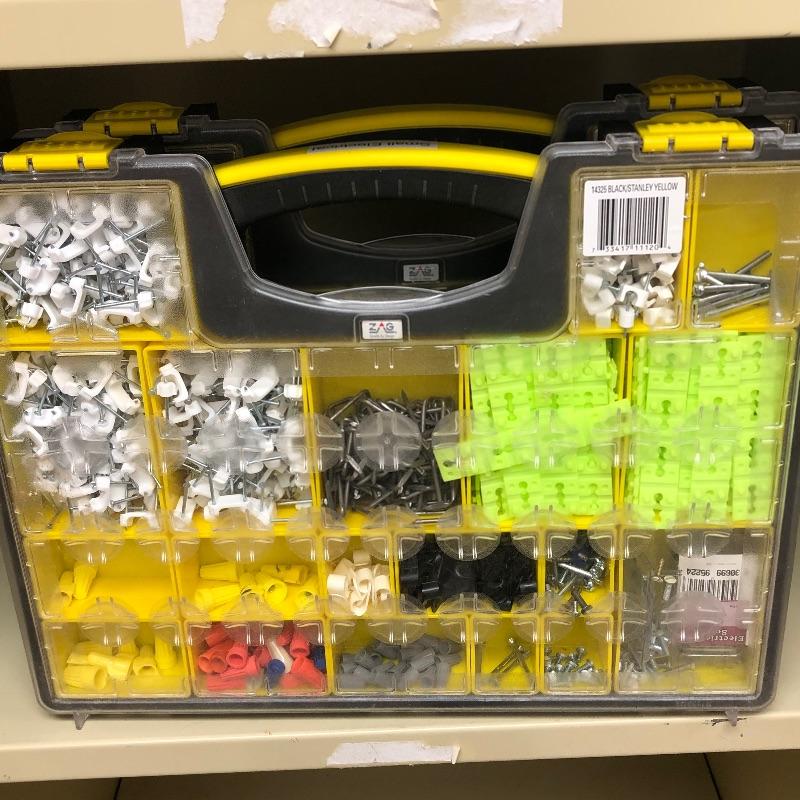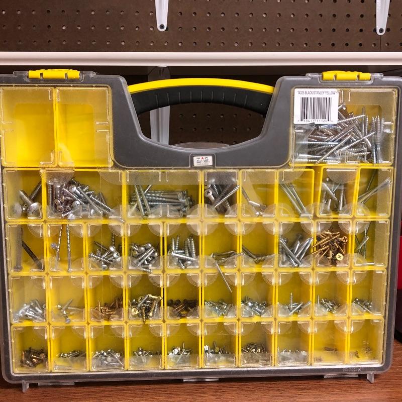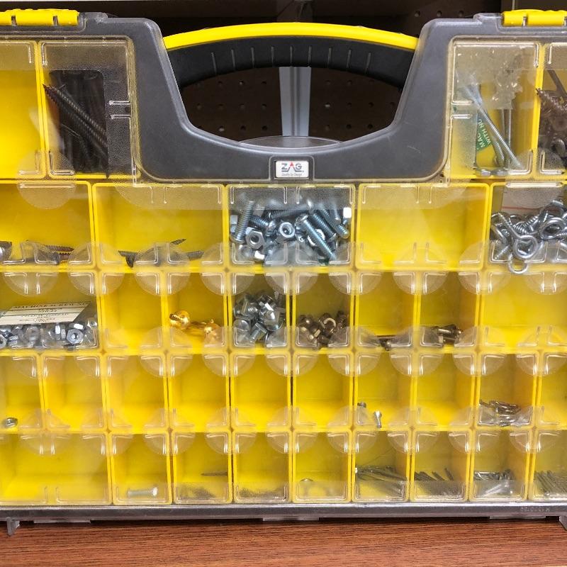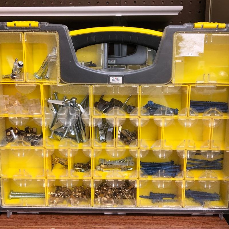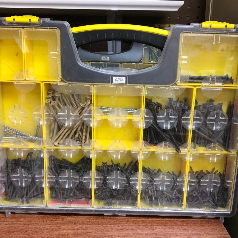 12 Sturdy hardware cases full of drywall screws, wood screws, wall mounting hardware, nails, washers and more. Super Organized! Shipping available.