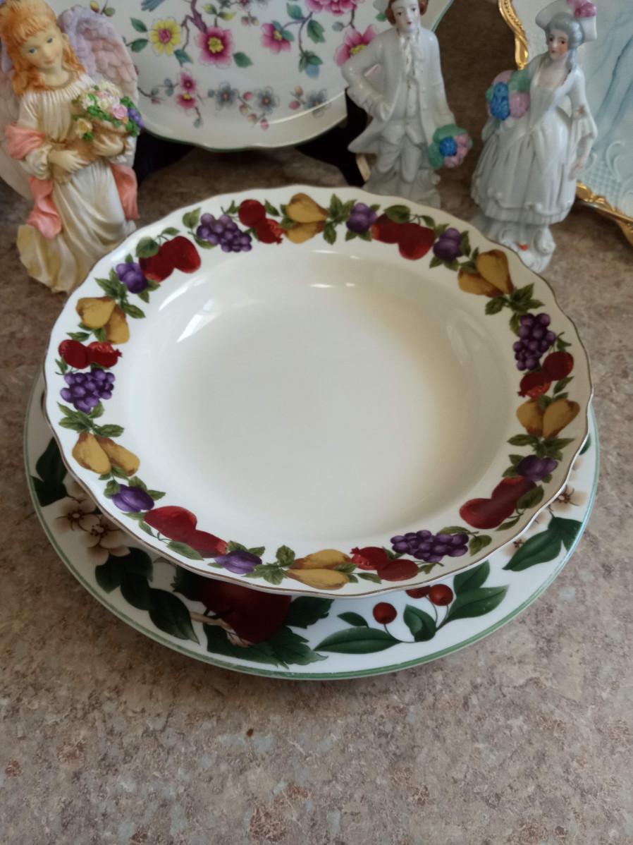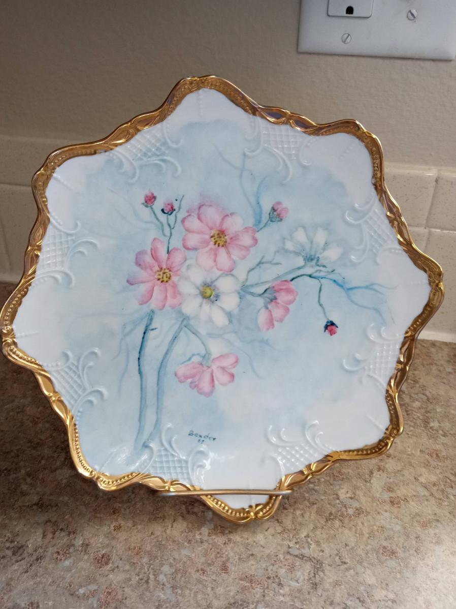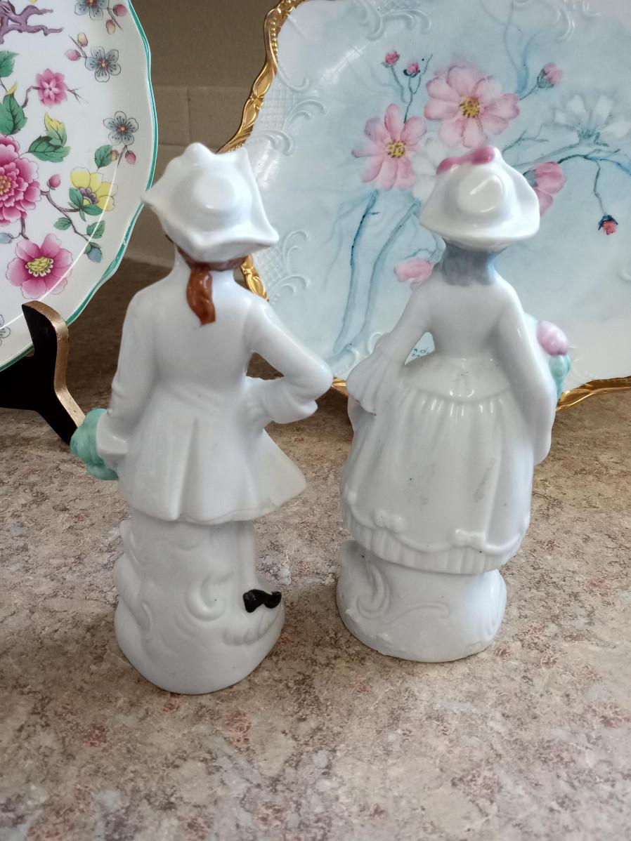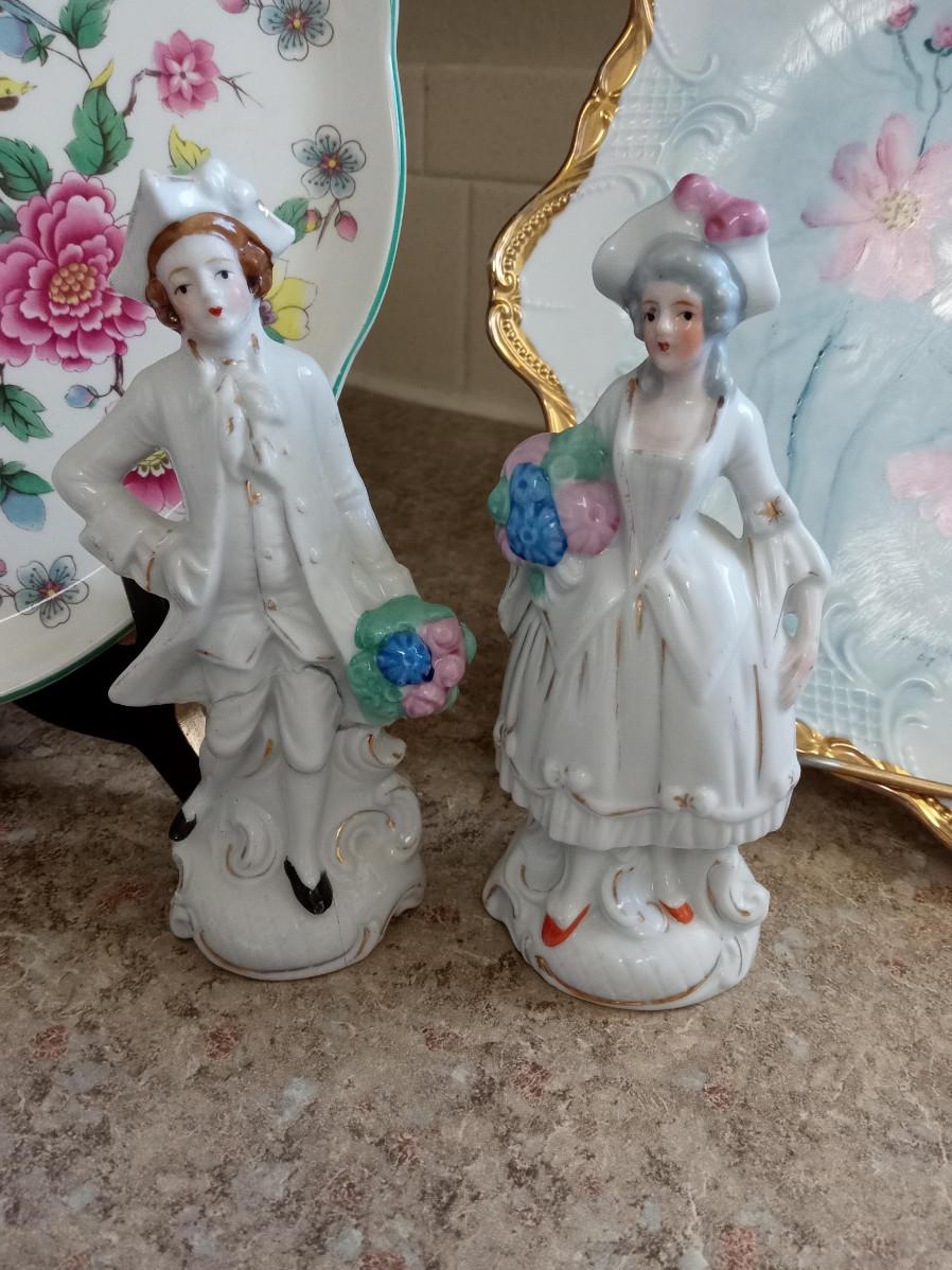 MUSICAL ANGEL, 2 VICTORIAN PORCELAIN FIGURINES MARKED JAPAN, 2 SMALLER ANGELS, HAND PAINTED PLATE AND 2 OTHER DECORATIVE PLATES