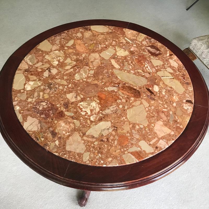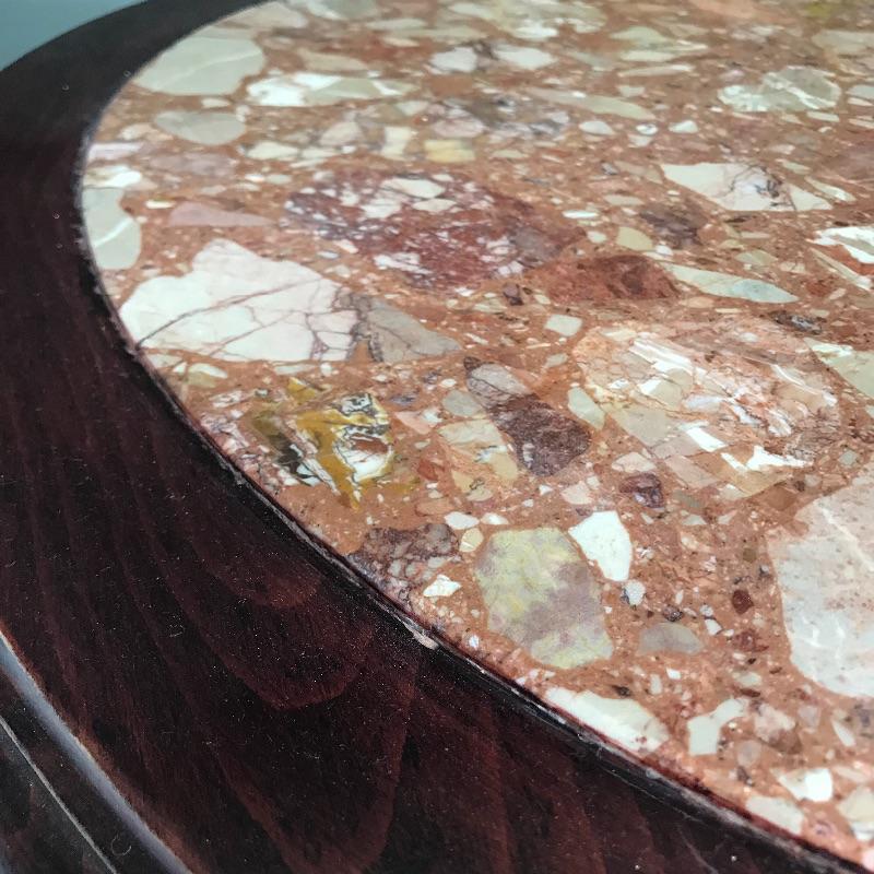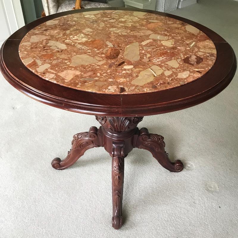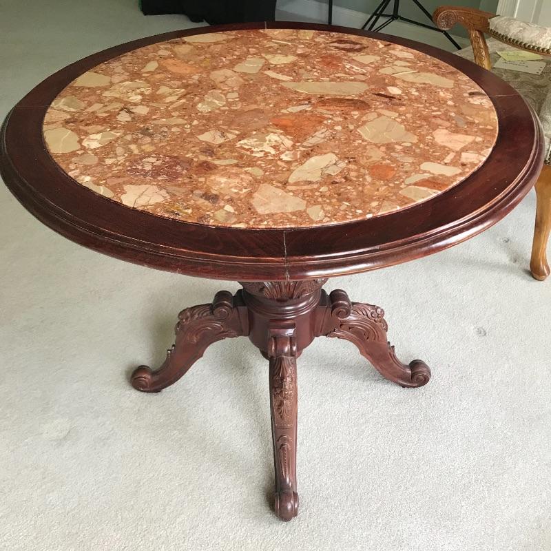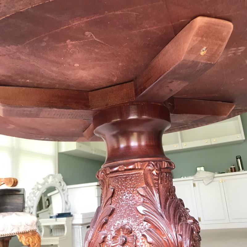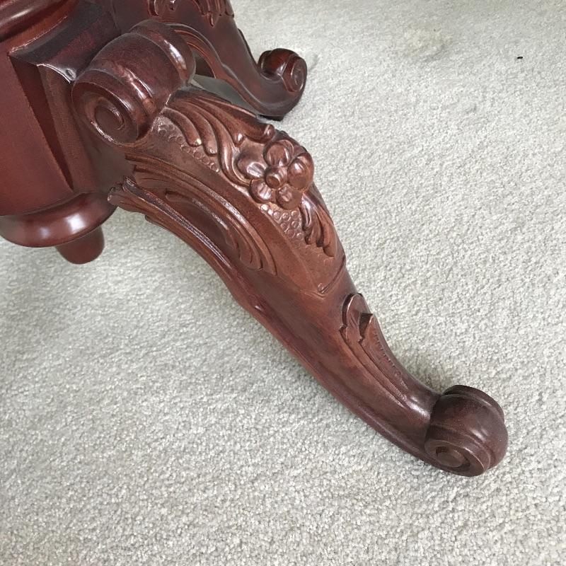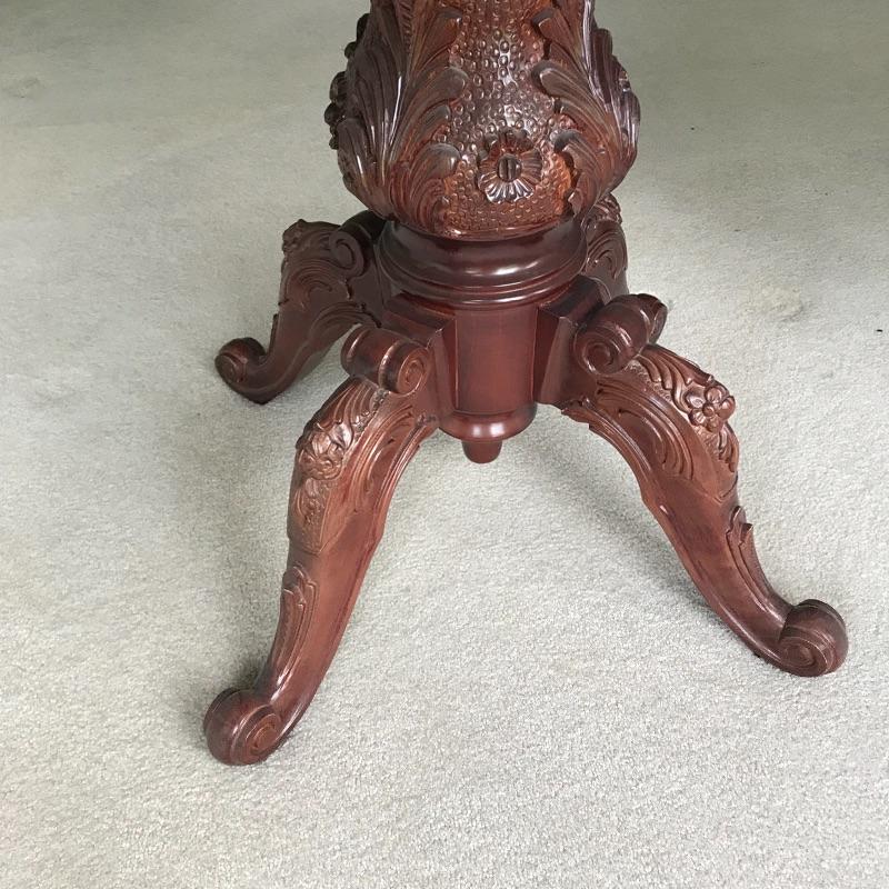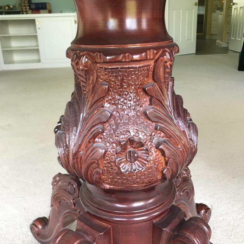 This regal round table would be a perfect accent piece in your study or bedroom. Base is intricately carved with a warm rosewood finish. Piece is heavy and approx. 36” in diameter and 30” tall. See pics. Local pickup only.